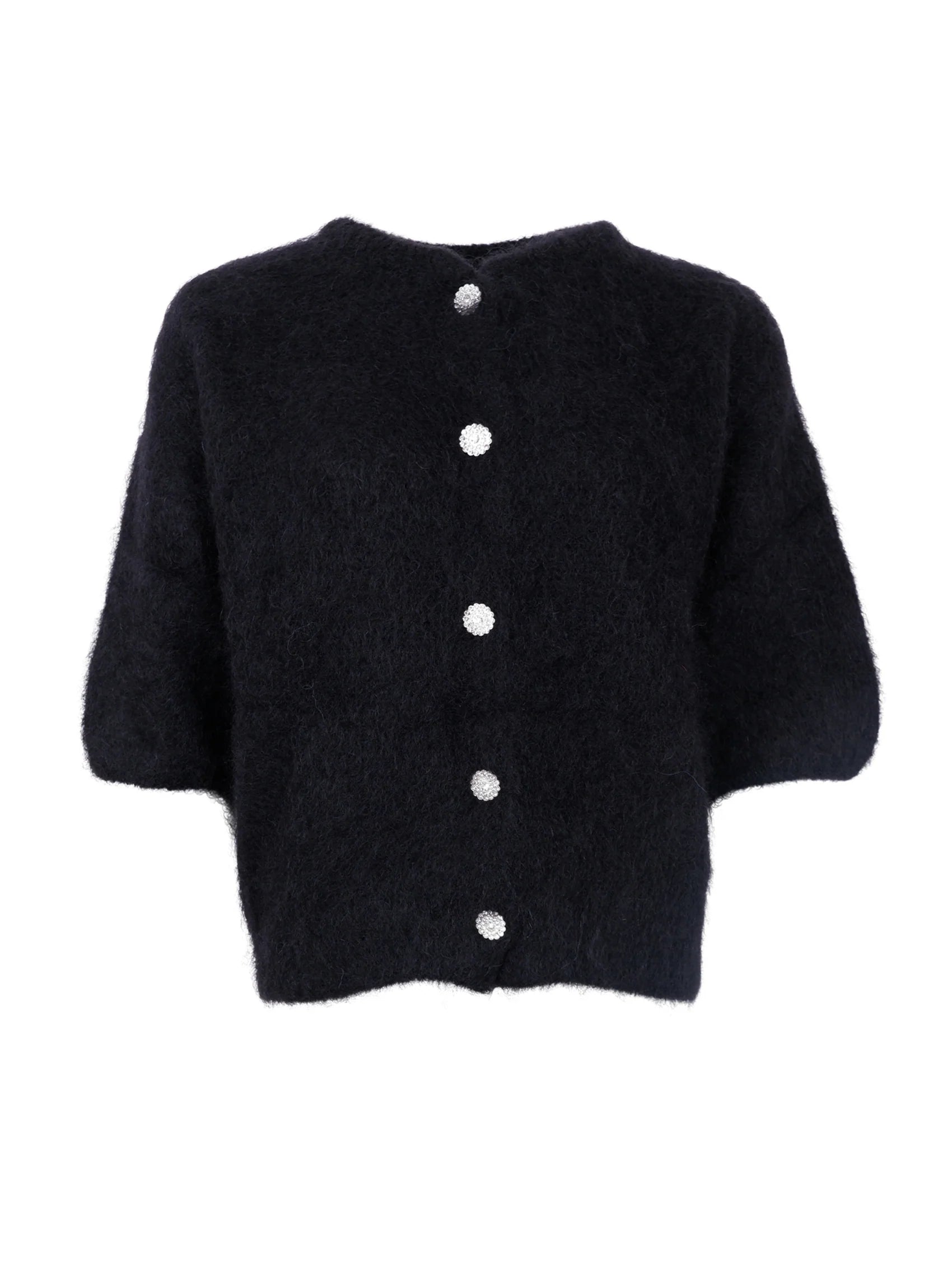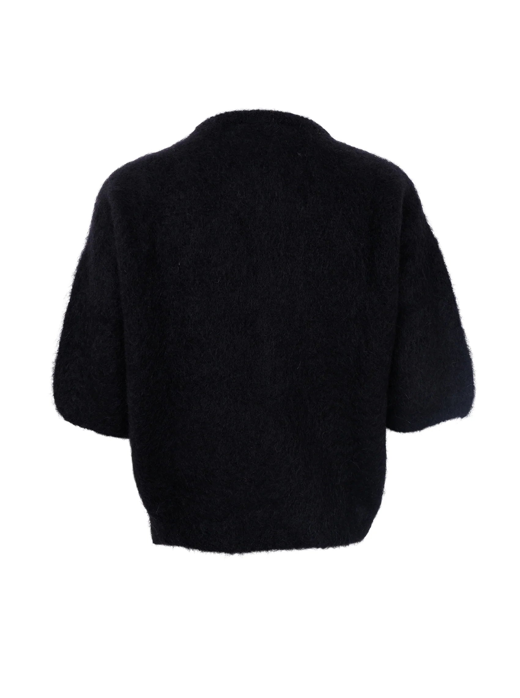 Dásamlega falleg og flott stuttermapeysa frá danska merkinu Black Colour. Hún er hneppt, laus í sniði og með rúnuðu hálsmáli. Einstaklega fallegar tölur, sem gera hana extra sparilega.
