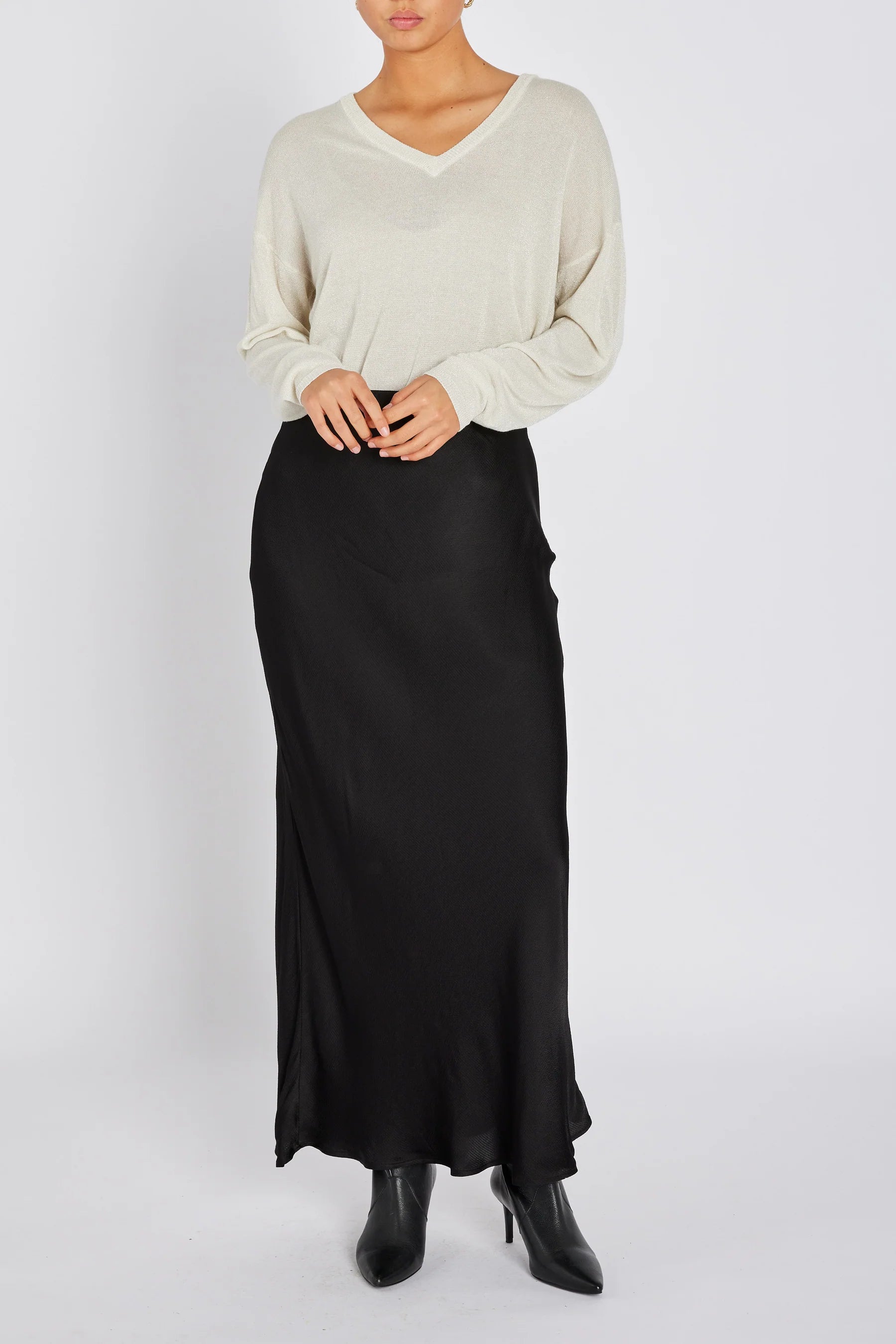 Æðisleg, þunn v-hálsmáls peysa frá danska merkinu Bruuns Bazaar. Hún er laus í sniði, með síðum ermum og virkilega létt, mjúk og þægileg. Glimmer er í henni sem gera hana extra sparilega. Kemur einnig í svörtu