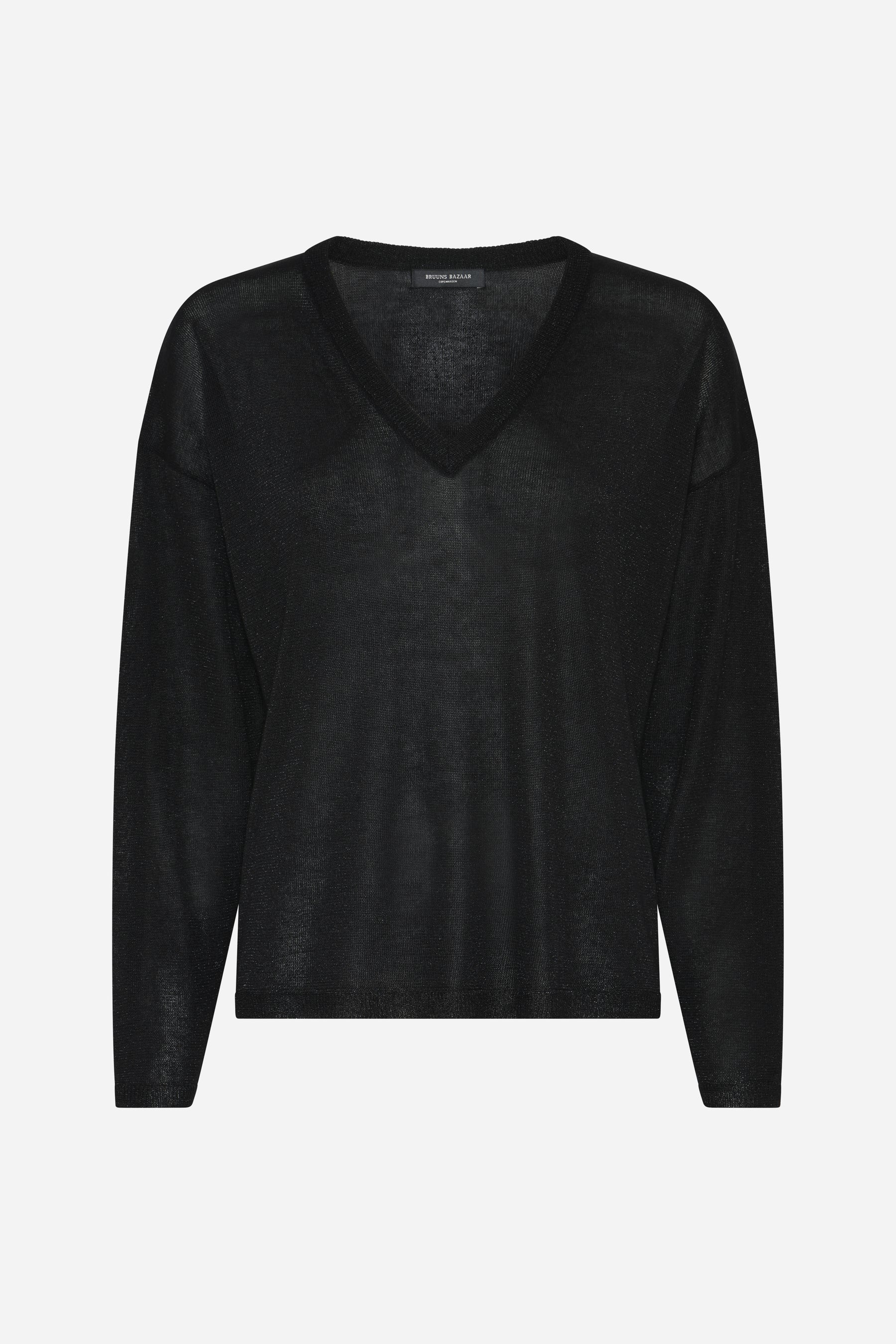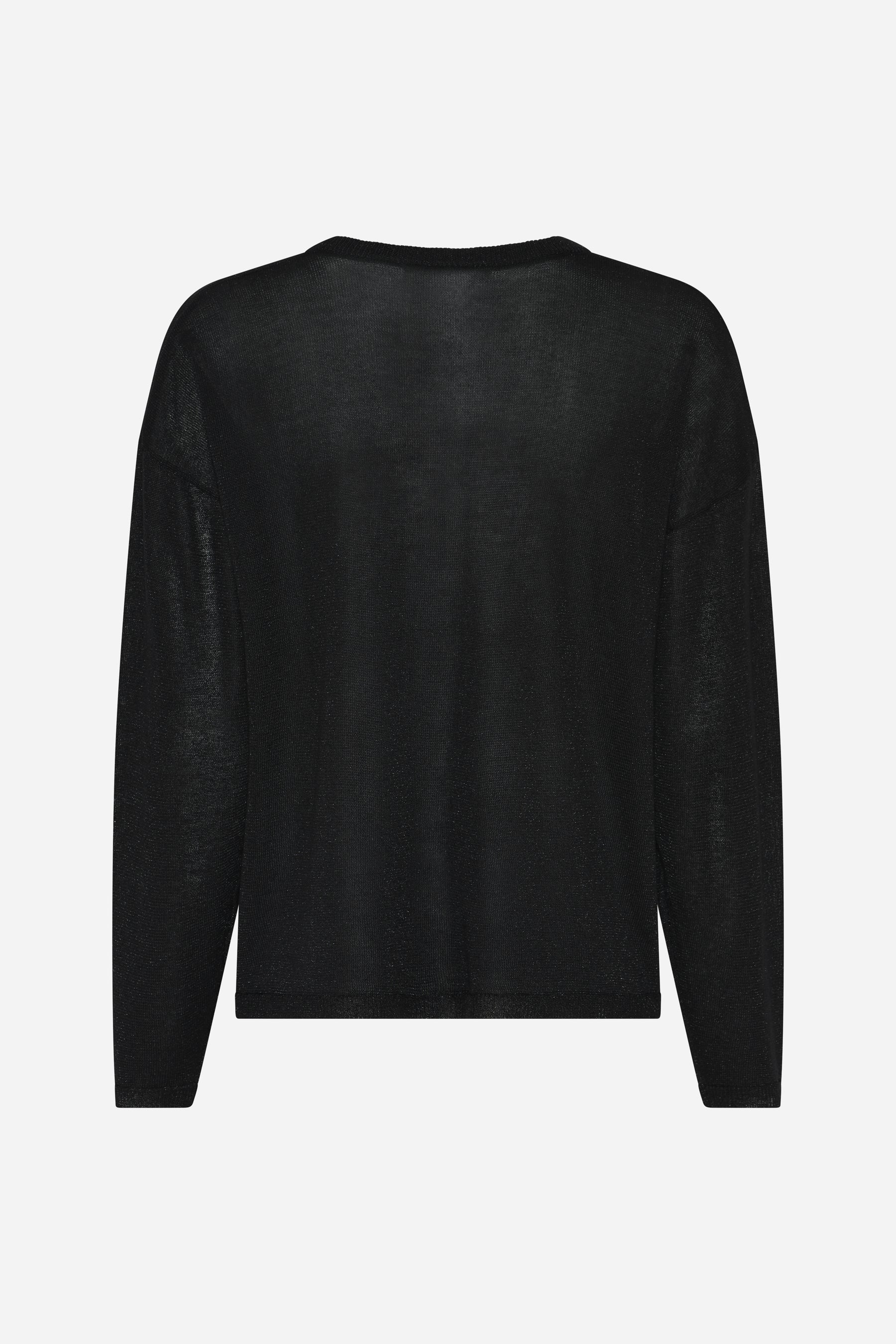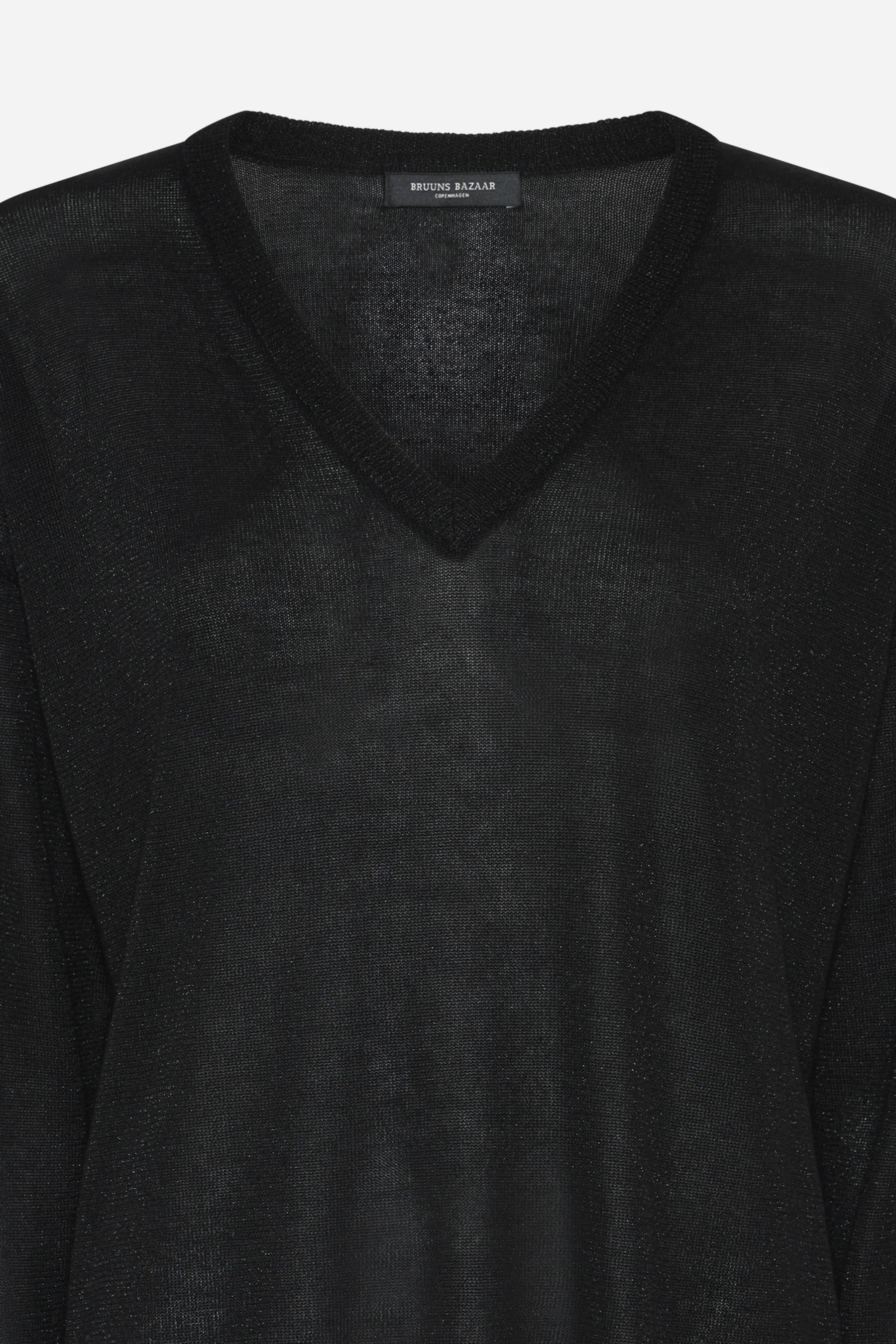 Æðisleg, þunn v-hálsmáls peysa frá danska merkinu Bruuns Bazaar. Hún er laus í sniði, með síðum ermum og virkilega létt, mjúk og þægileg. Glimmer er í henni sem gera hana extra sparilega. Kemur einnig í ljósu