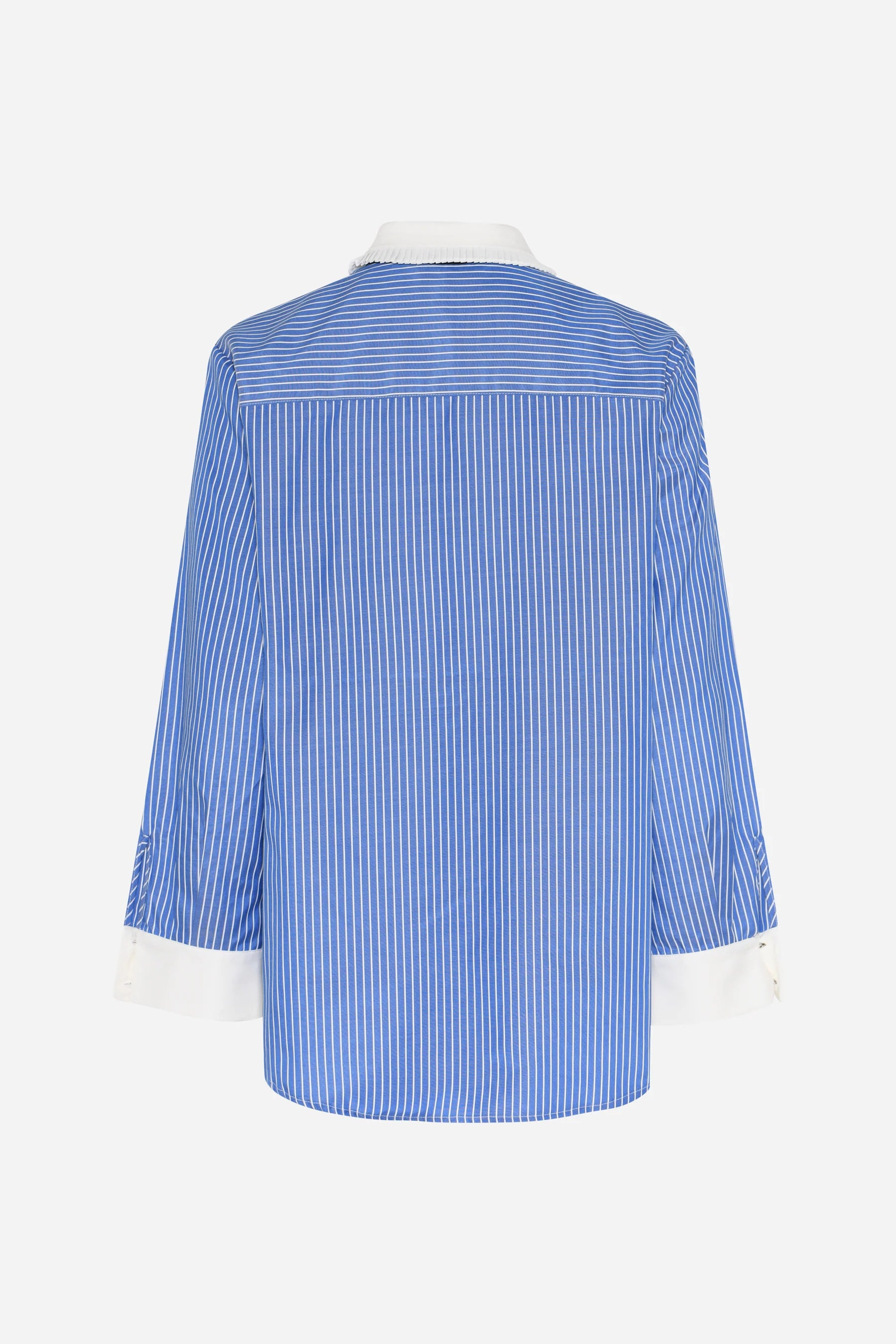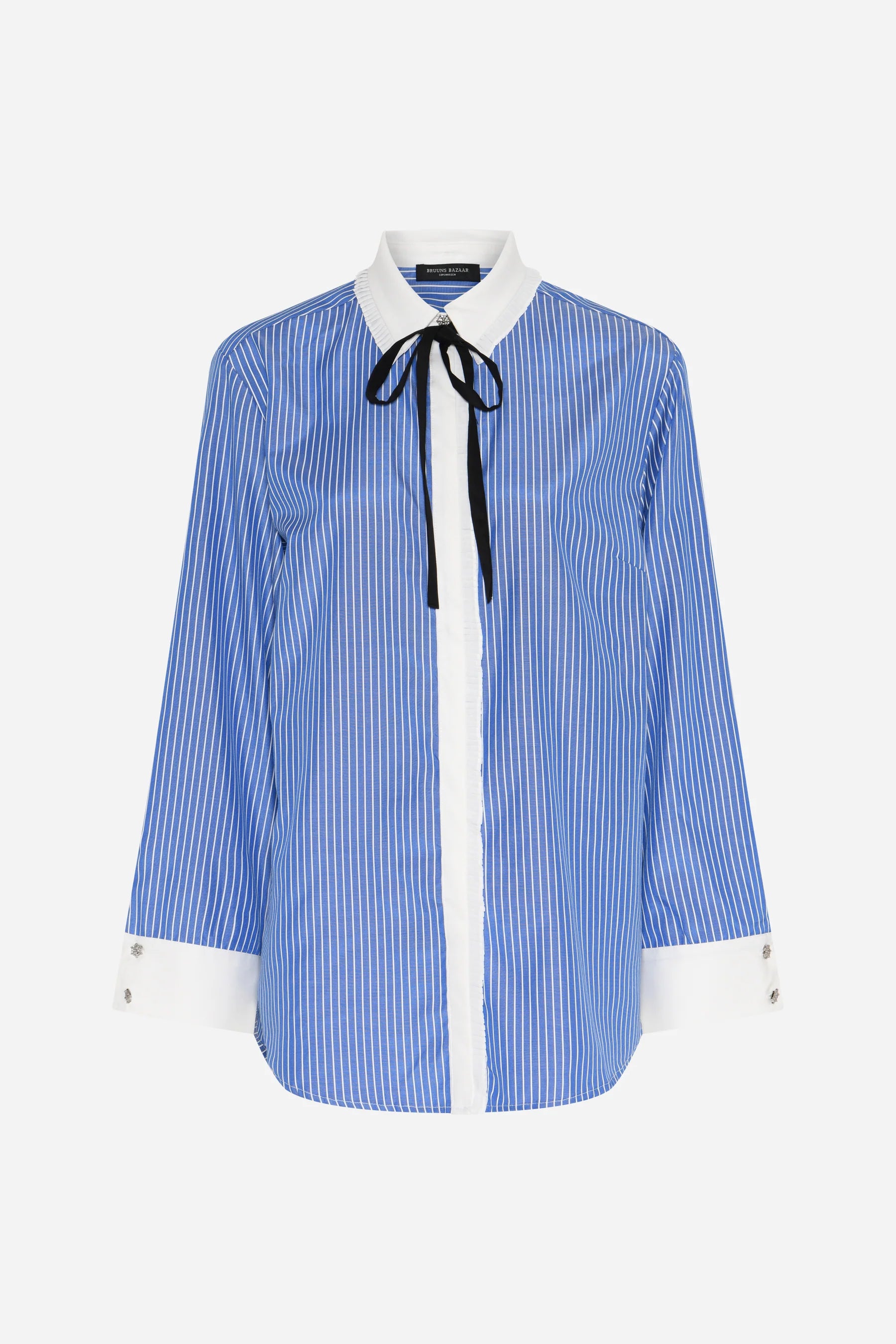 Þessi er æðisleg. Elegant og falleg skyrta frá danska merkinu Bruuns Bazaar. Hún er hneppt alla leið, með skyrtukraga og bein í sniði. Falleg og sparileg tala efst uppi og með svörtu bandi í hálsmáli sem flott er að binda, hafa lausa en einnig hægt að fjarlægja.