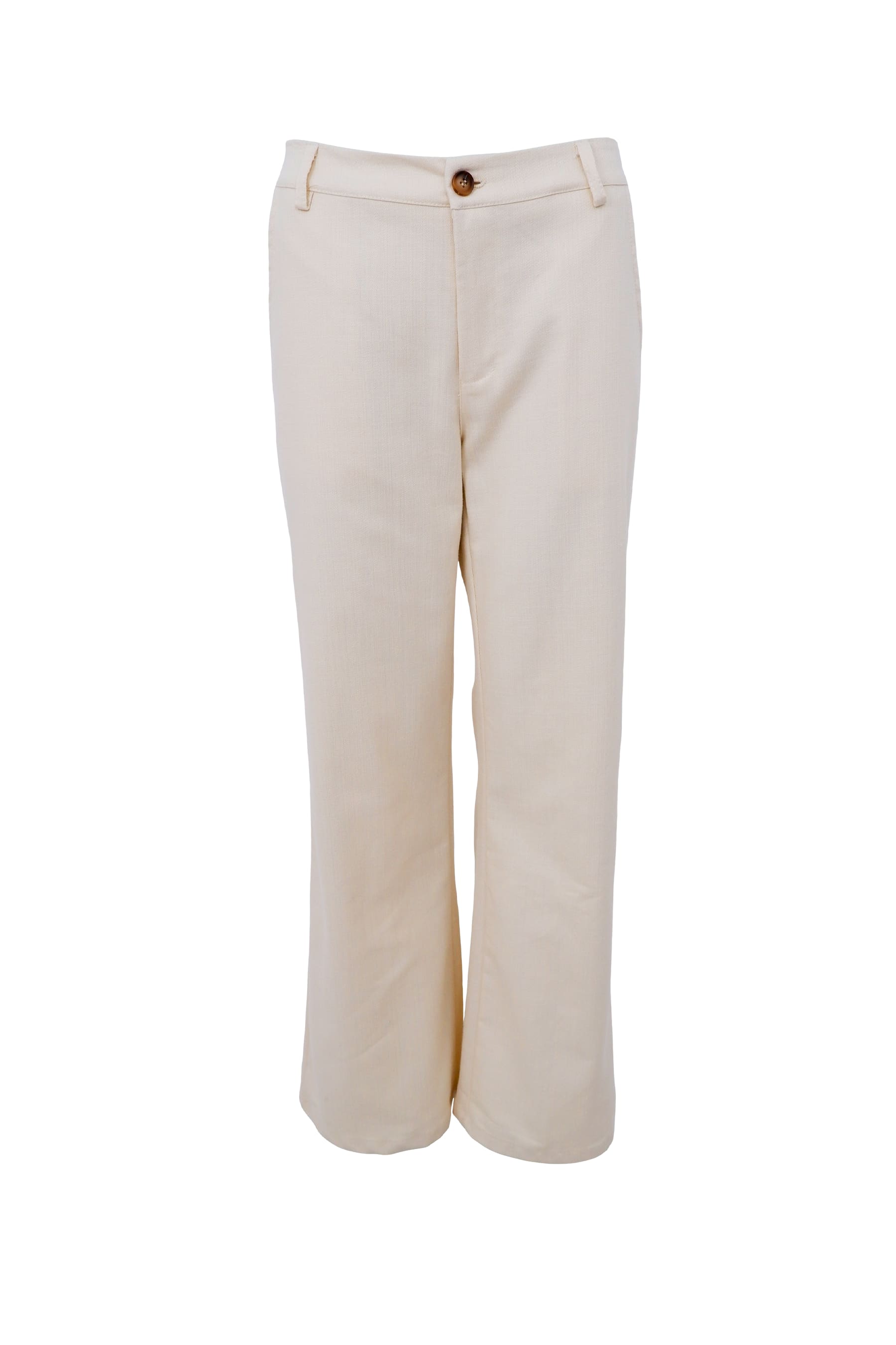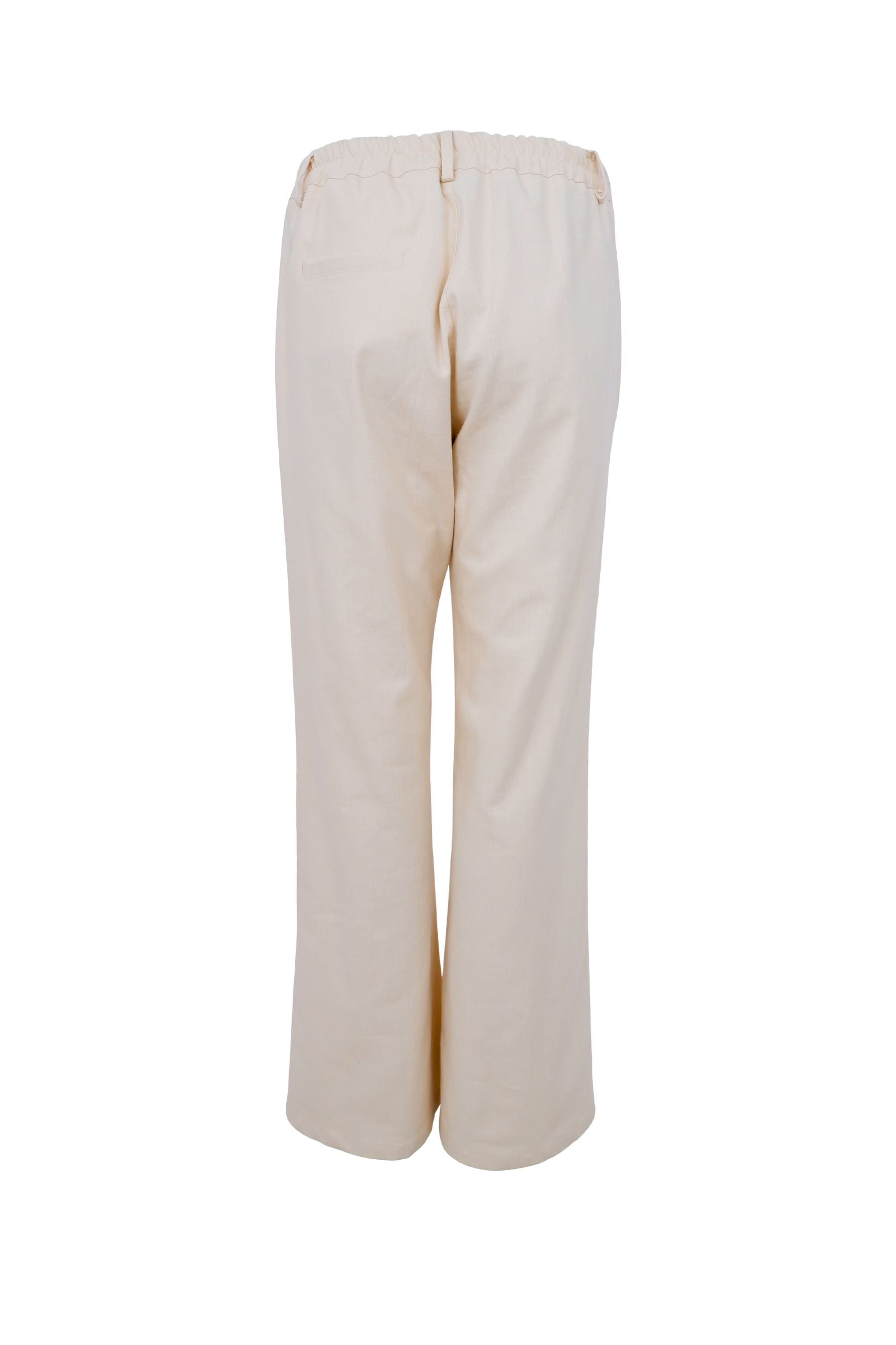 Hnepptar að framan en svo er teygja í bakið. Sniðið er aðeins vítt og örlítið útvíðar skálmar. Mikil og góð teygja er í buxunum sem gerir þær einstaklega þægilegar