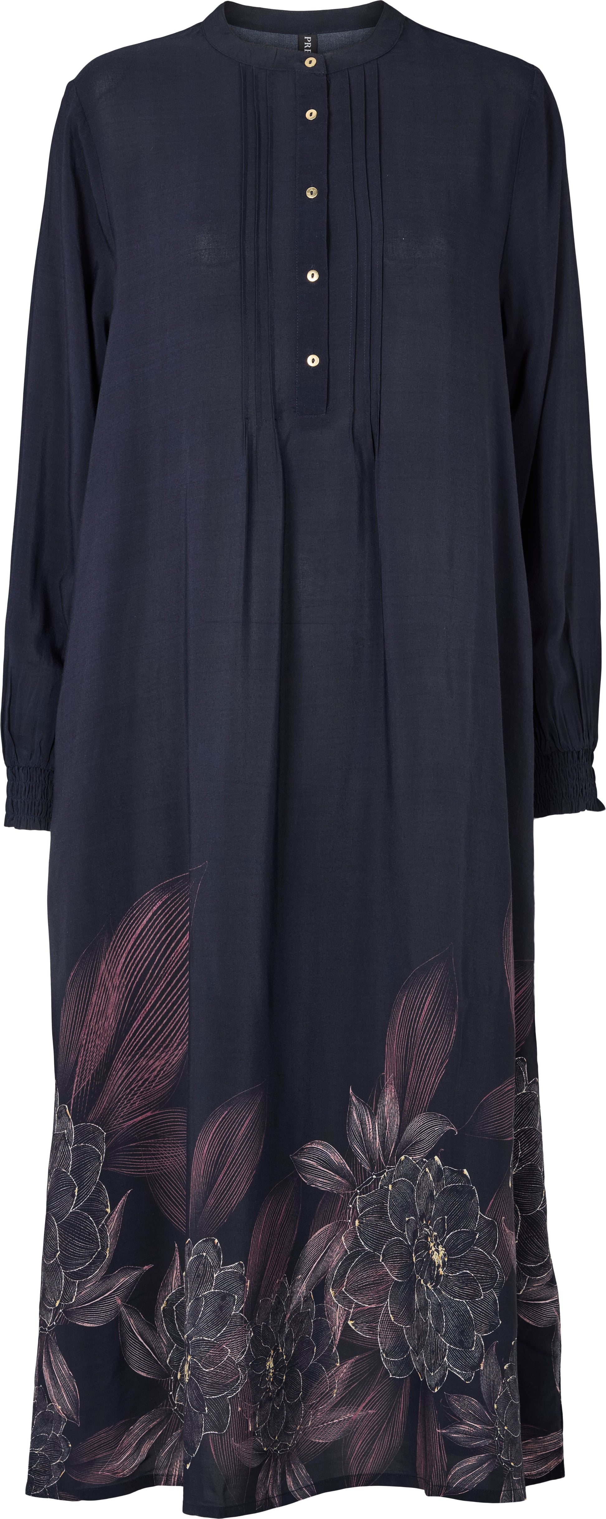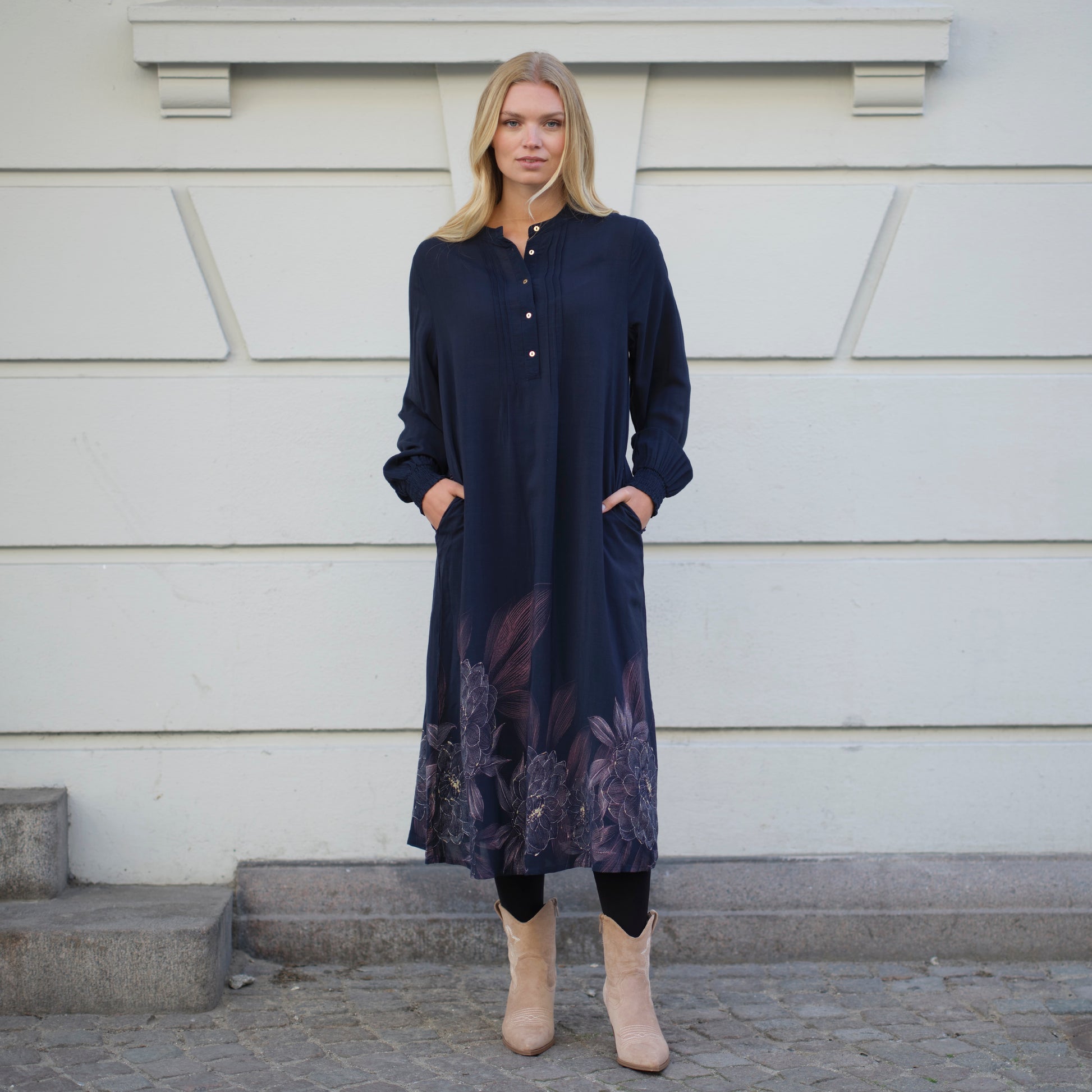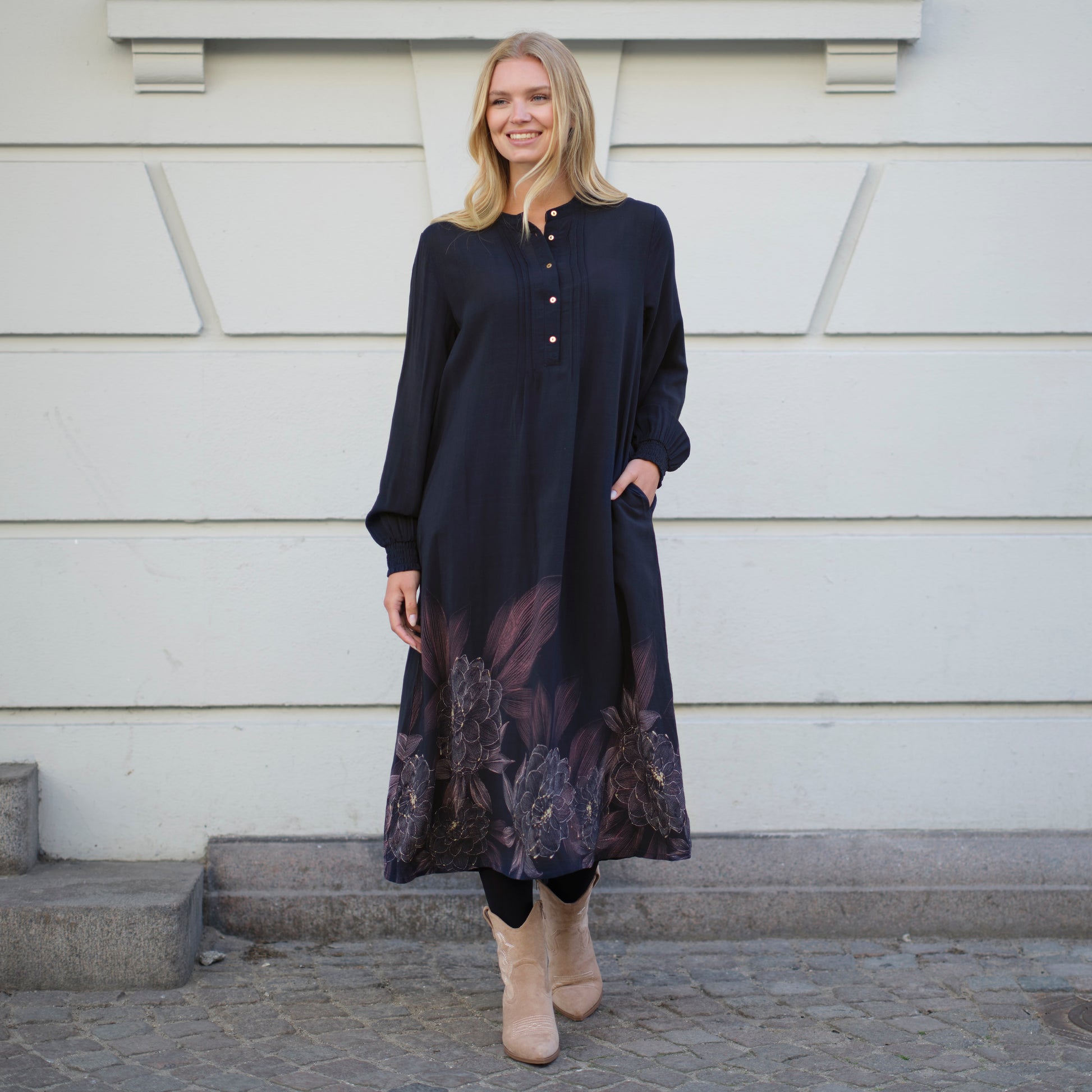 Hann er beinn en laus í sniði. Hnepptur hálfa leið niður með lágum kraga. Það er teygjustroff á ermum og auðvitað vasar á kjólnum. Þetta snið er eitt af vinsælli kjólasniðunum frá Prepair. Liturinn á kjólnum heitir blue/black ...svo hann er í mjög dökkum bláum lit