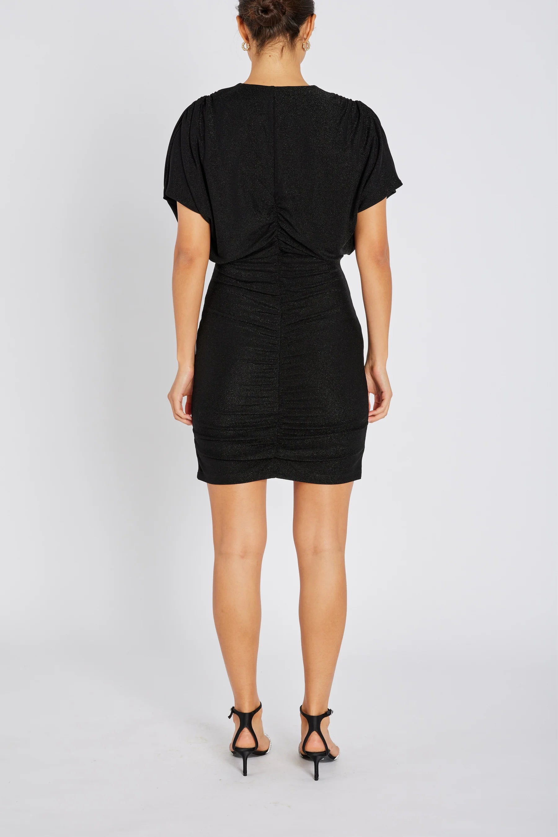 Vá! Elegant og fallegur kjóll frá danska merkinu Bruuns Bazaar. Hann er með v-hálsmáli, glimmer þráðum í, laus að ofan, þröngur að neðan en tekinn saman í miðjunni að framan og aftan. Teygjanlegur og þægilegur. Fullkominn fyrir jólin, partýið og allar veislurnar sem eru framundan.