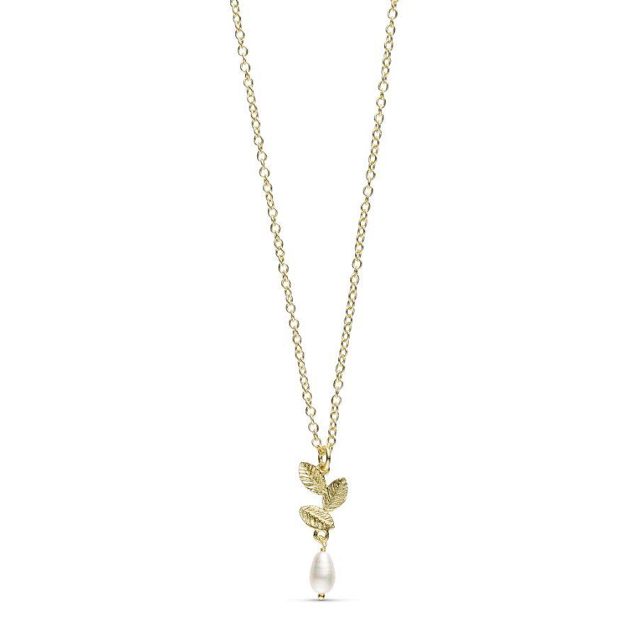 Virkilega fallegt hálsmen með dahlia laufum og ferskvatnsperlu frá danska merkinu Pure by Nat. Það er 42 cm + framlenging. Kemur einnig í silfur