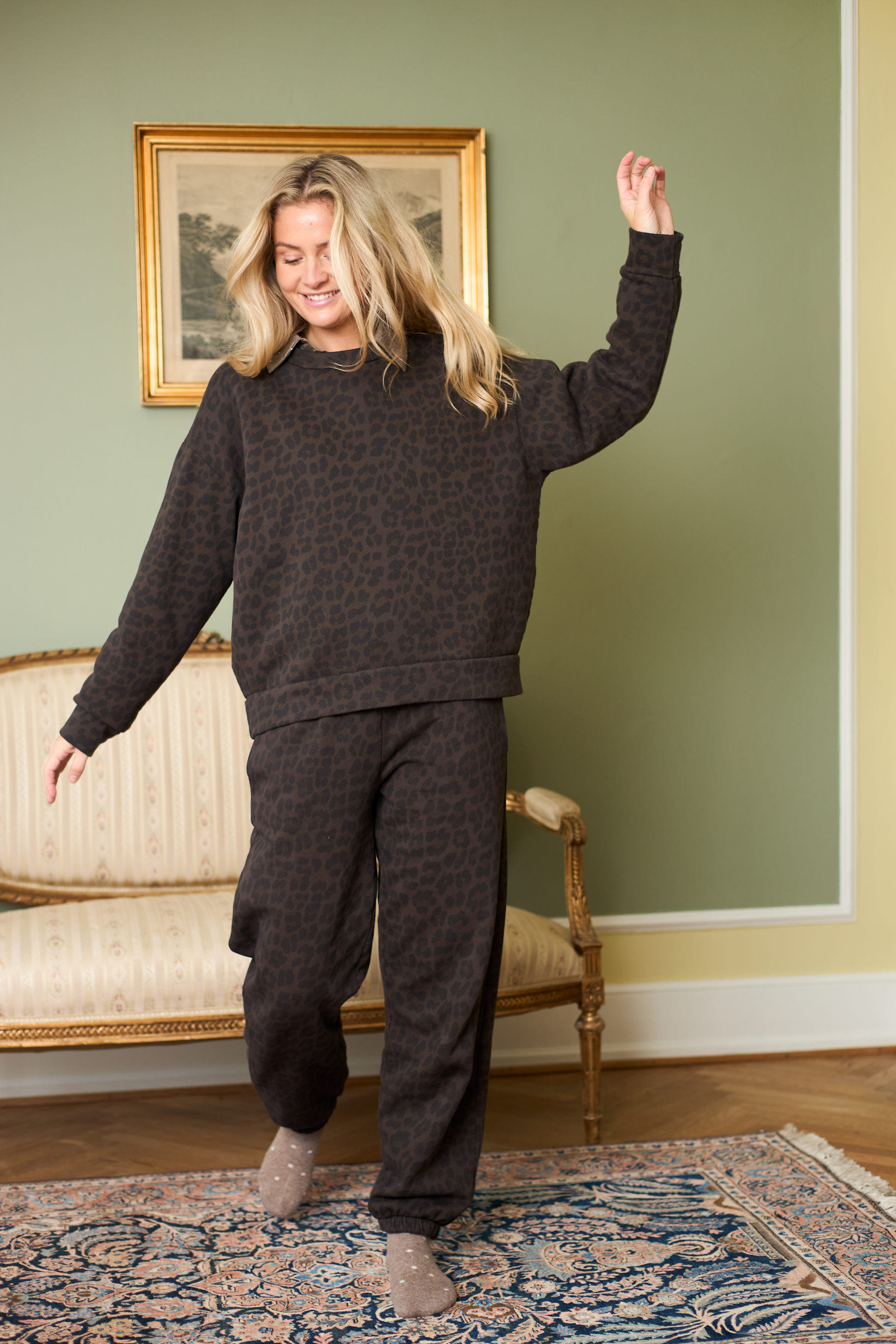 Einnig koma buxur í stíl til að fullkomna dressið sem er með dökku hlébarðamynstri