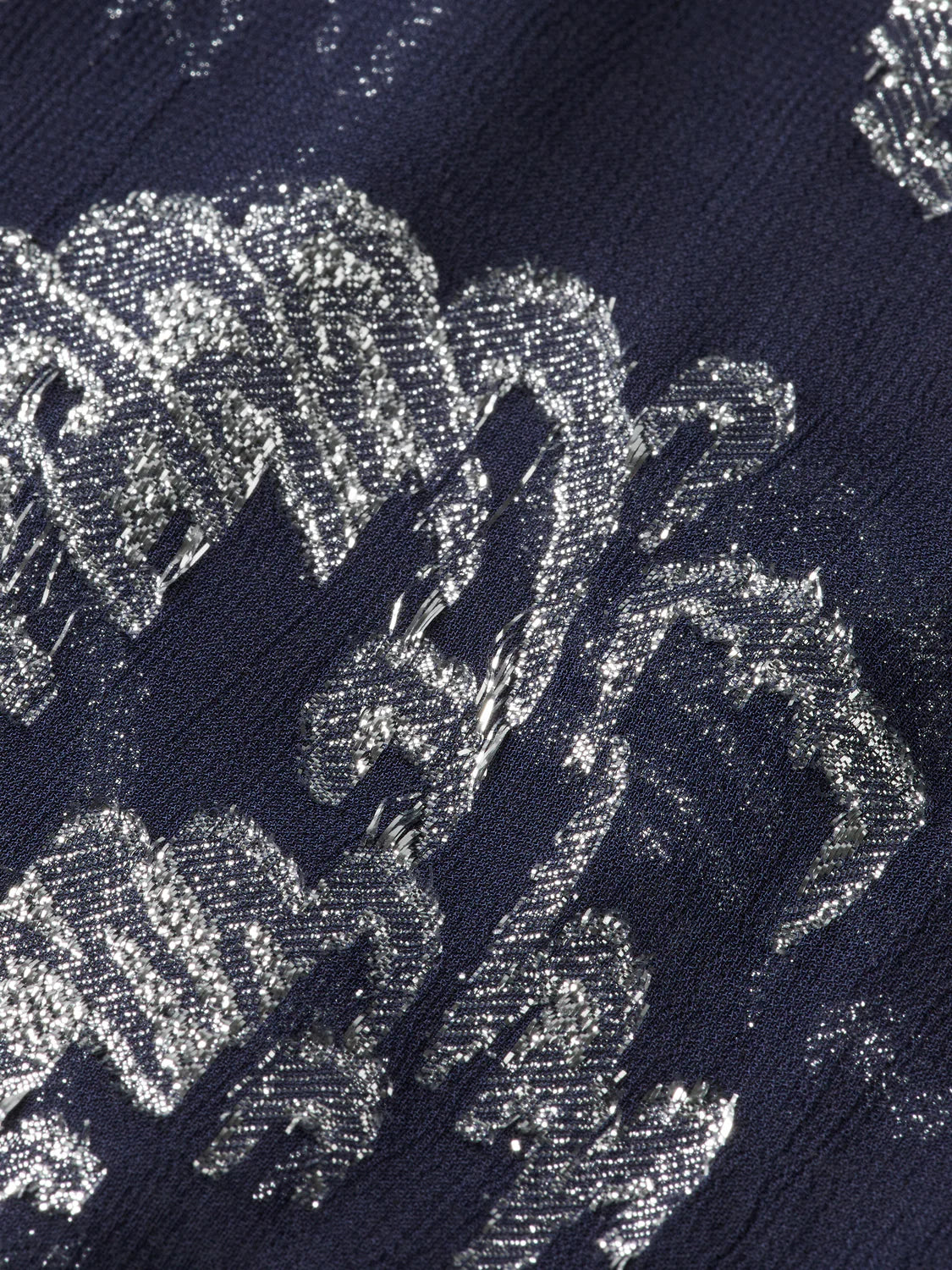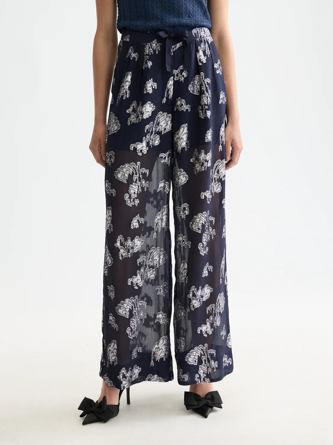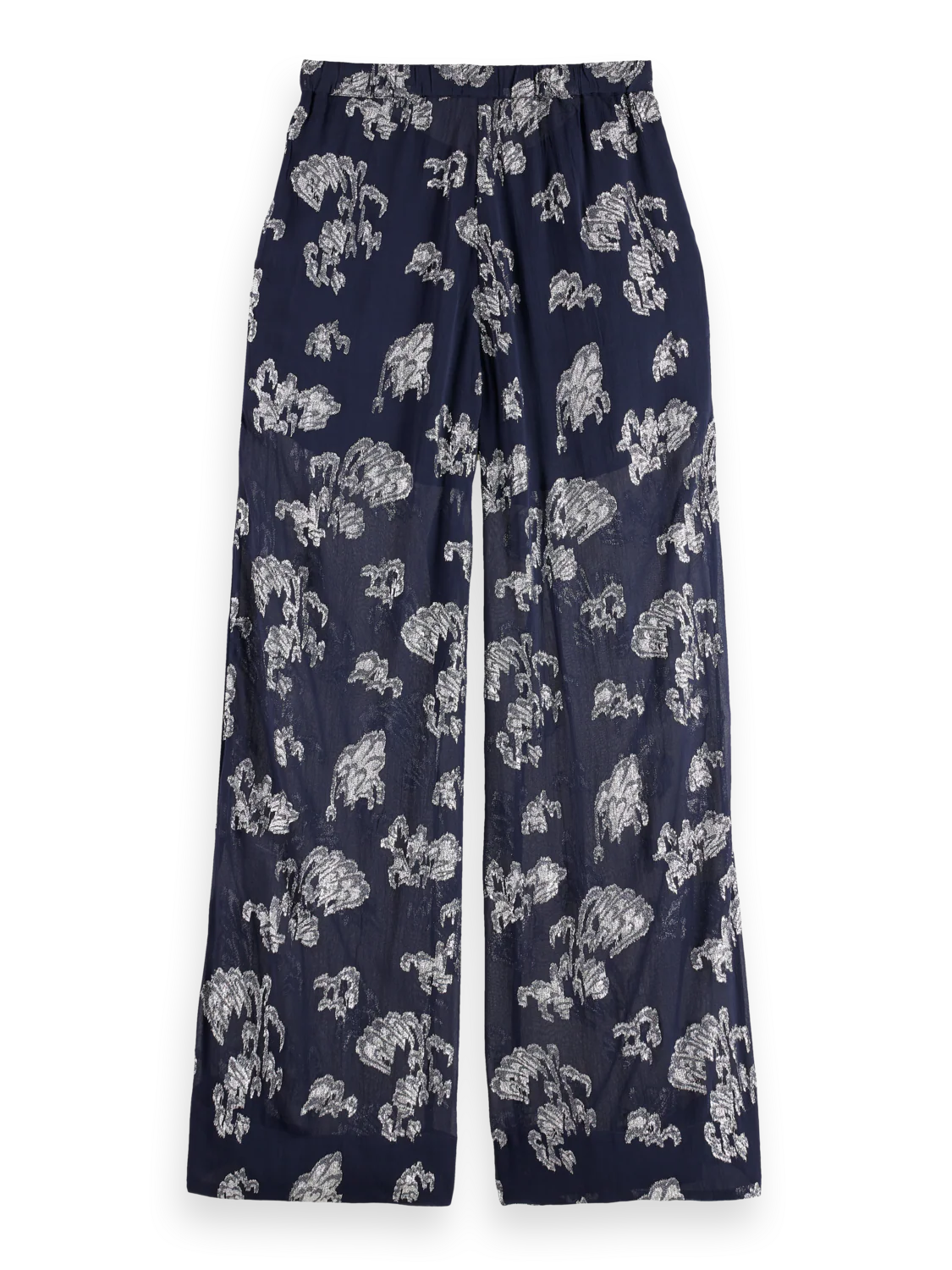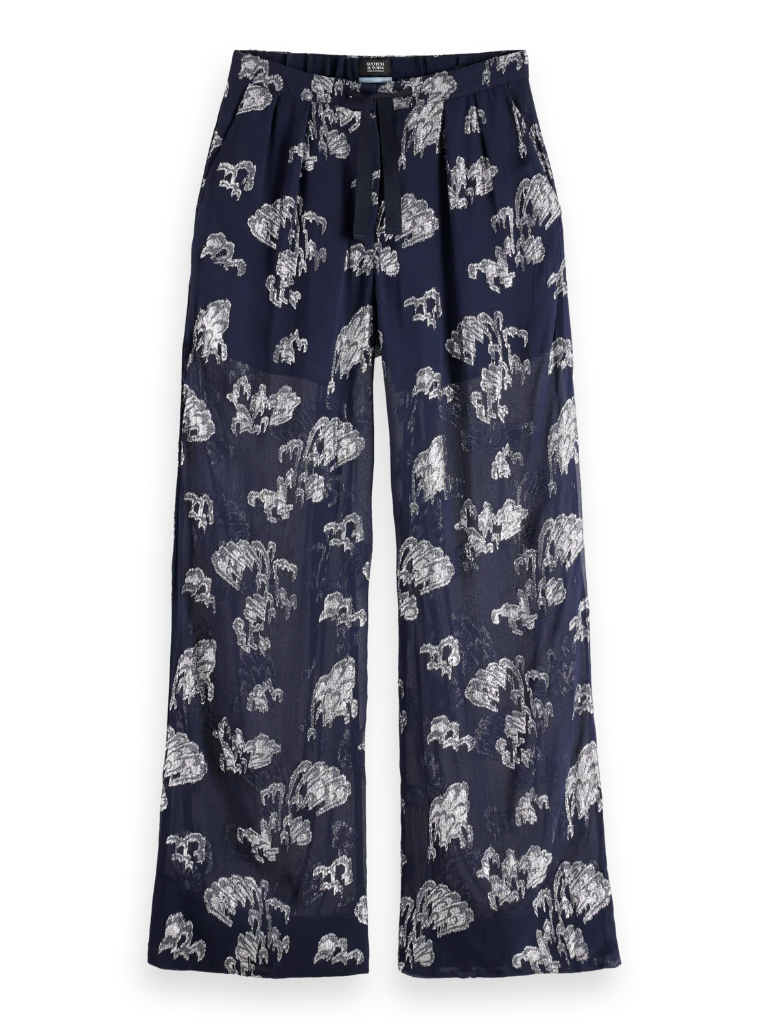 Ótrúlega skemmtilegar buxur frá Scotch & Soda. Þær eru úr virkilega sparilegu og fínu efni, eru dökkbláar og með silfur mynstri í. Þær eru með bandi í mittinu, útvíðar í sniði og eru með áföstum stuttbuxum, svo þær eru hálfgegnsæjar rétt fyrir ofan hné og niður.