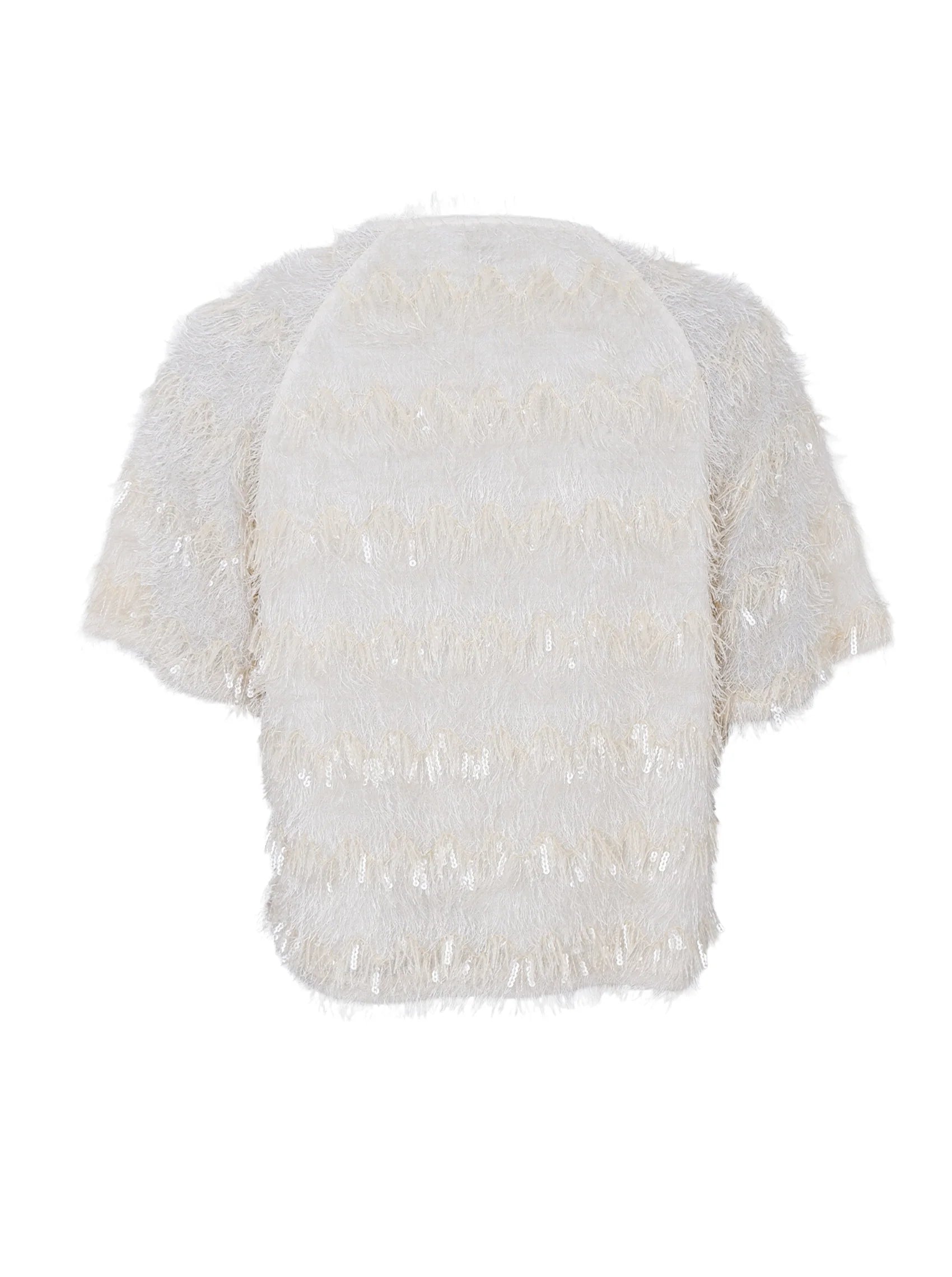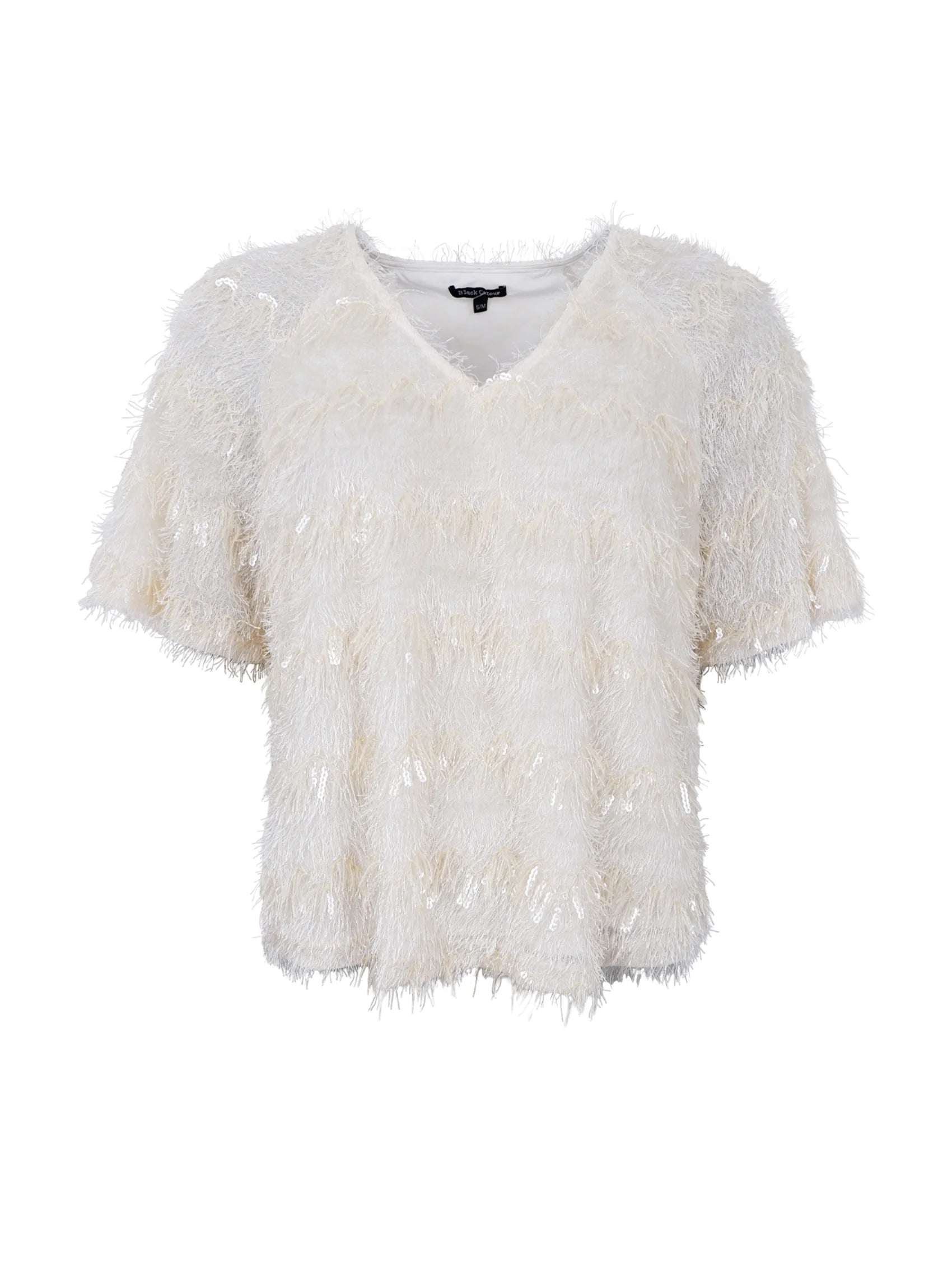 Fallegur og sparilegur bolur frá danska merkinu Black Colour. Hann er með v-hálsmáli, laus í sniði og stutterma. Með pallíettum og mjög partílegur. Flottur við bæði gallabuxur, fínni buxur eða pils.