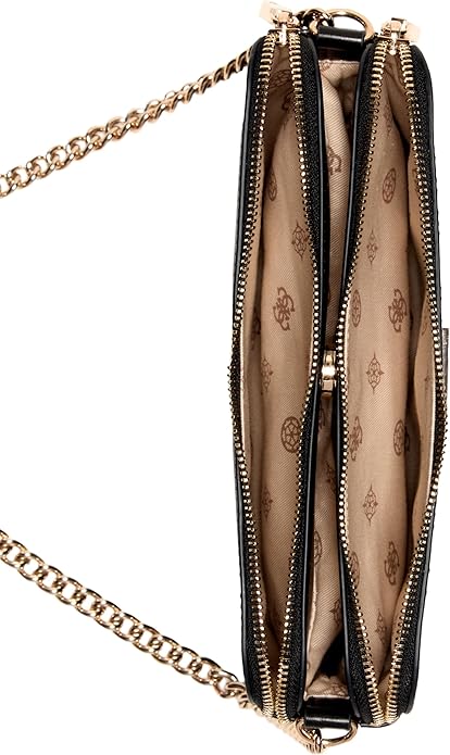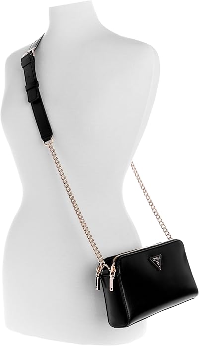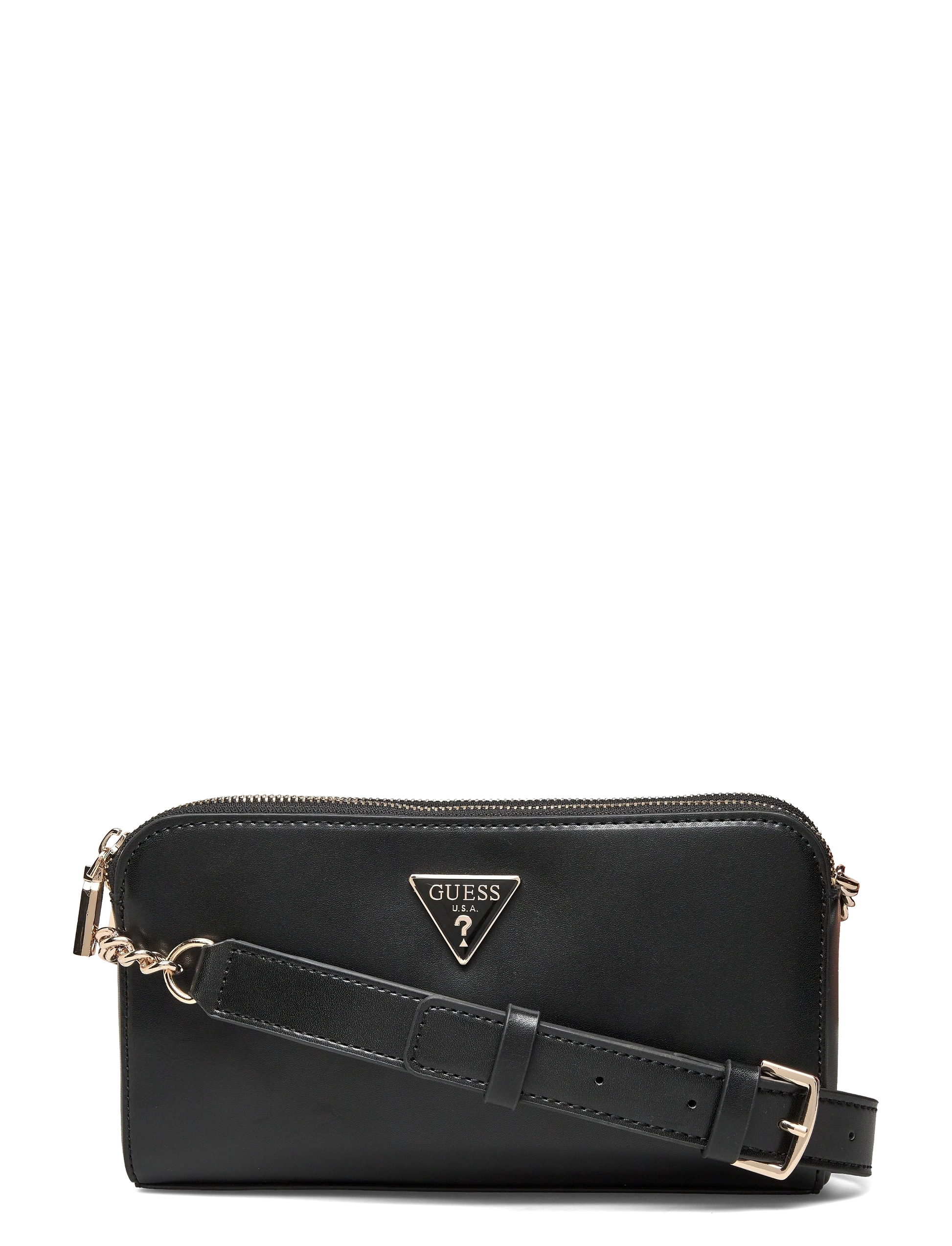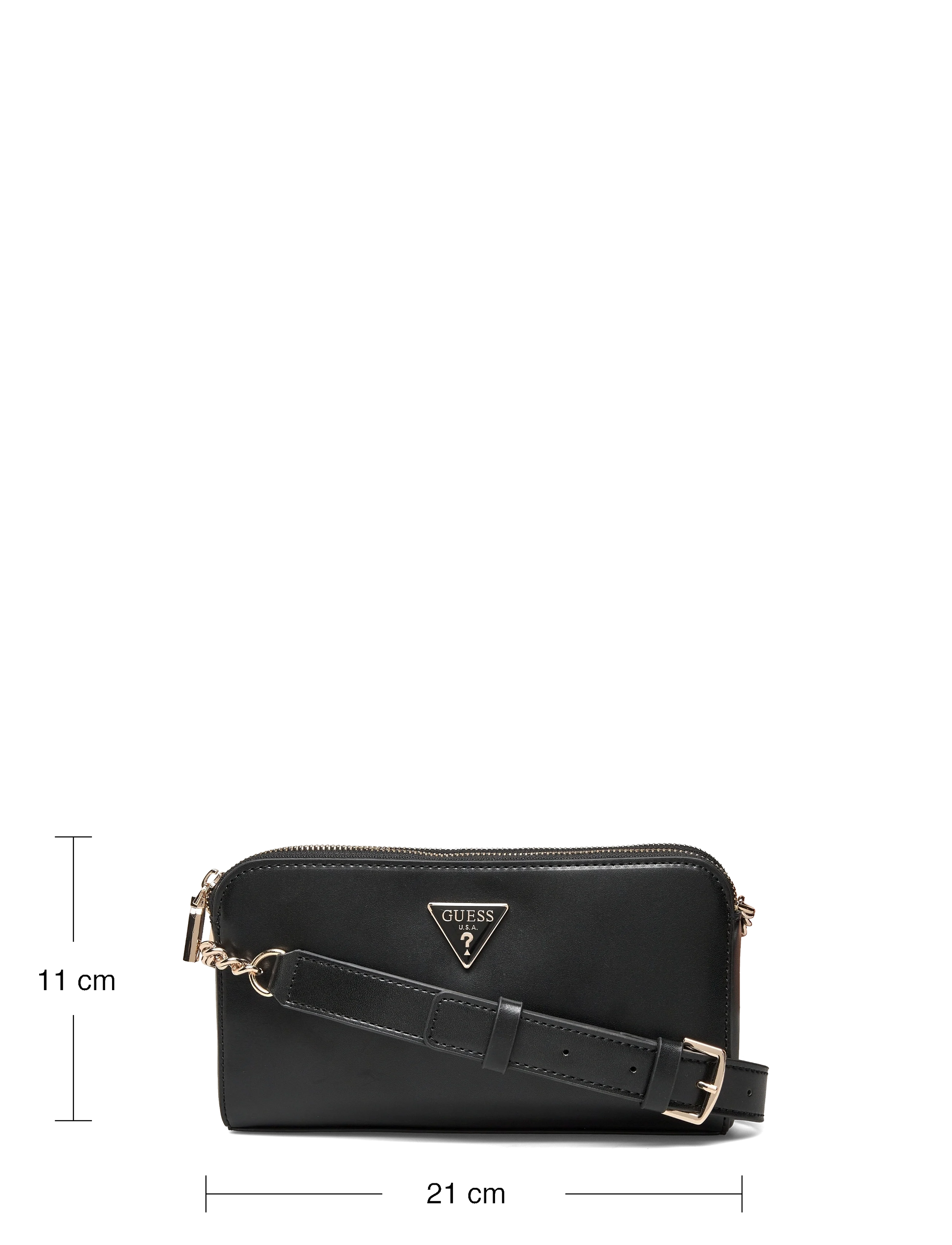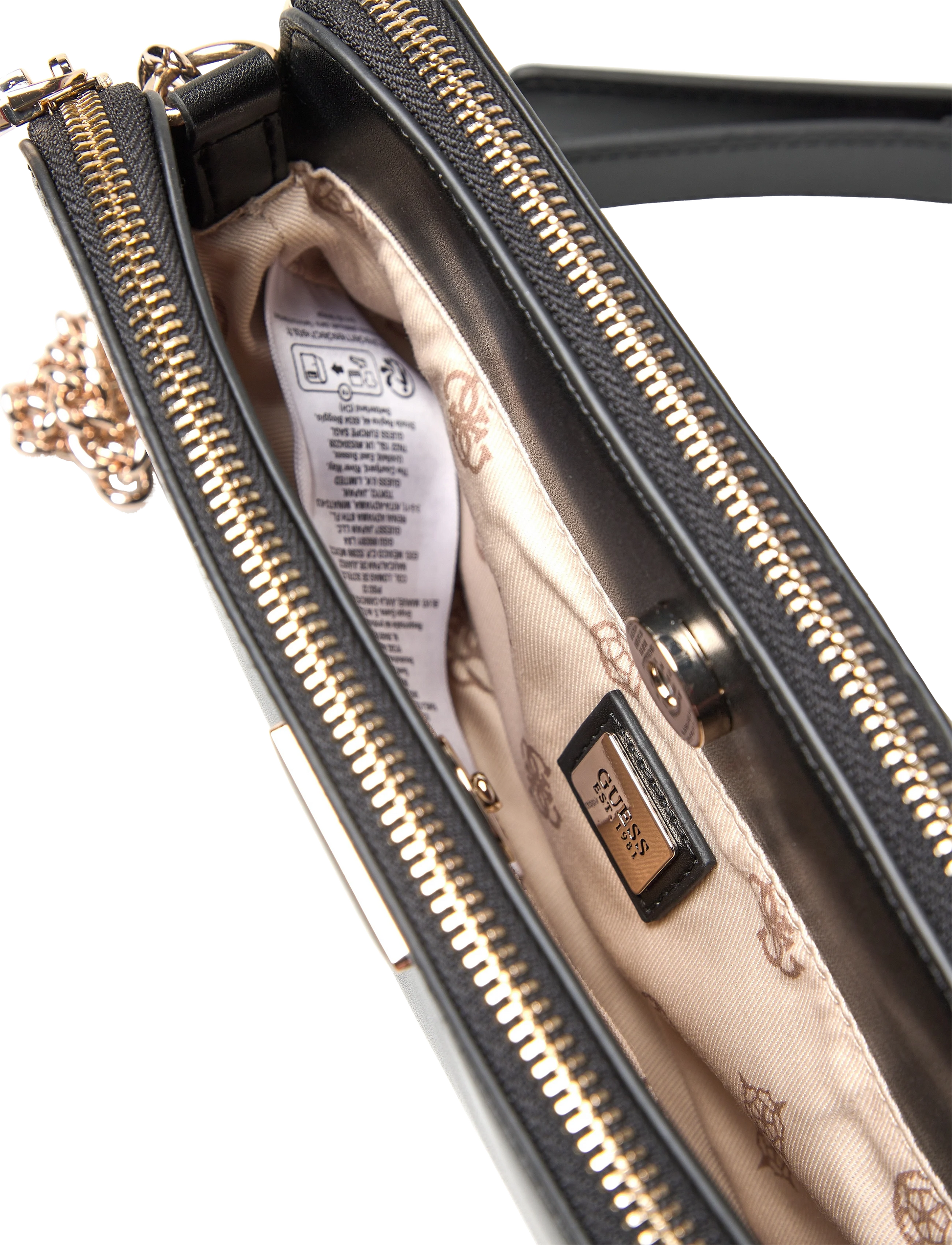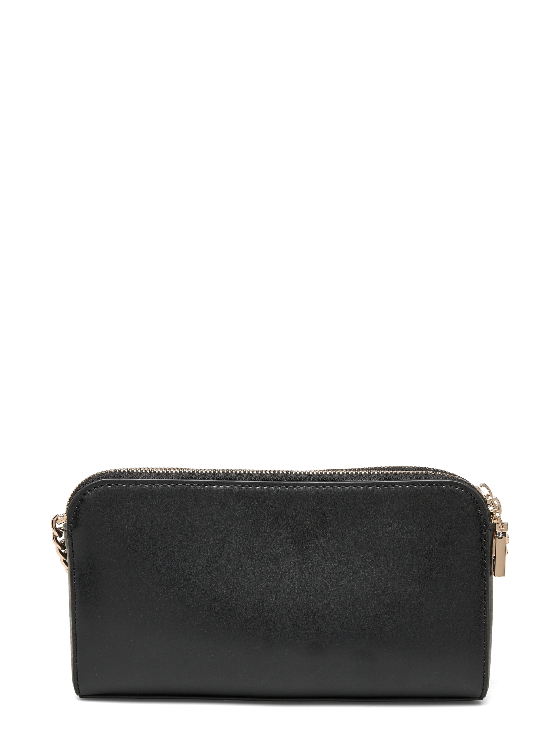 Miðjuhólfið lokast með smellu en svo eru einnig tvö rennd hólf á töskunni. Svört, slétt, örlítið glansandi áferð er á töskunni sem gerir hana sérstaklega sparilega