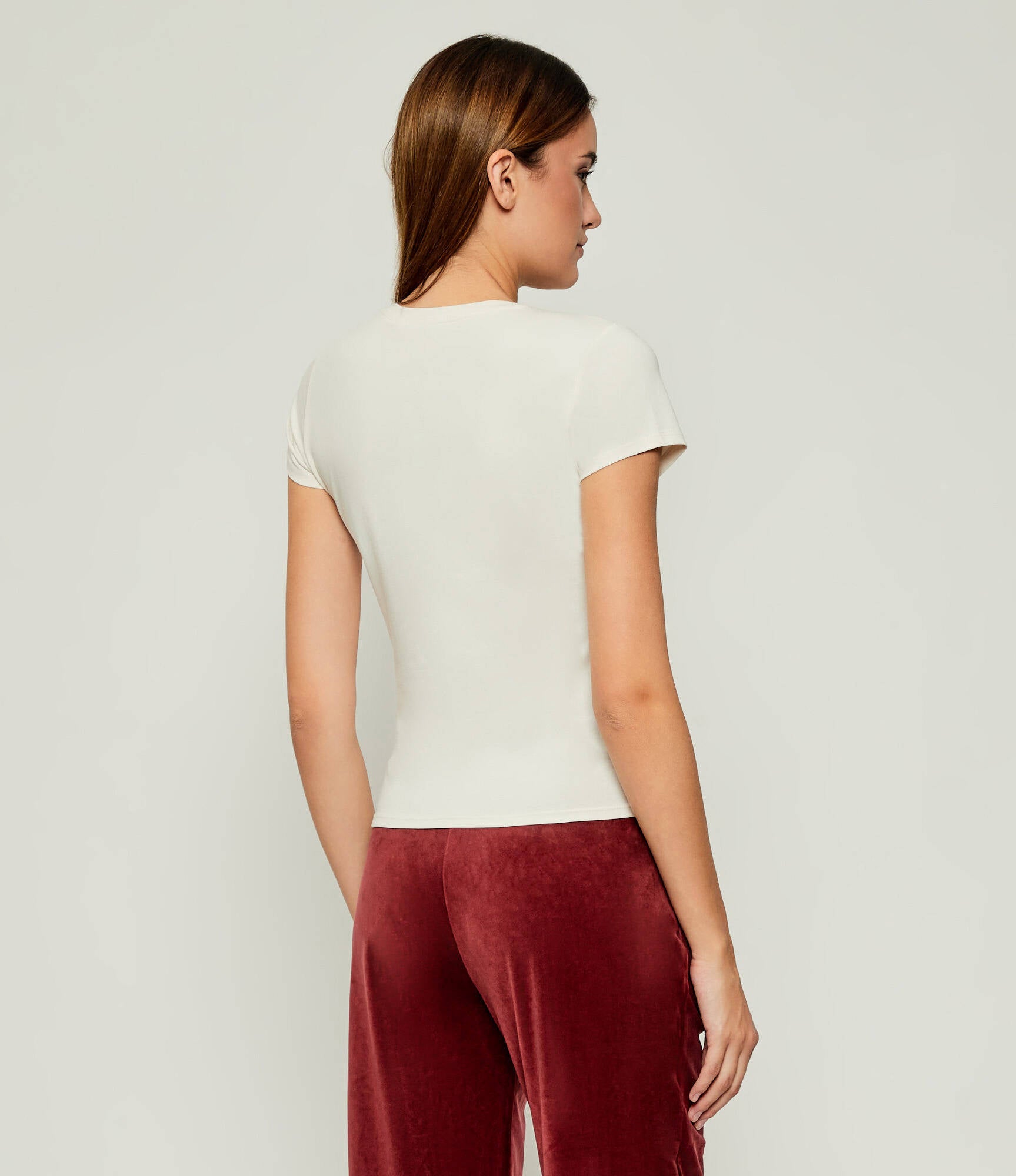Skemmtilegur stuttermabolur frá Guess. Frekar stuttur og þröngur í sniði