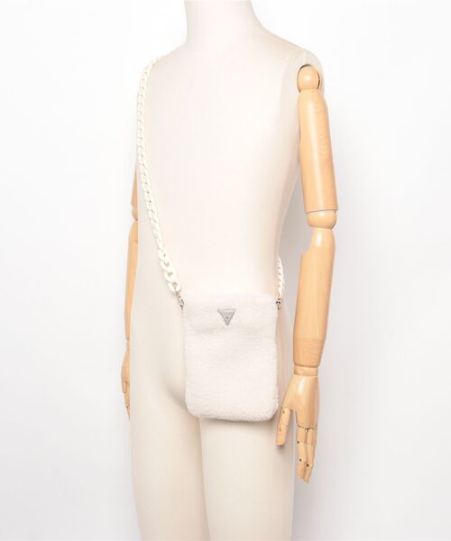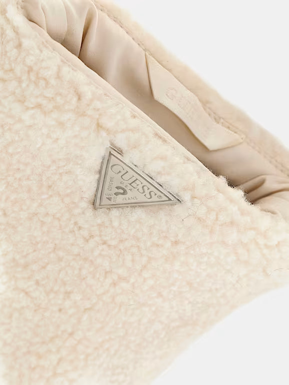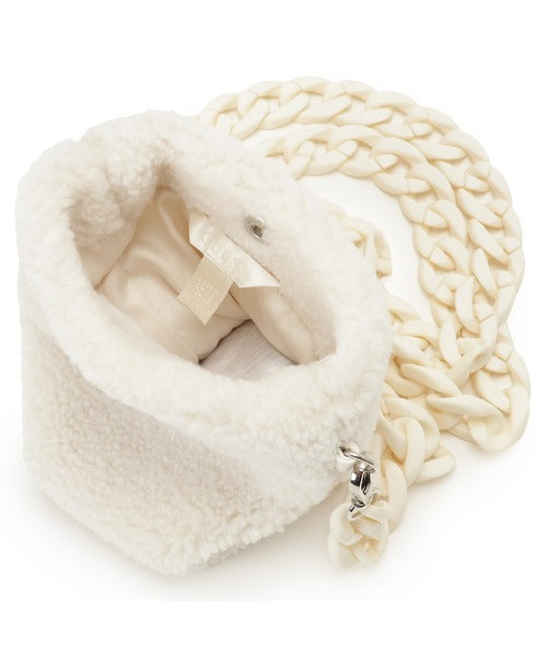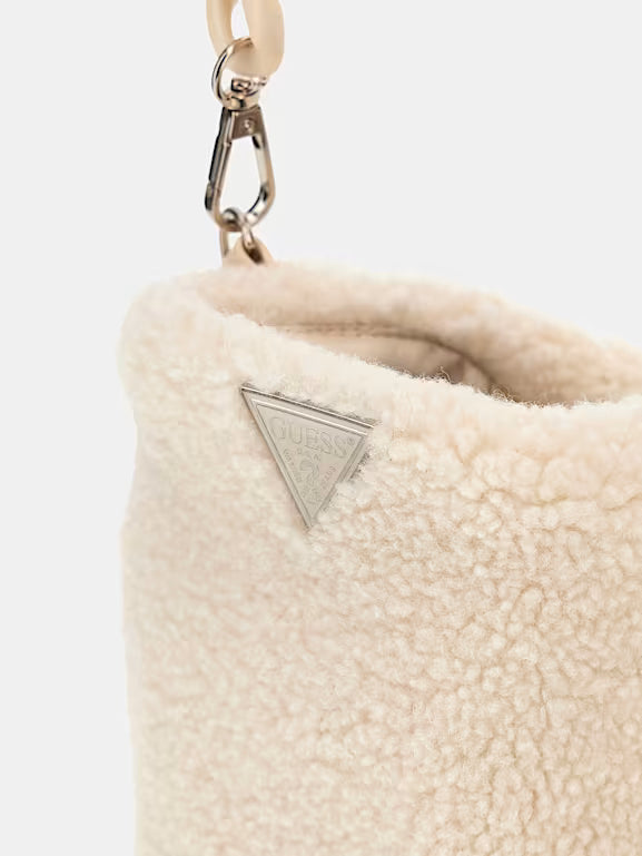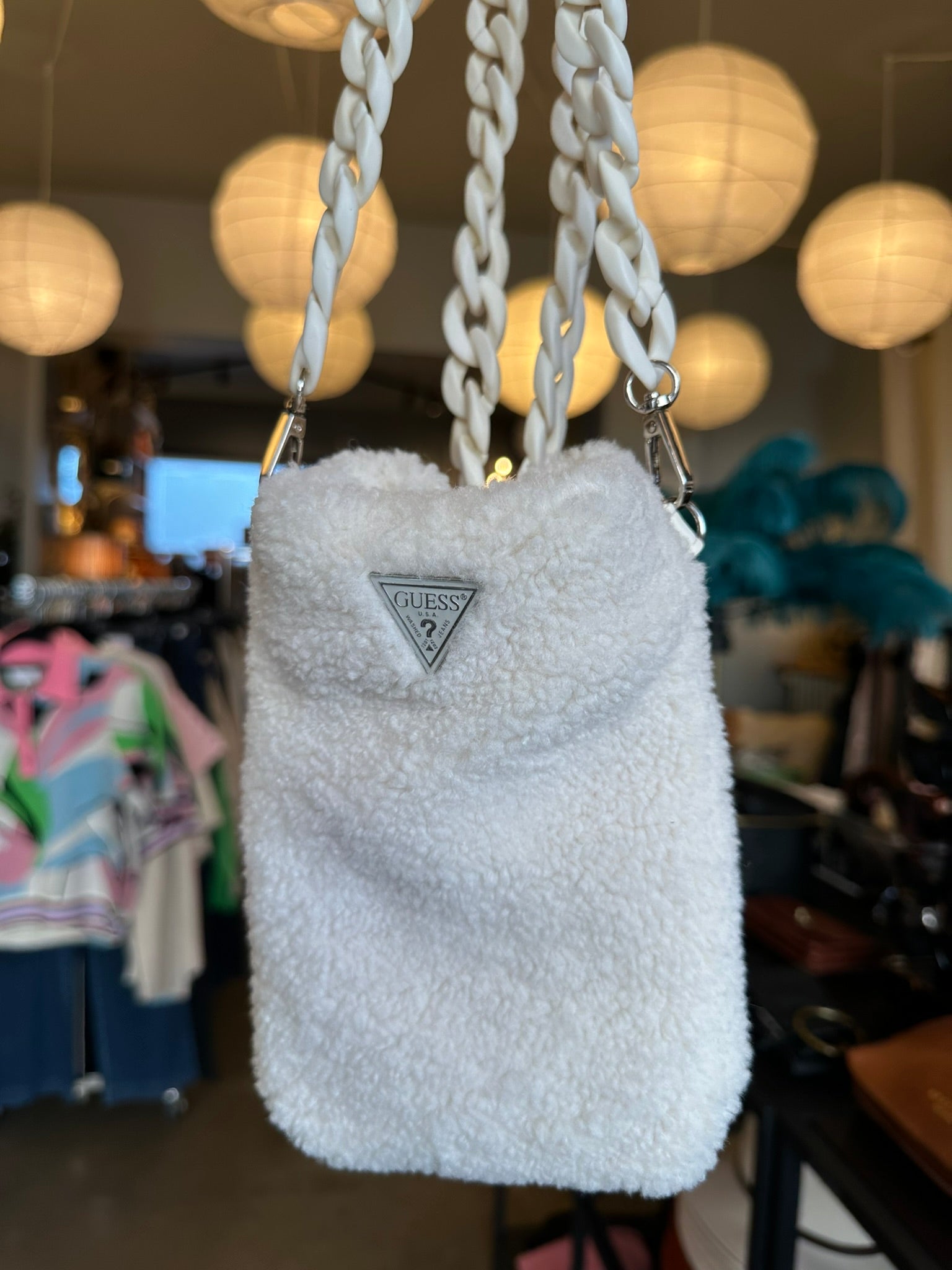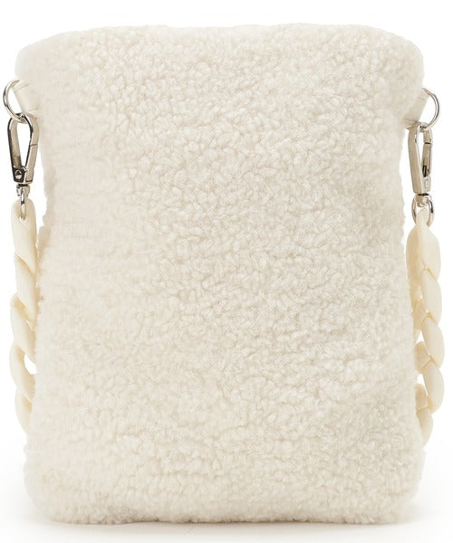Létt og nett hliðar-símaveski úr teddy efni. Gróf en létt keðjuól úr plasti. Eitt hólf sem lokast að ofan með smellu