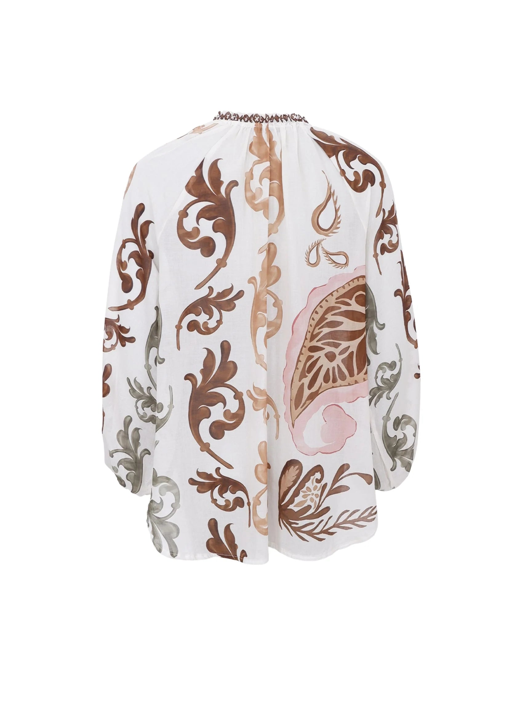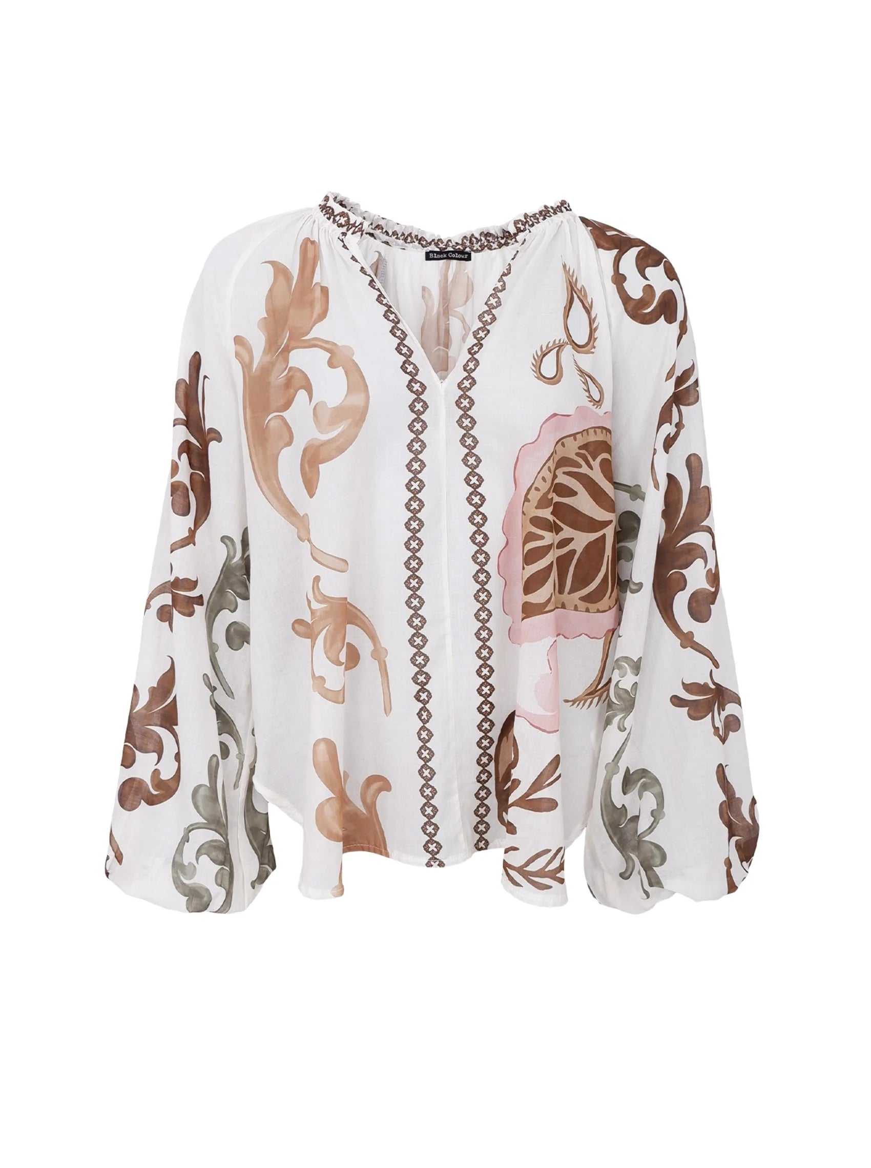 Hún er með fallegu mynstri, v-hálsmáli, síðum ermum og er laus í sniði. Kemur í einni stærð (one size).