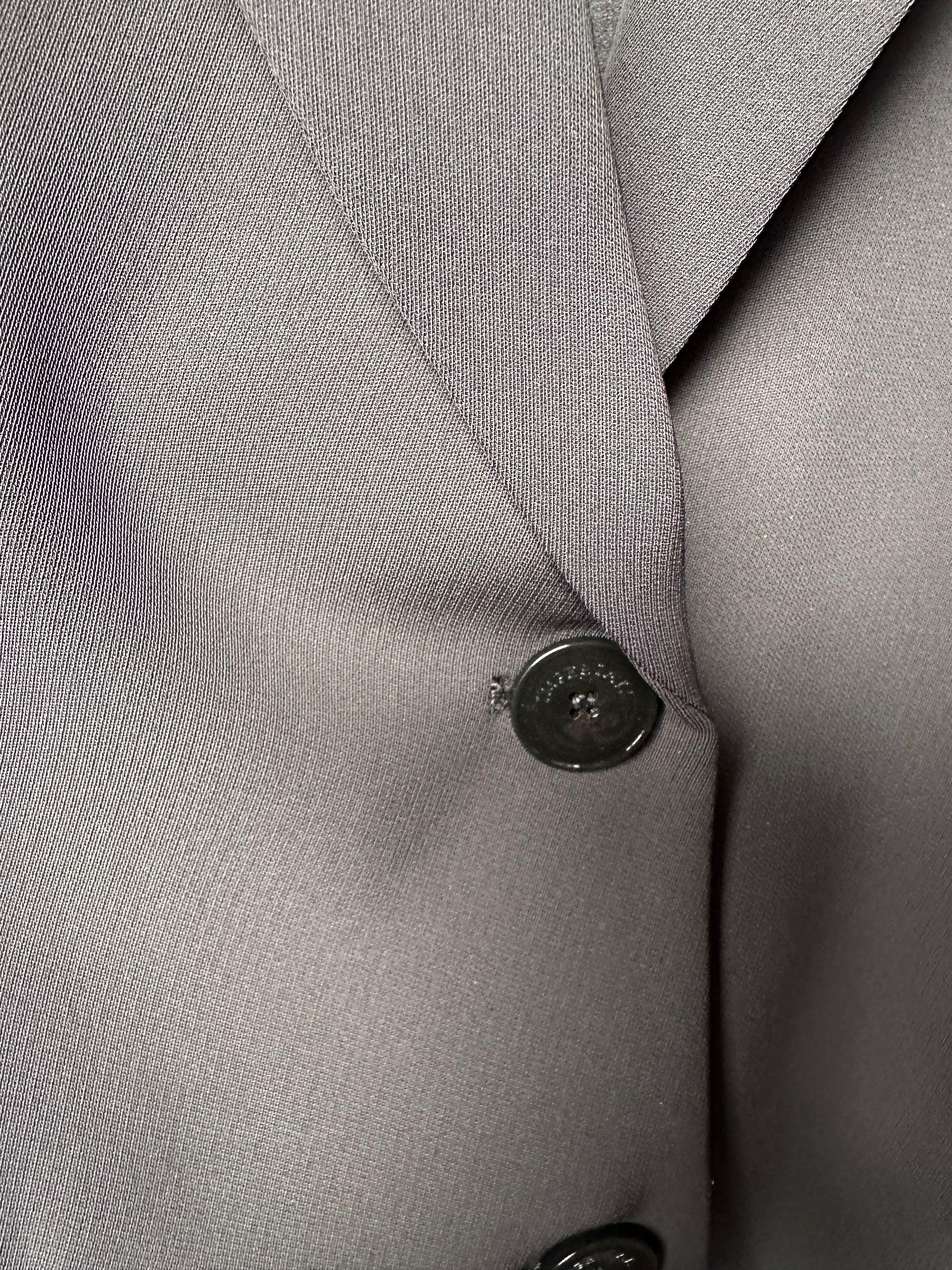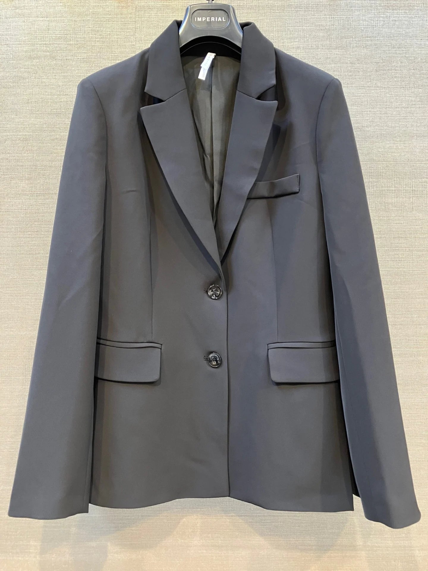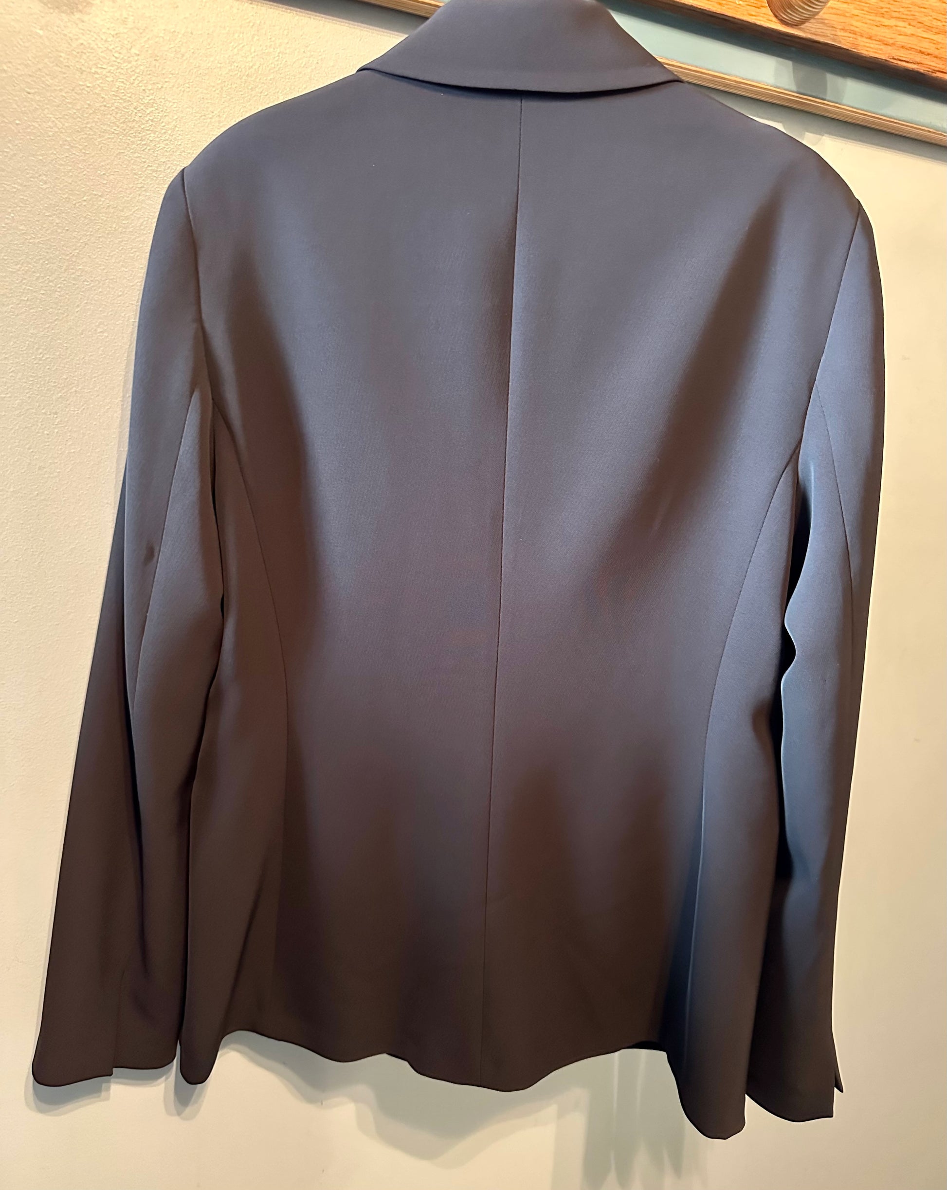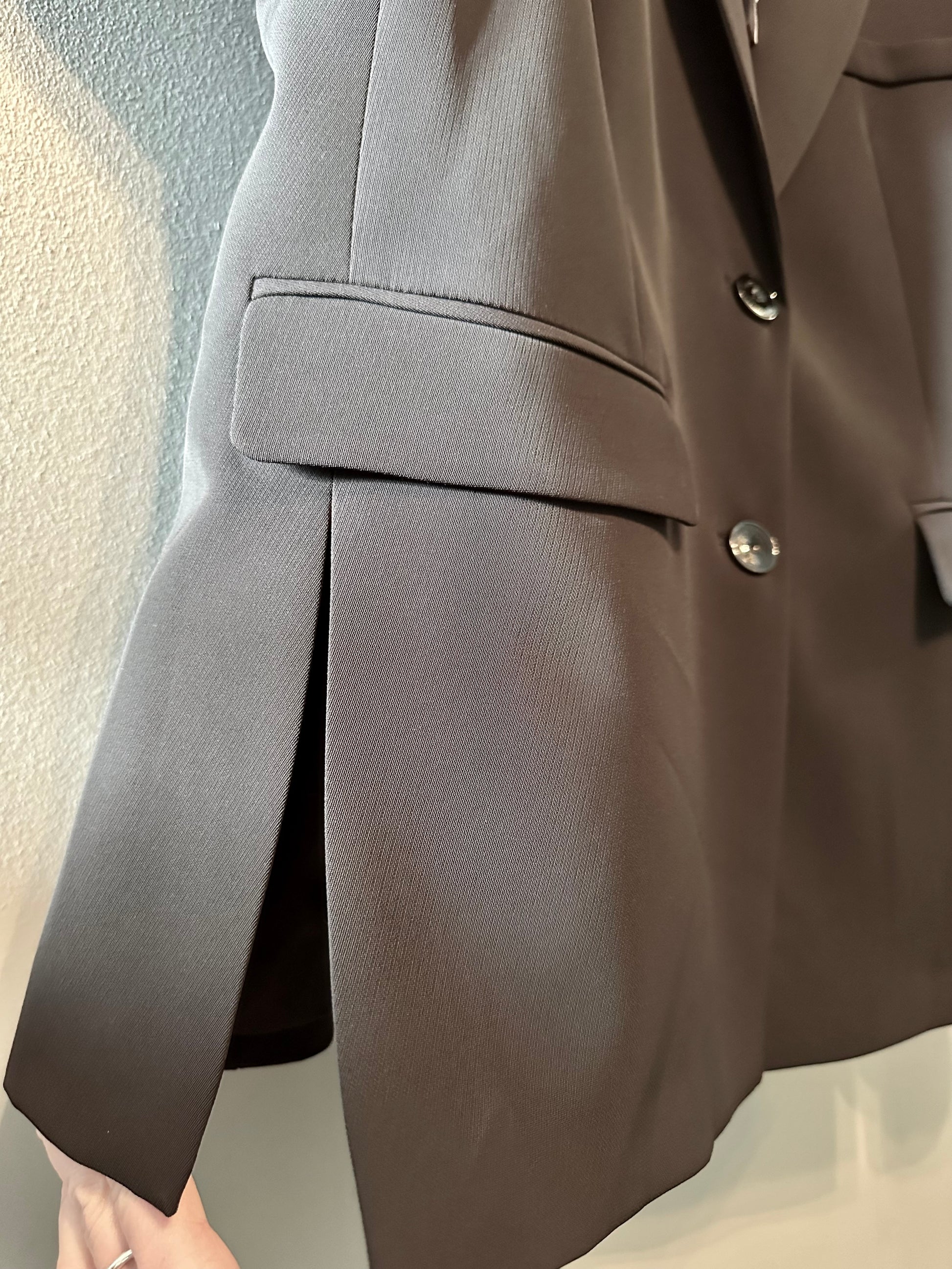 Hann er tvíhnepptur, örlítið aðsniðinn og á hliðinum eru klaufar sem gera hann enn flottari. Léttur og lipur jakki sem auðvelt er að klæða upp og niður.