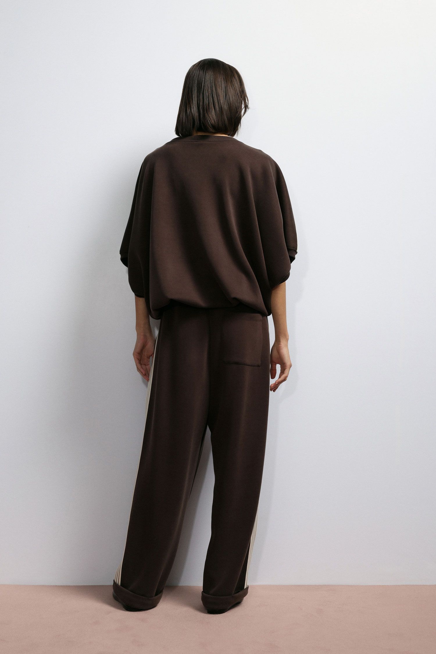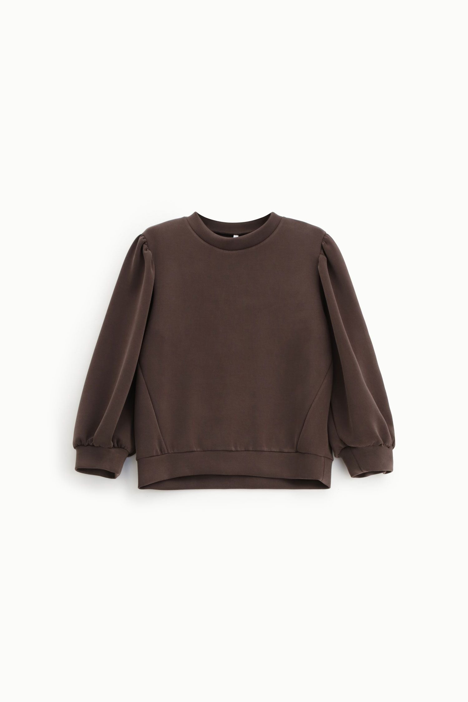 Einstaklega mjúk og þægileg með smá púffi á öxlum og 3/4 sídd af ermum. Peysan er frekar laus í sniði og er fullkomin við joggingbuxurnar með röndinni (sjá síðustu 2 myndirnar) eða gallabuxur.