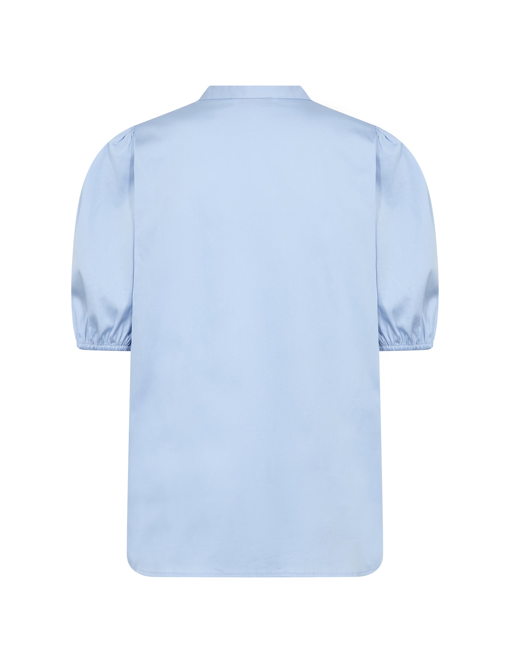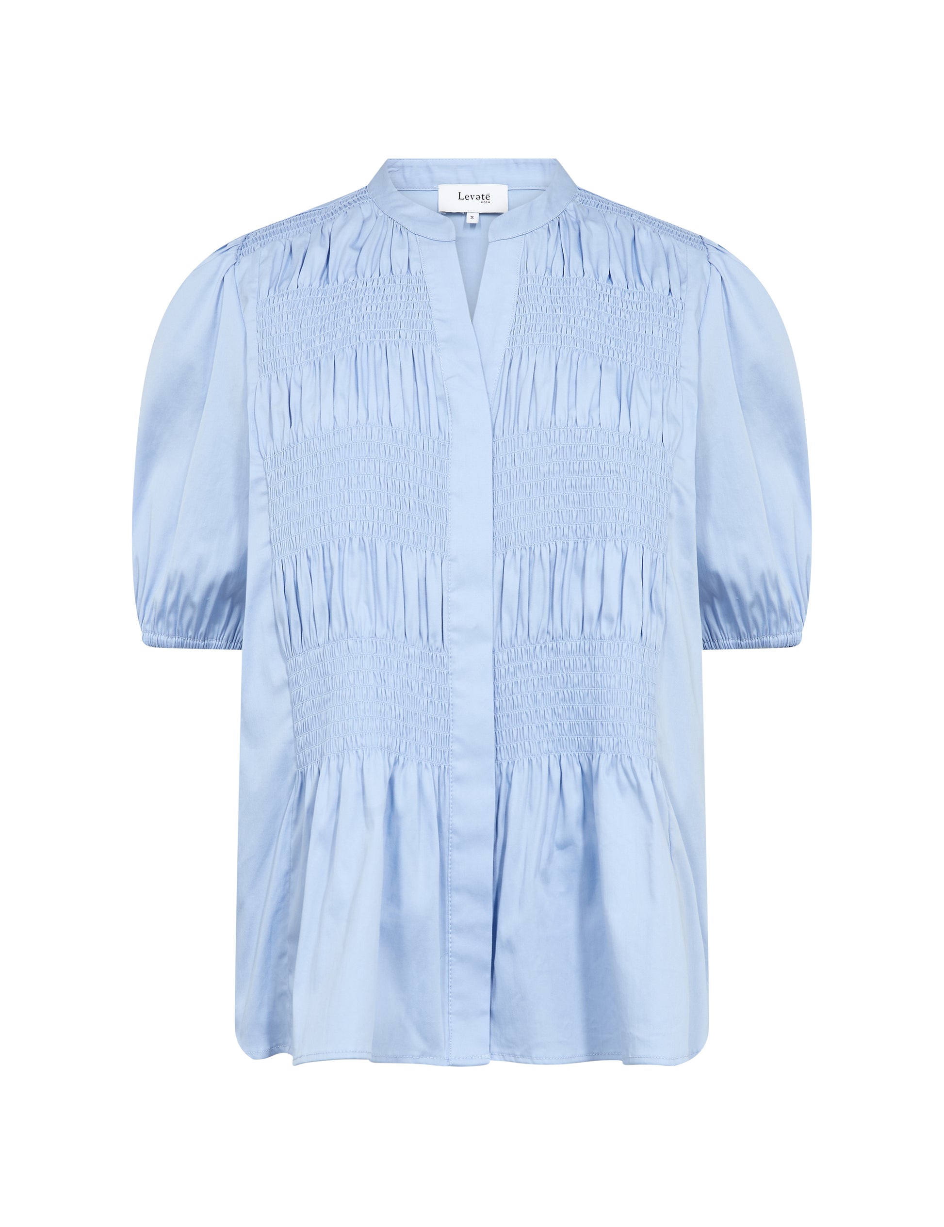 Falleg og klassísk skyrta frá danska merkinu Levete Room. Hún er með v-hálsmáli, hneppt alla leið, með stuttum ermum sem eru teknar saman og fallegum pífum sem leyfa henni að flæða skemmtilega.