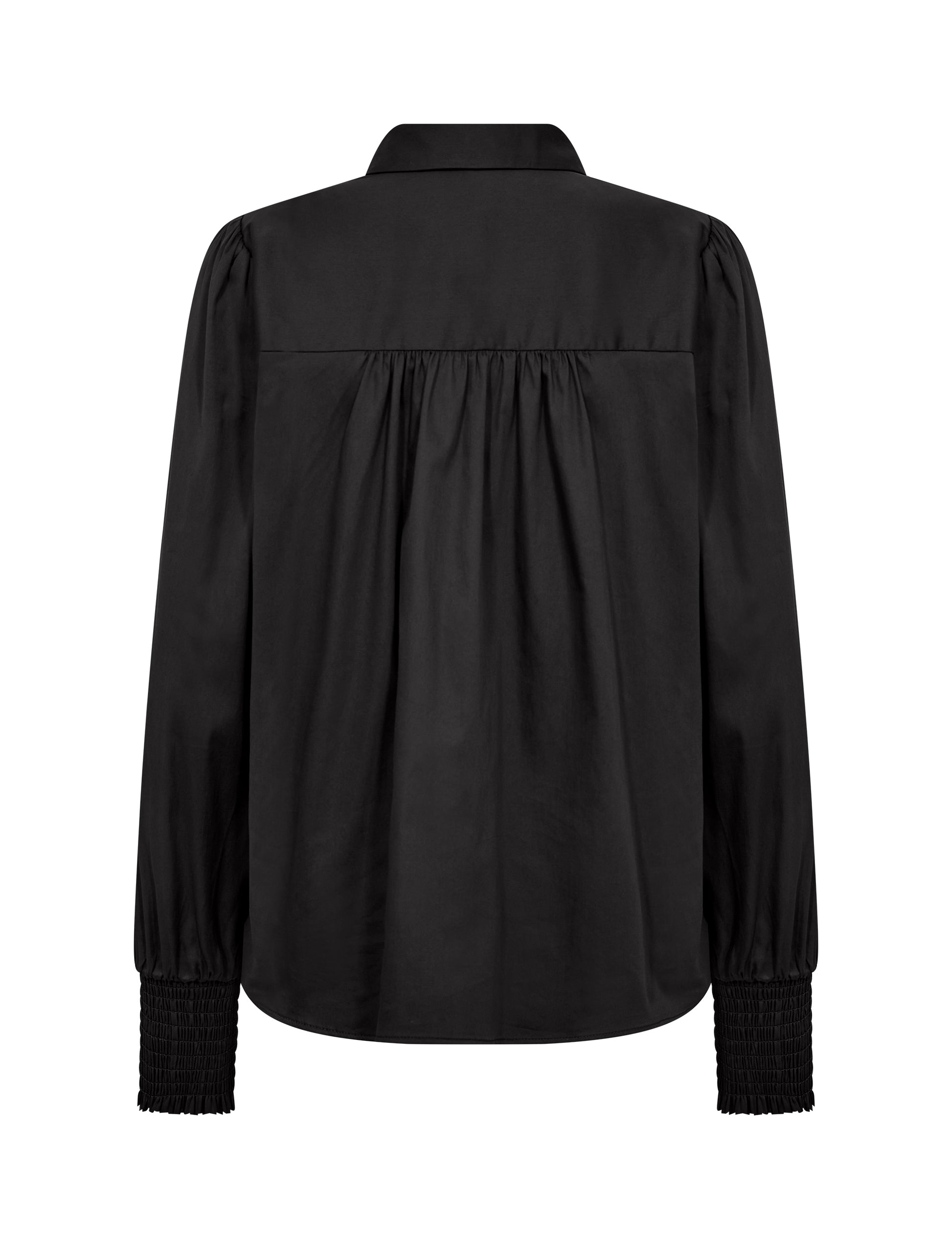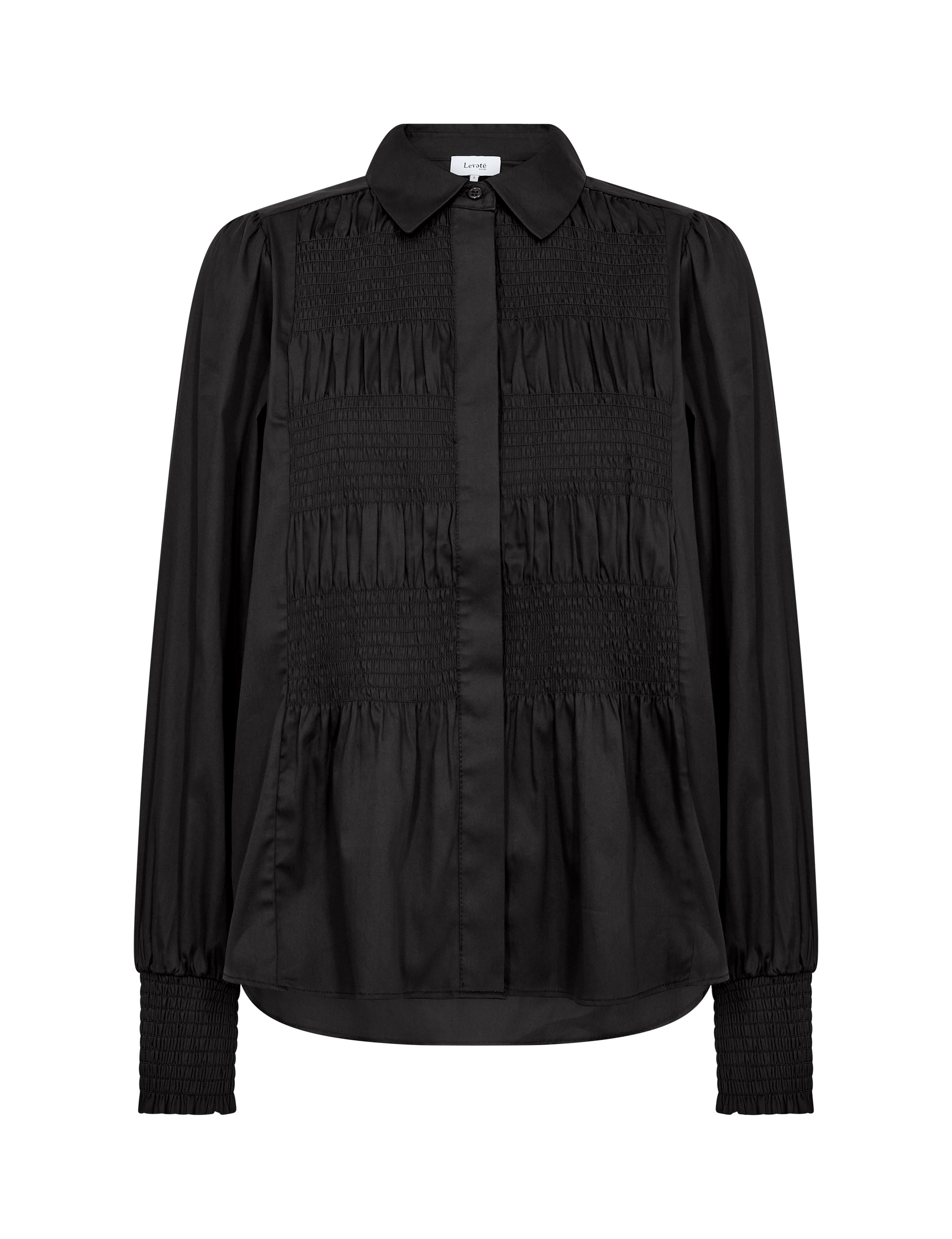 Falleg skyrta í skemmtilegu sniði sem hefur slegið í gegn, frá danska merkinu Levete Room. Hún er með klassískum skyrtukraga, hneppt alla leið, með örlítið víðum ermum sem eru teknar saman og fallegum pífum sem leyfa henni að flæða skemmtilega.