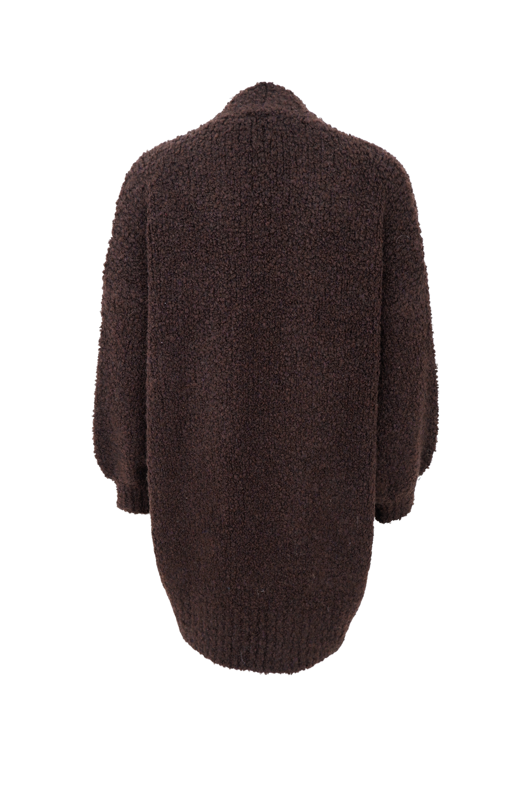 Hlý og djúsí millisíð opin peysa með vösum að framan. Peysan er frekar stór í sniði en hún kemur aðeins í einni stærð og er dökkbrún (coffee) á litinn