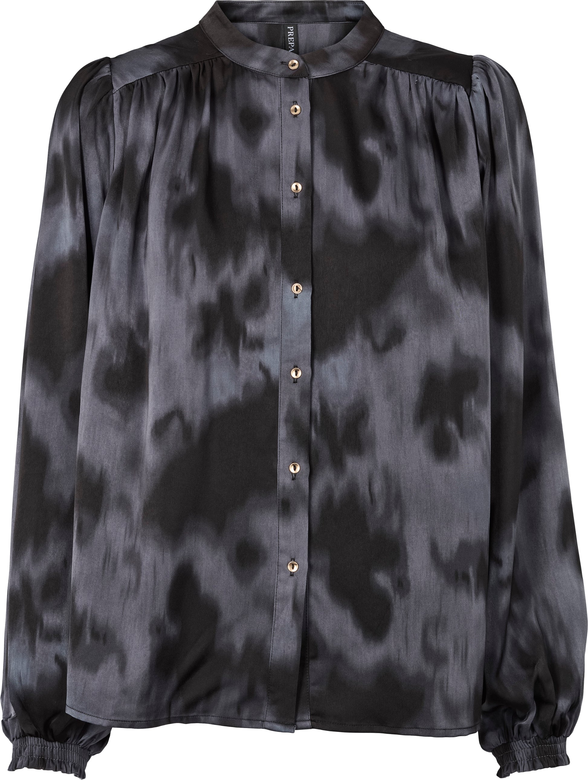 Smá púff og rykkingar eru á öxlum, vítt snið og falleg smáatriði sem gera þessa skyrtu sparilega og fallega. Létt satínáferð er á skyrtunni