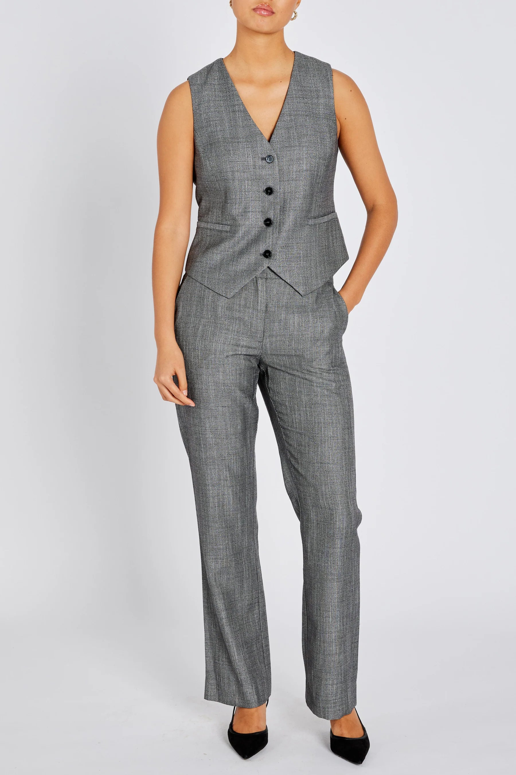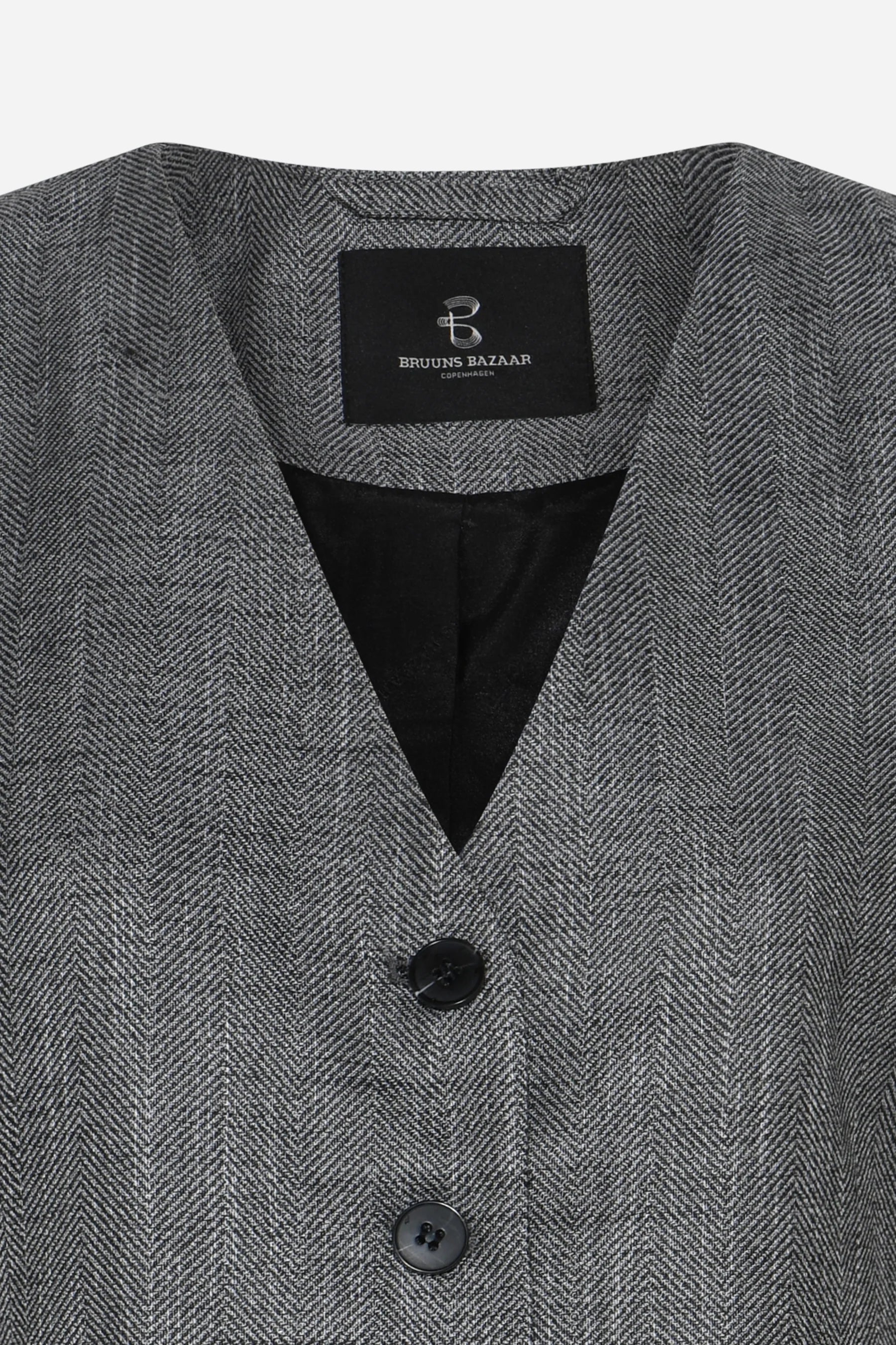 Klassískt og fallegt vesti frá Bruuns Bazaar. Það er með v-hálsmáli, hneppt og aðsniðið. Fullkomið undir KuraBBFrida blazerinn, yfir skyrtuna/bolinn eða eitt og sér.