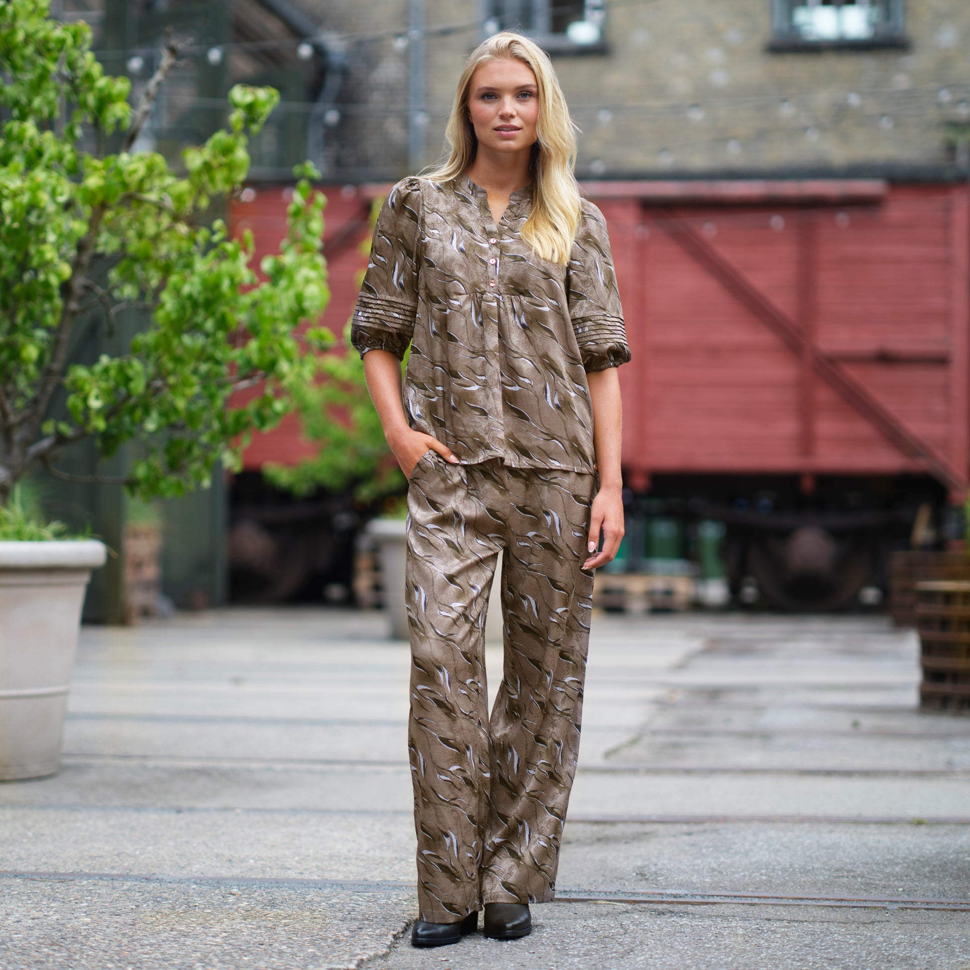 Buxurnar eru með teygju í strengnum við bakið en sléttar að framan. Beinar og aðeins víðar í sniði og með vösum. Virkilega flottar við Camilla blússuna (þá er þetta eins og samfestingur) eða við látlausari topp. Auðvelt að klæða þessar upp og niður
