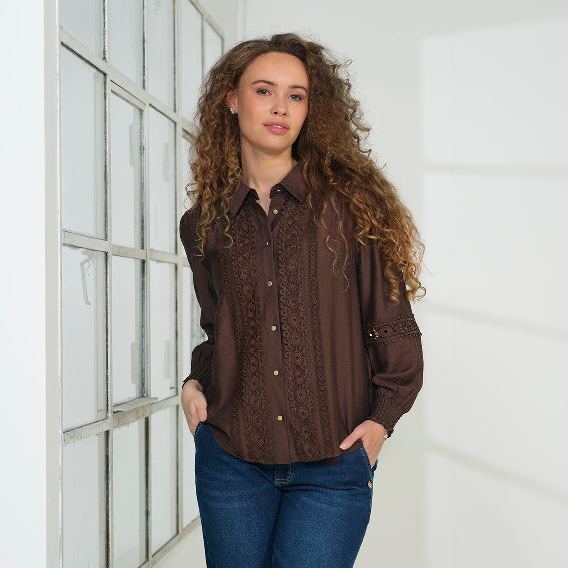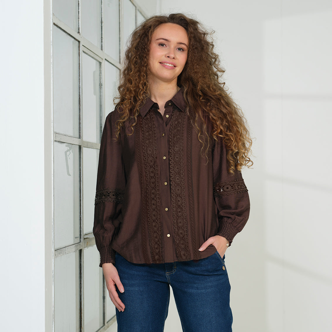 Skyrtan er með skyrtu kraga, hneppt alla leið og með frekar víðar ermar með teygjustroffi við úlnlið. Sparilegt og fallegt efni. Flott details á skyrtunni eins og búndurnar. Bein í sniði.