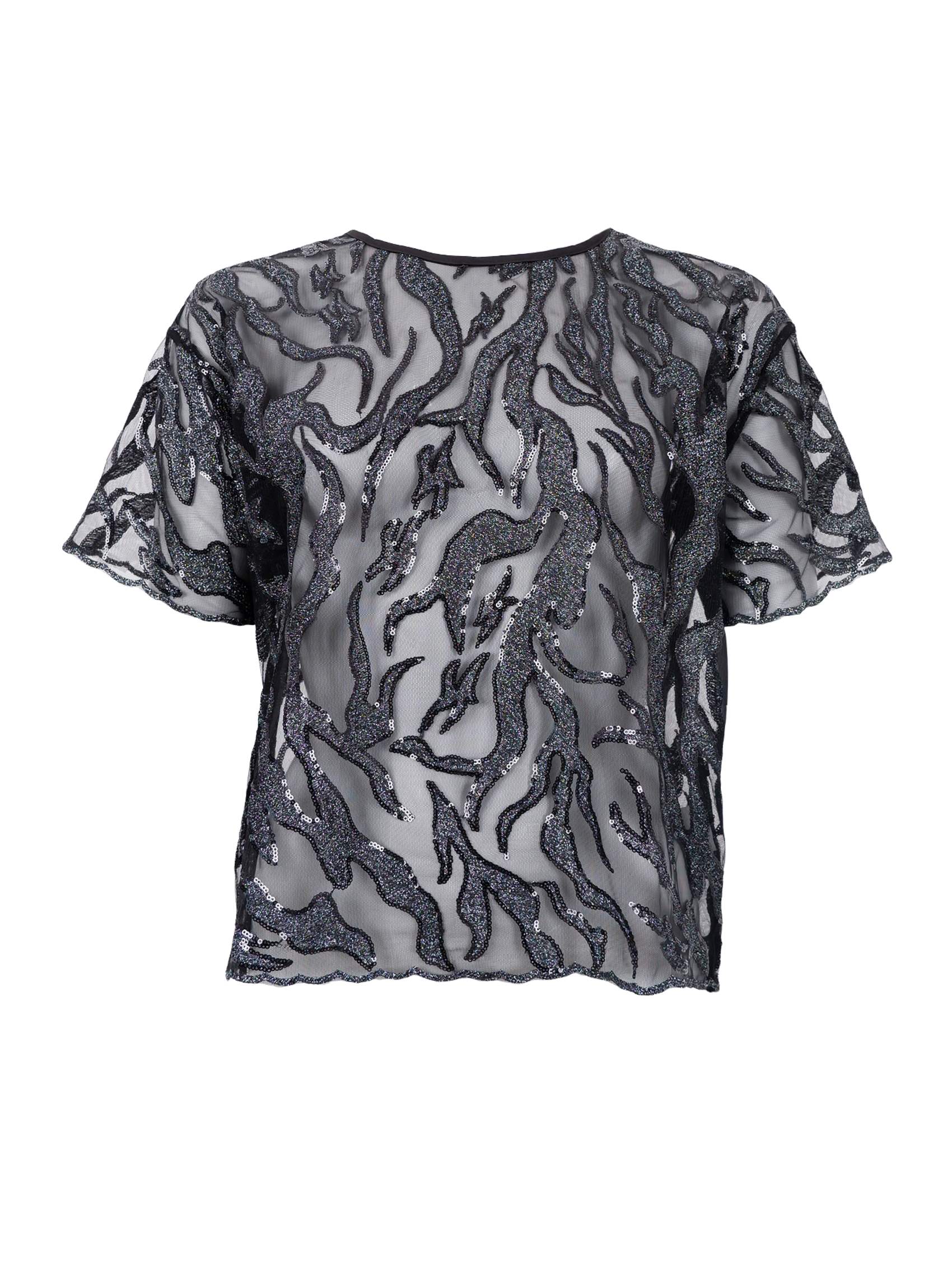 Hálf gegnsæ og falleg blússa frá danska merkinu Black Colour. Hún er með rúnuðu hálsmáli, stuttum ermum og er með fallegri blúndu og glimmeri í. Hægt að dressa fyrir ólík tilefni.