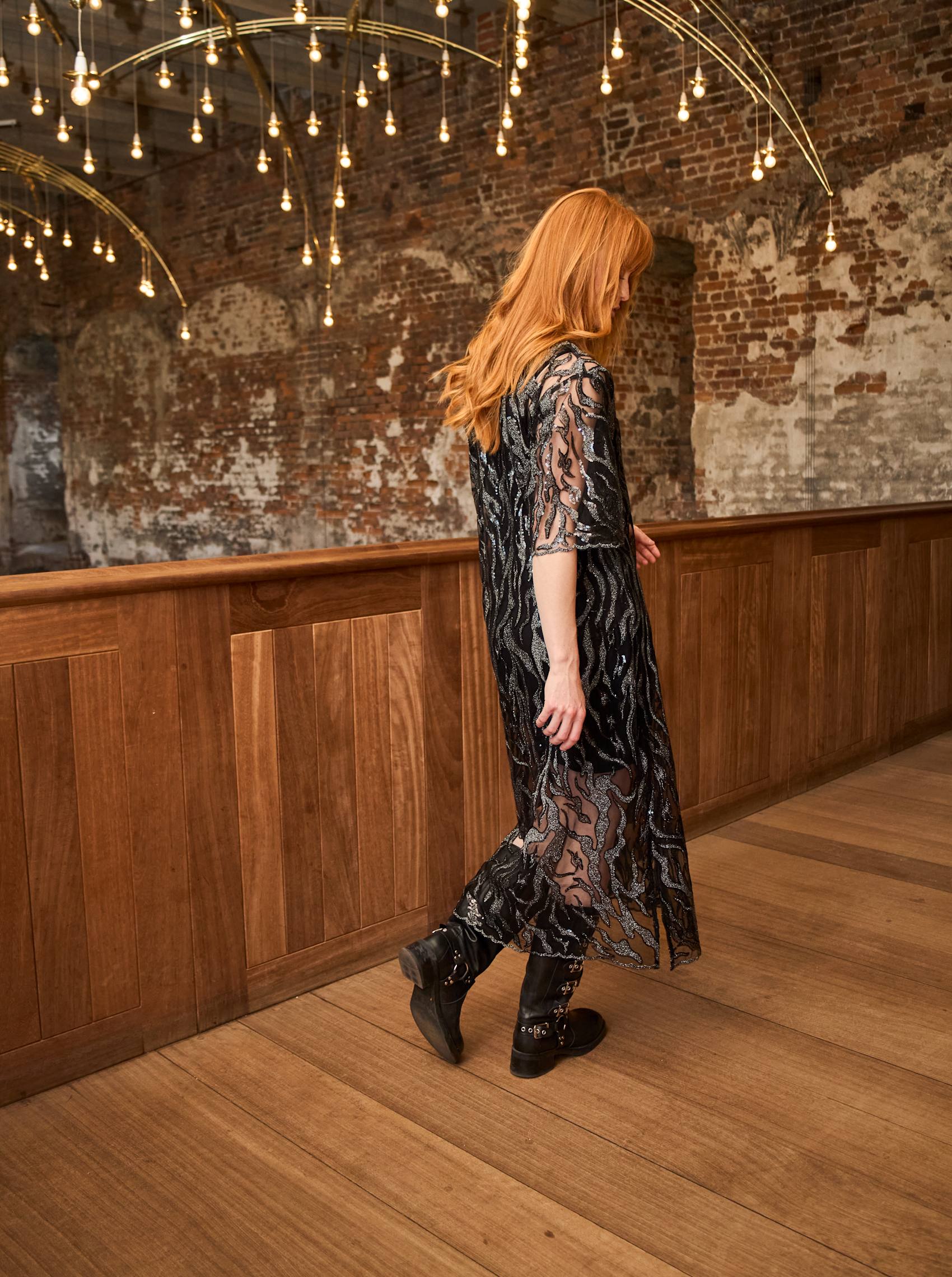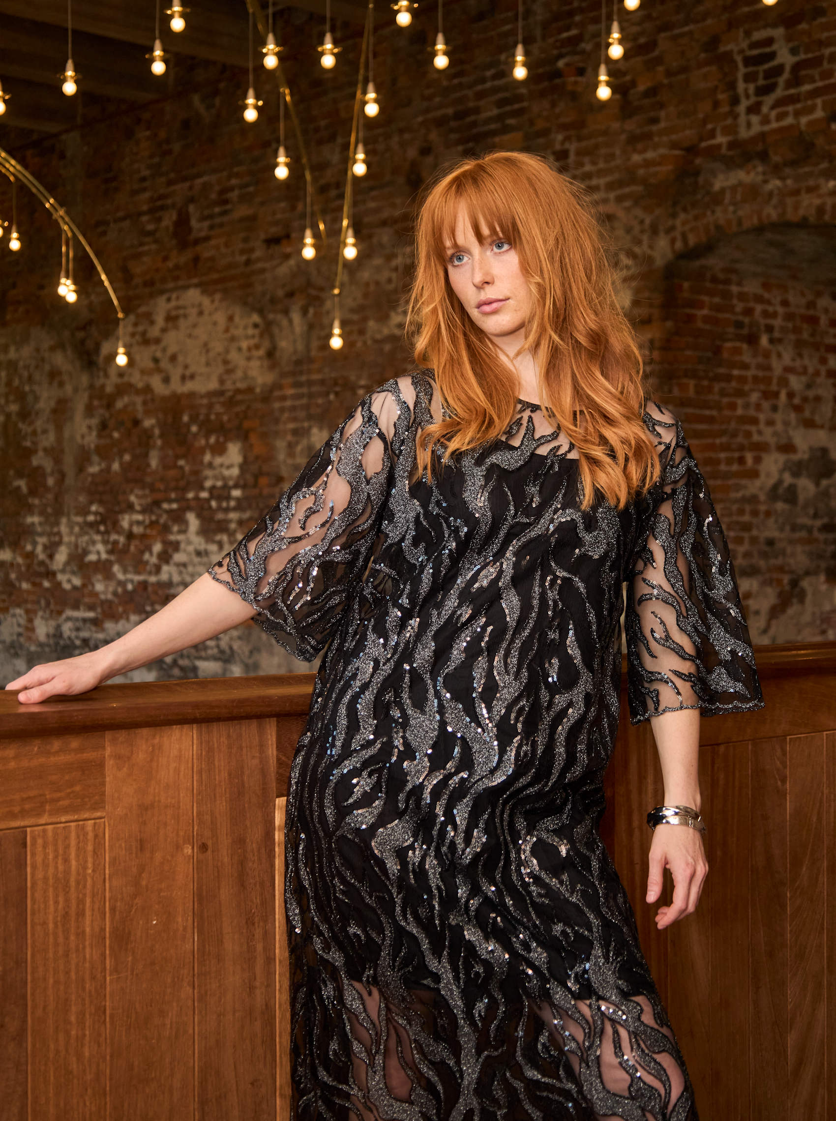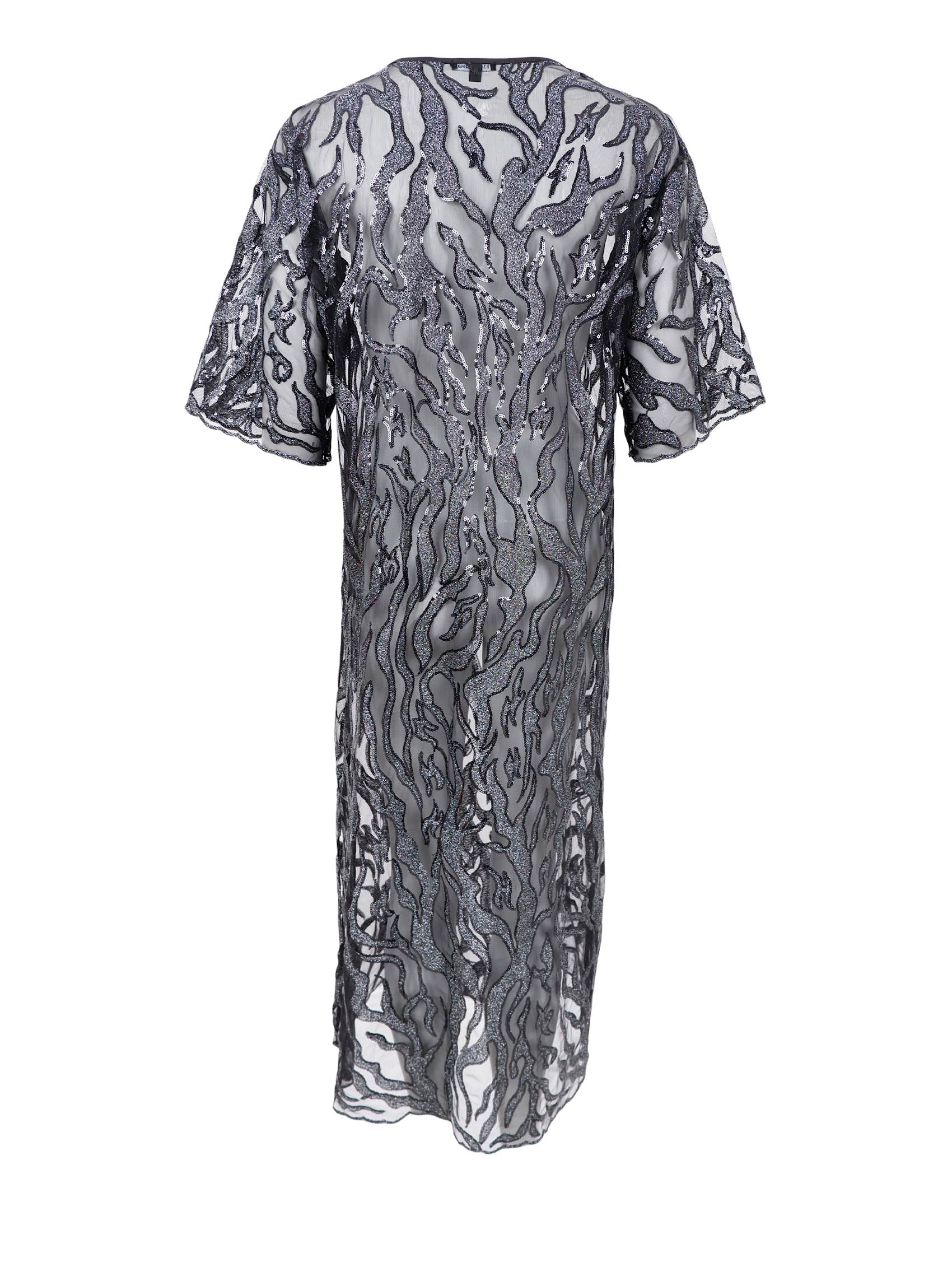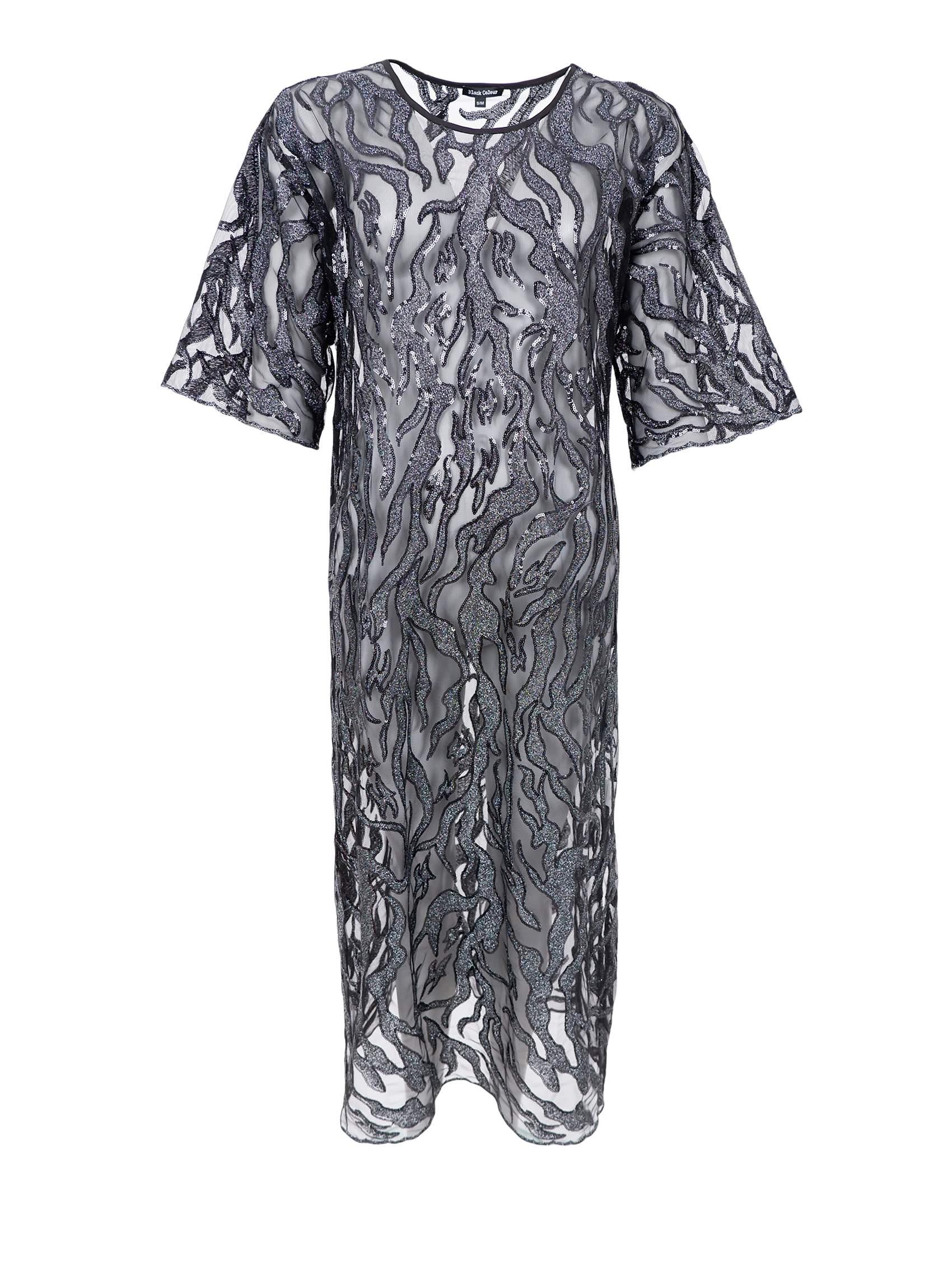 Alveg dásamlegur kjóll frá danska merkinu Black Colour. Hann er úr léttu og þægilegu efni, laus í sniði og er með rúnuðu hálsmáli. Hann er hálfgegnsær, með fallegri blúndu og glimmeri í. Flottur yfir undirkjól eða bara hlýrabol og buxur.
