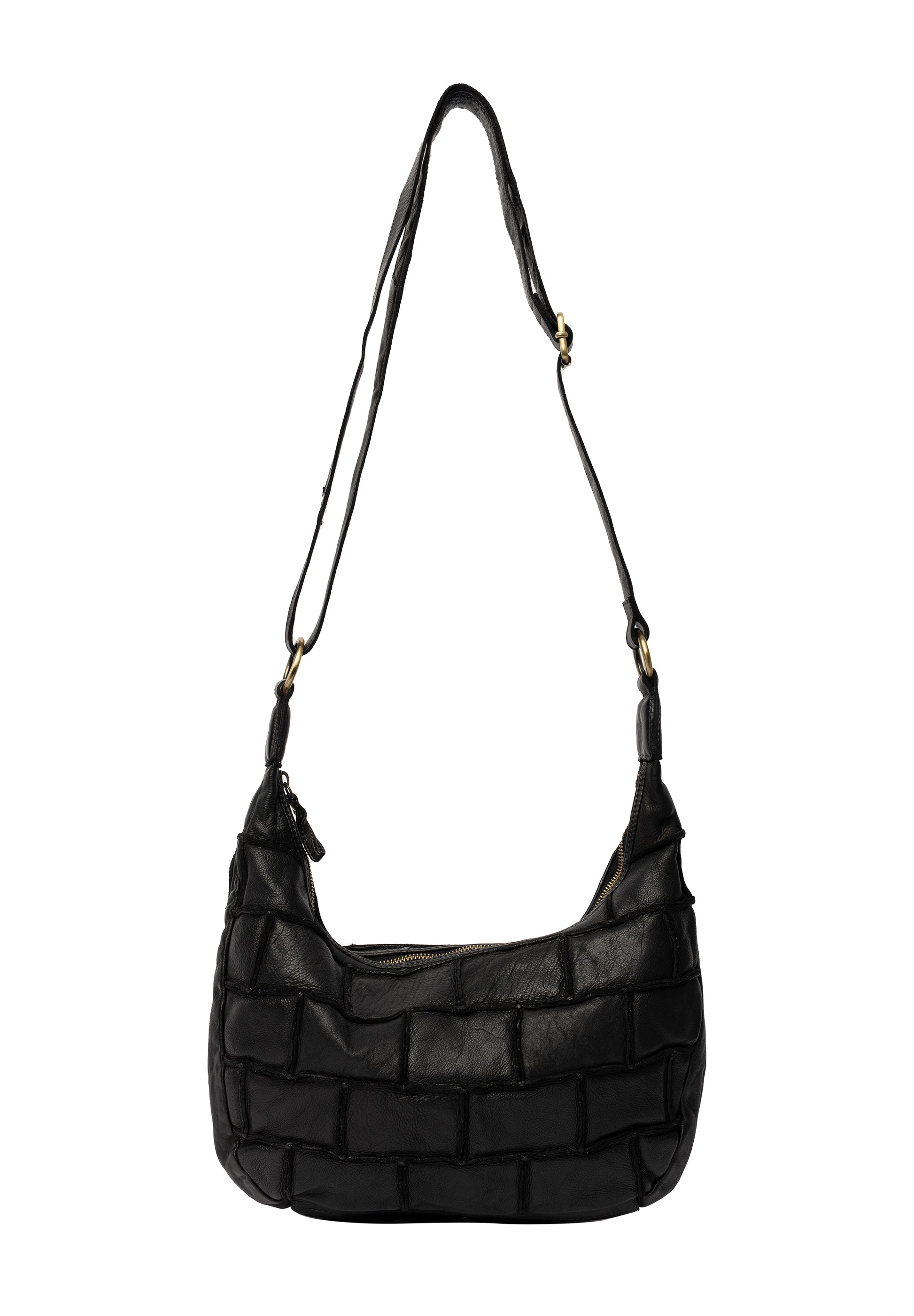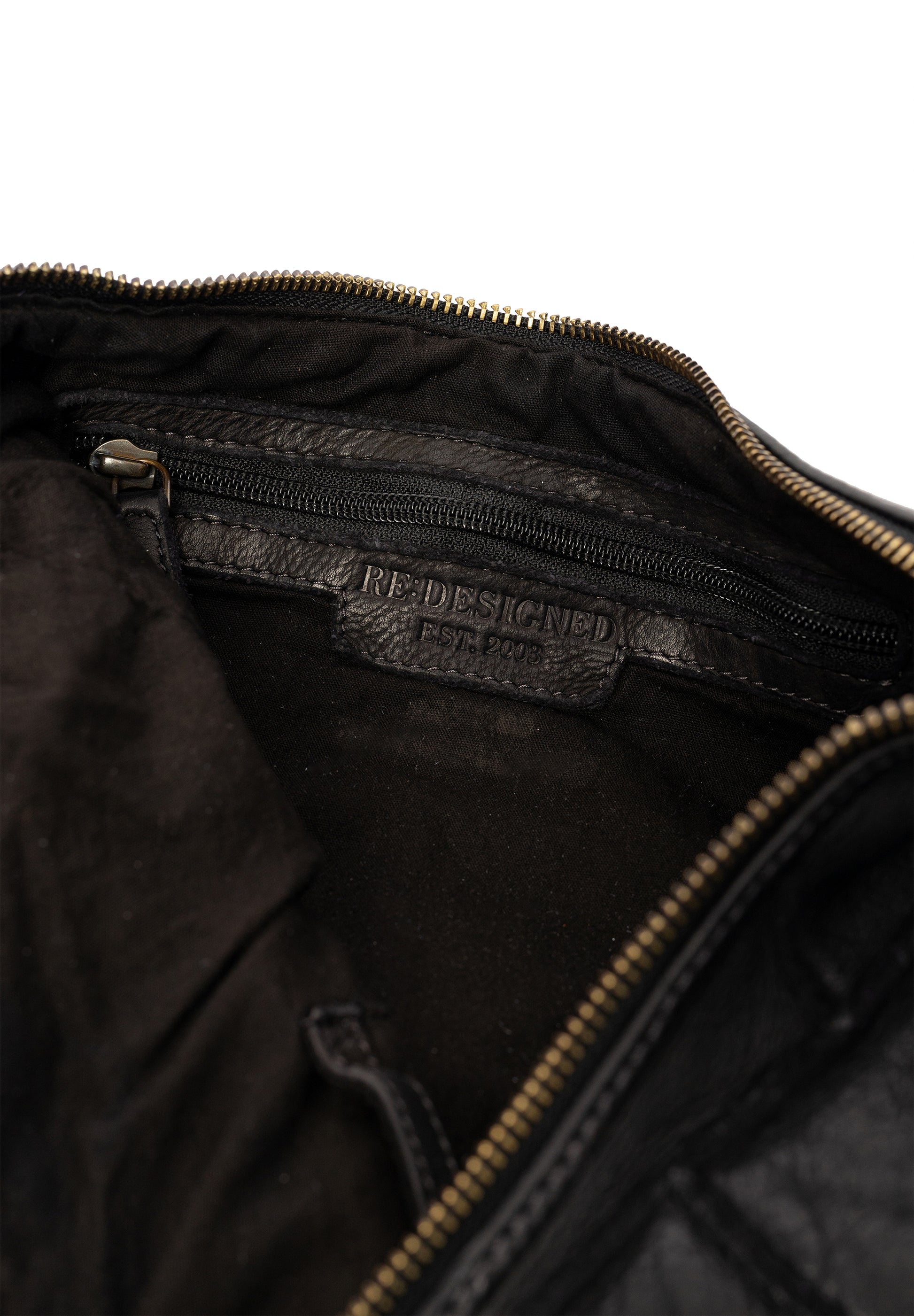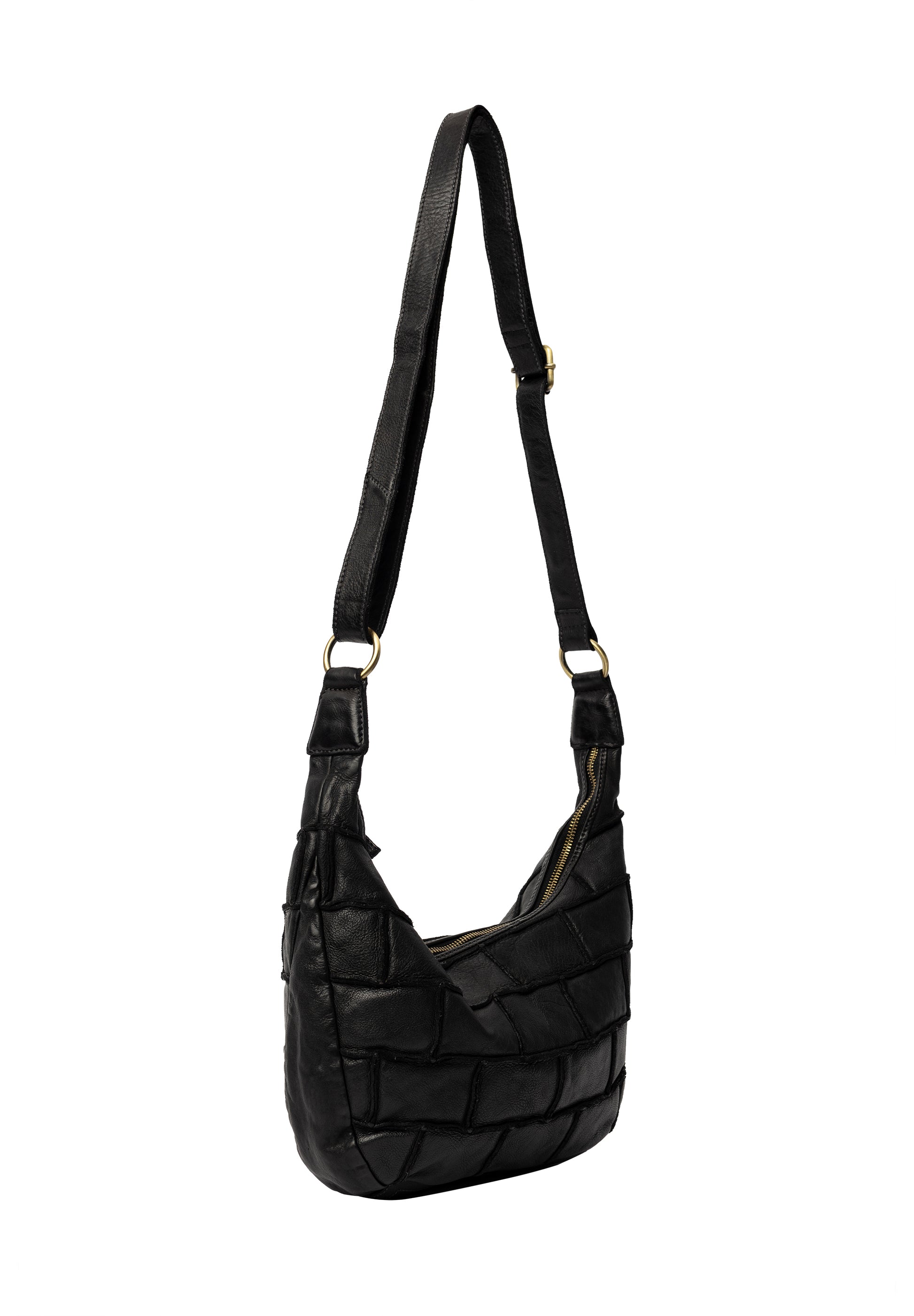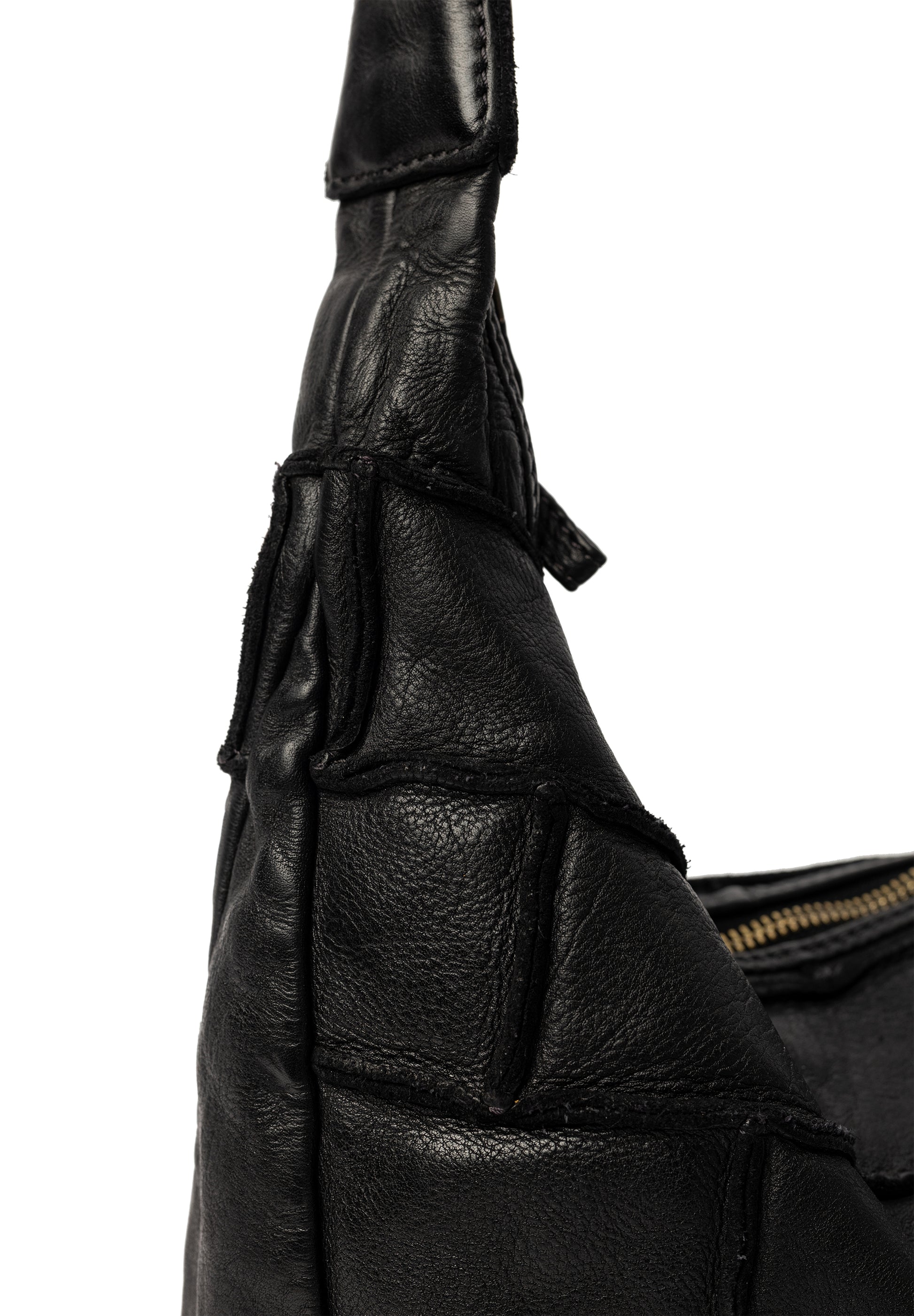 Eitt stórt hólf sem lokast með rennilás. Inní töskunni er svo renndur vasi og tveir litlir opnir vasar. Stillanleg axlaról er á töskunni. Taskan er saumuð saman úr mörgum leðurbútum sem gefur henni einstakt útlit.