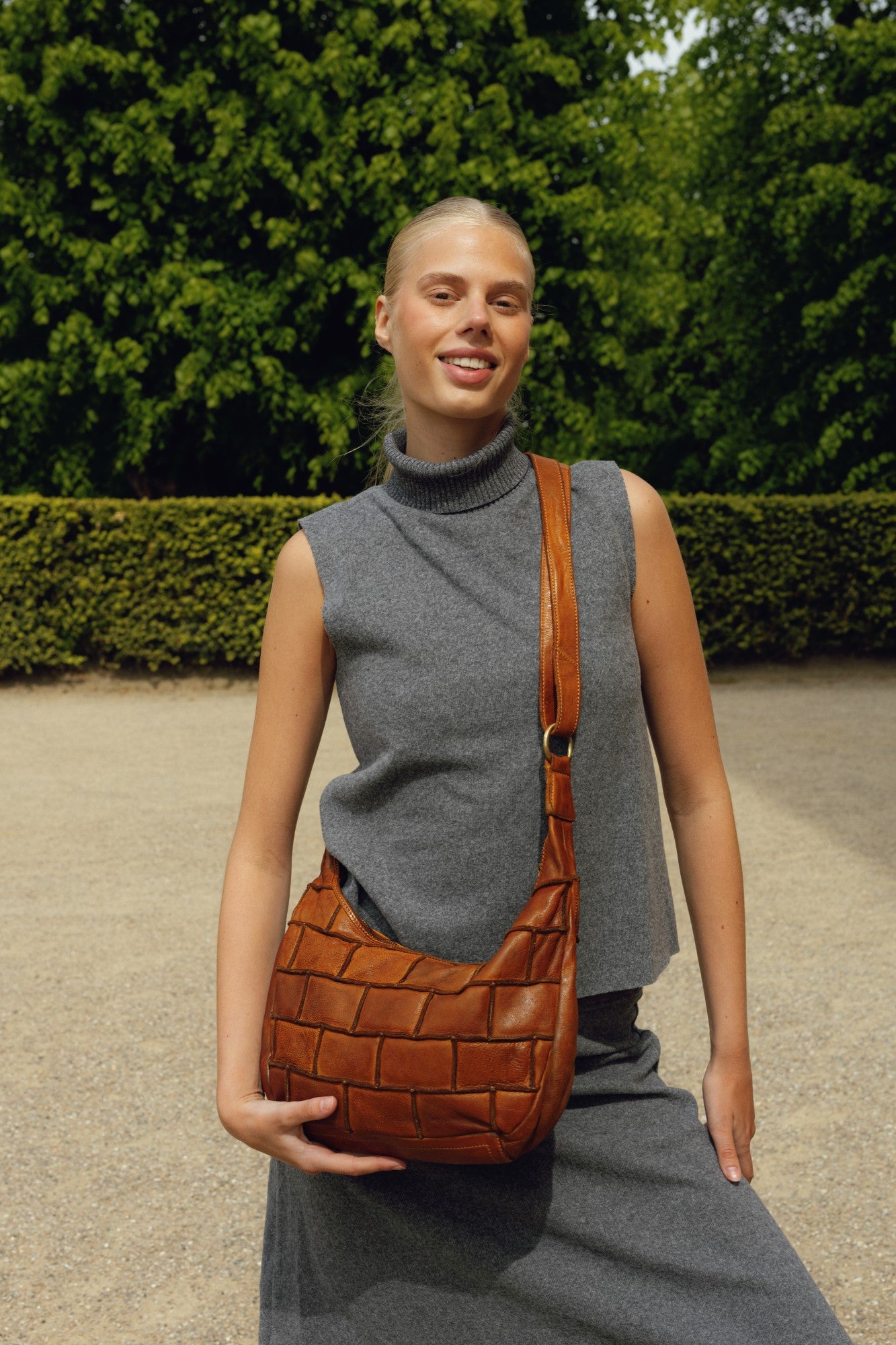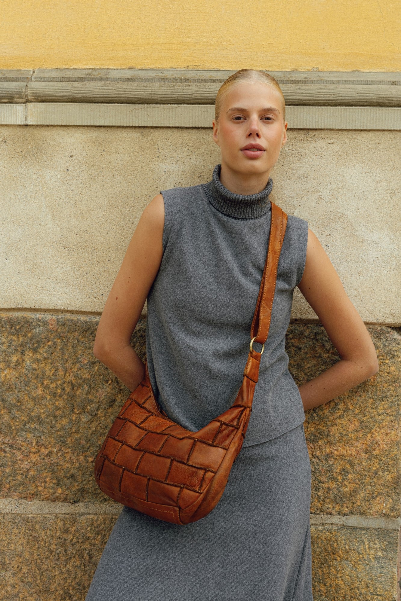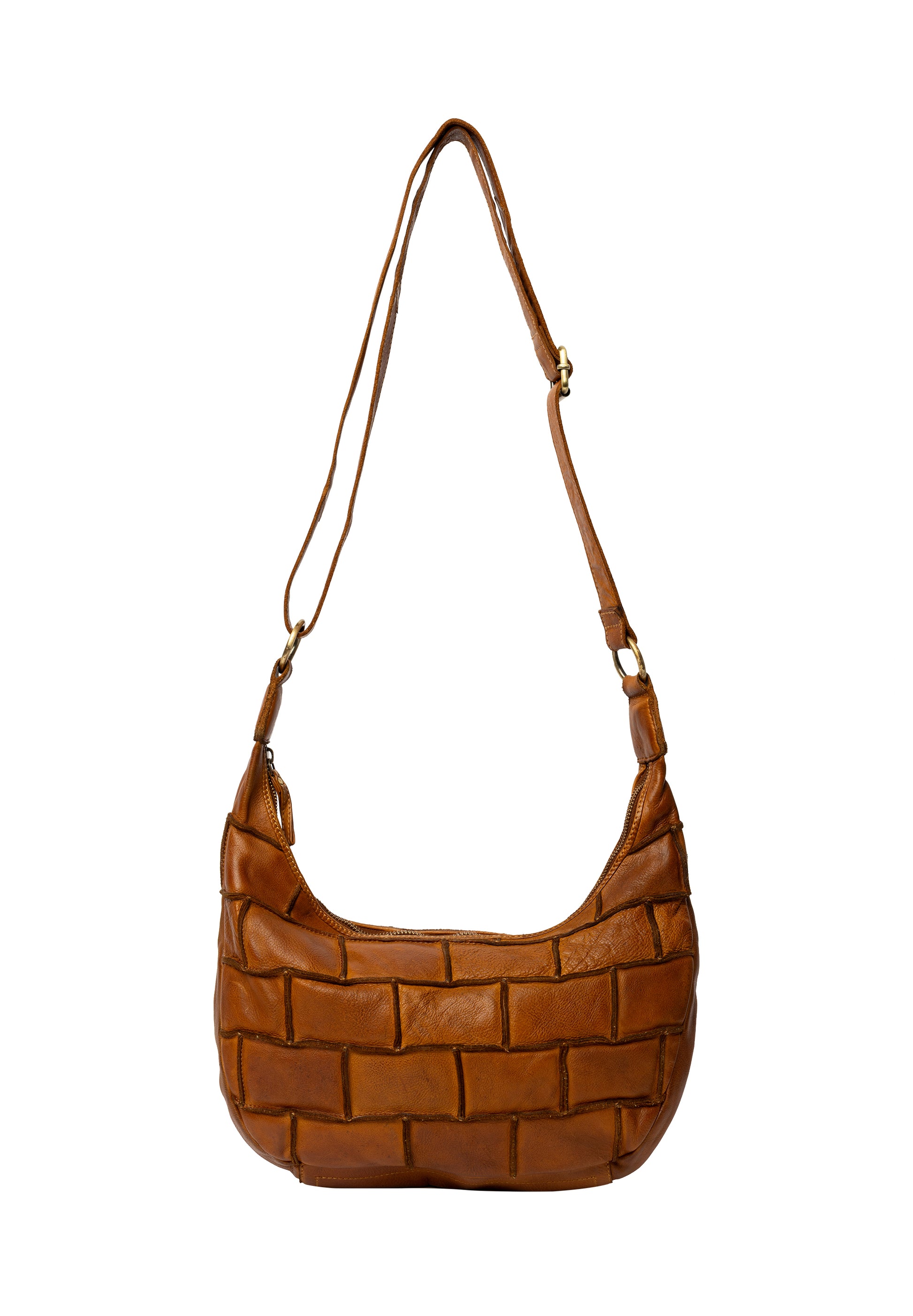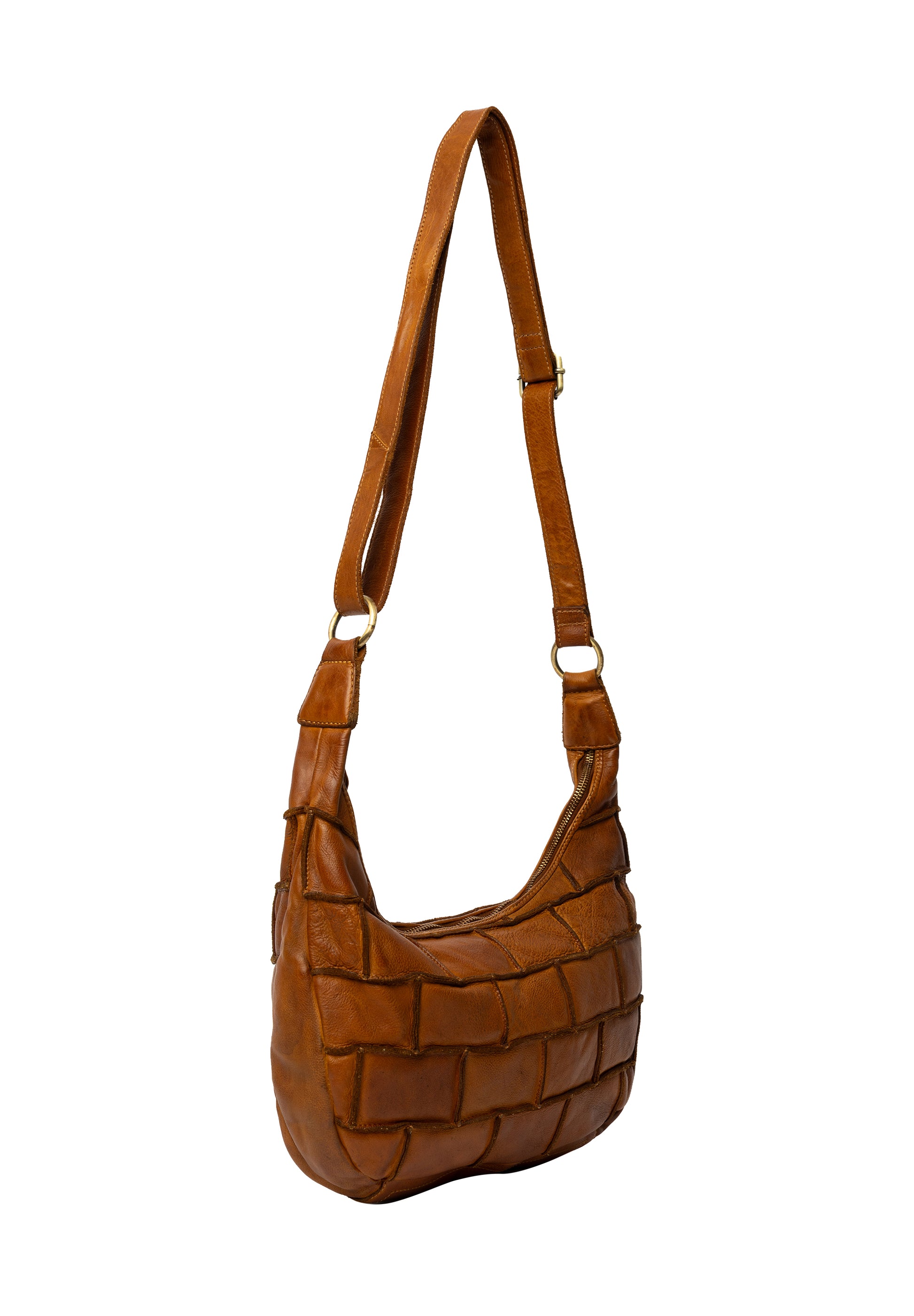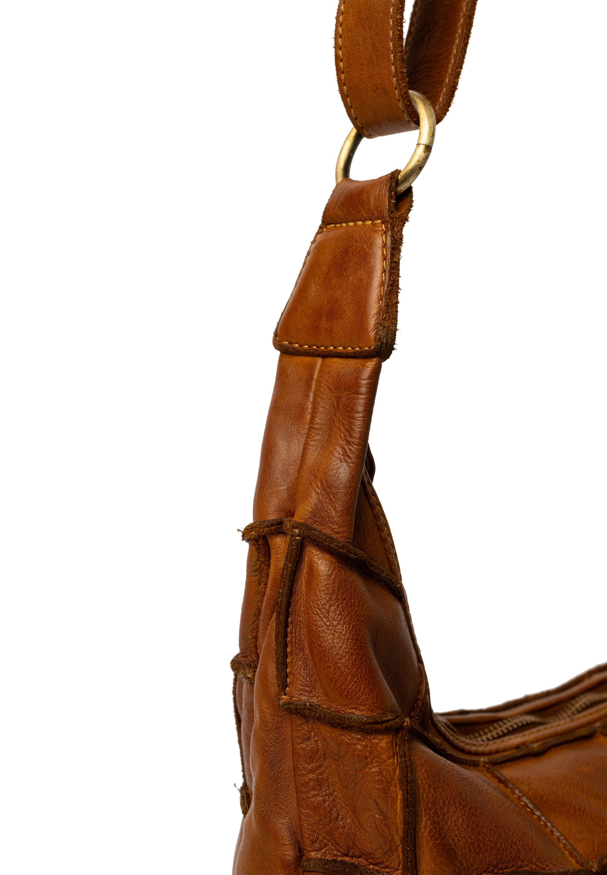 Eitt stórt hólf sem lokast með rennilás. Inní töskunni er svo renndur vasi og tveir litlir opnir vasar. Stillanleg axlaról er á töskunni. Taskan er saumuð saman úr mörgum leðurbútum sem gefur henni einstakt útlit.