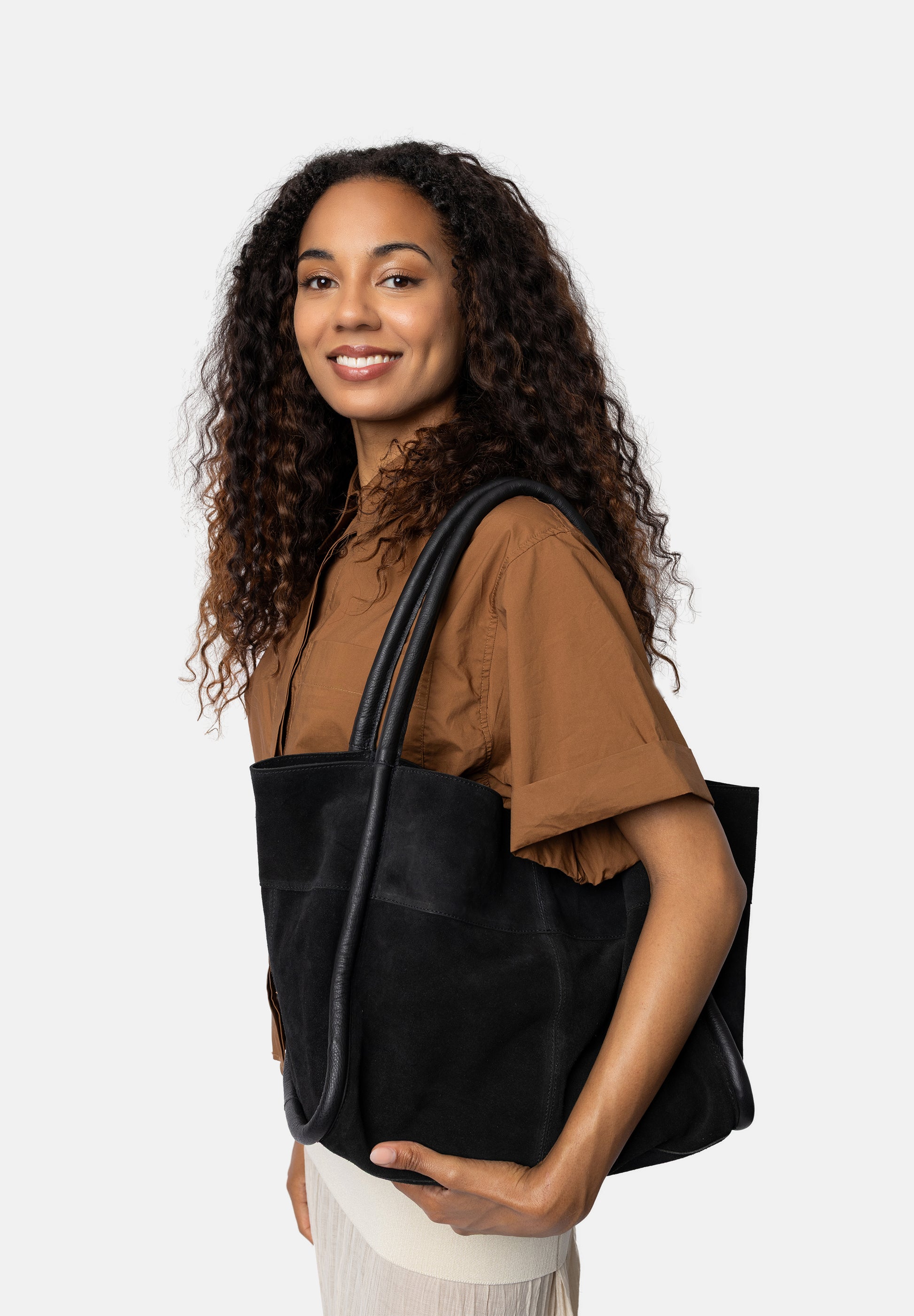 Einstaklega rúmgóð rúskinnstaska með einu stóru hólfi. Inní er renndur vasi og tvö lítil hólf. Taskan lokast með smellu. Þykkt og flott rúskinn með leður axlaról.