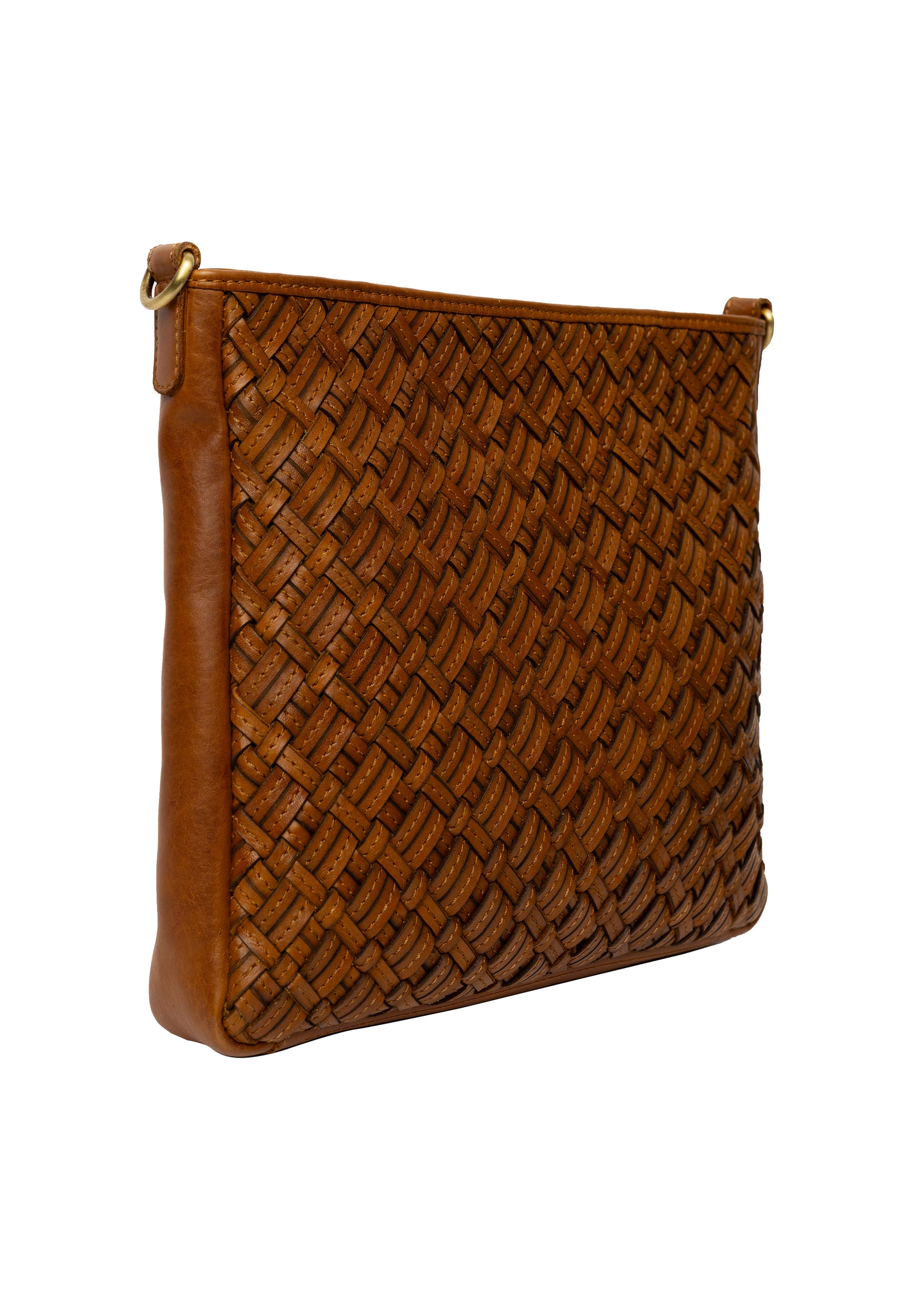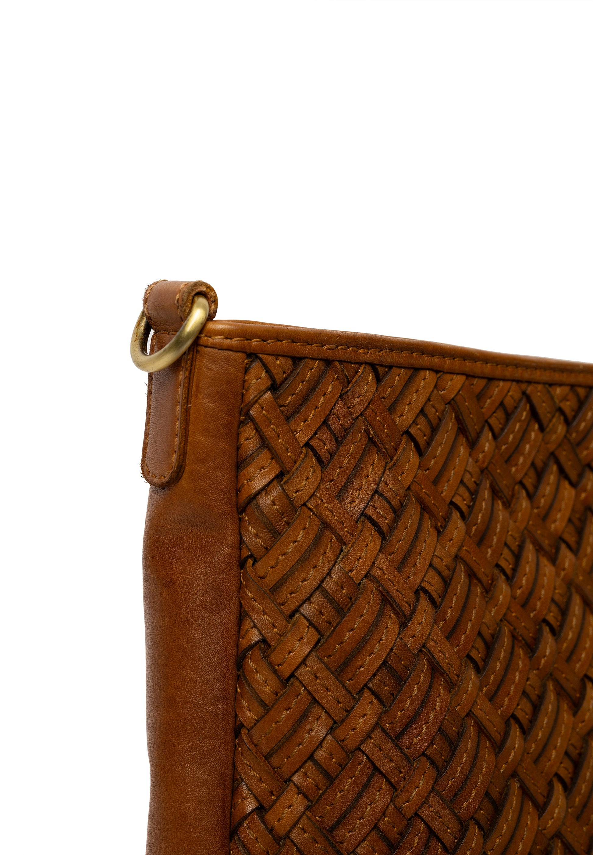 Taskan lokast með rennilás og inní töskunni er renndur vasi ásamt 2 litlum opnum vösum. Taskan er með fléttuðu leðri öðrumegin en slétt á hinni hliðinni, þar er einnig renndur vasi