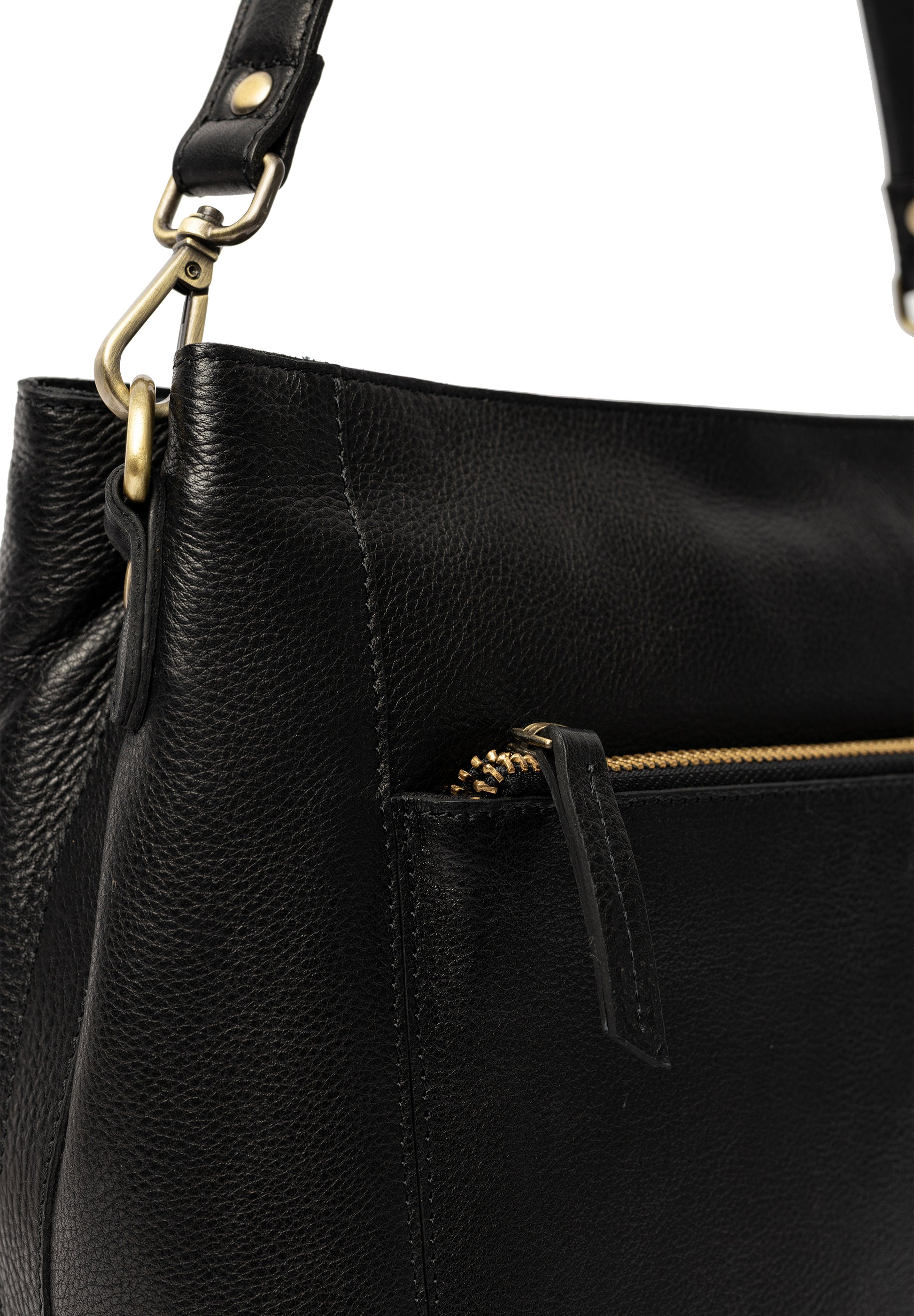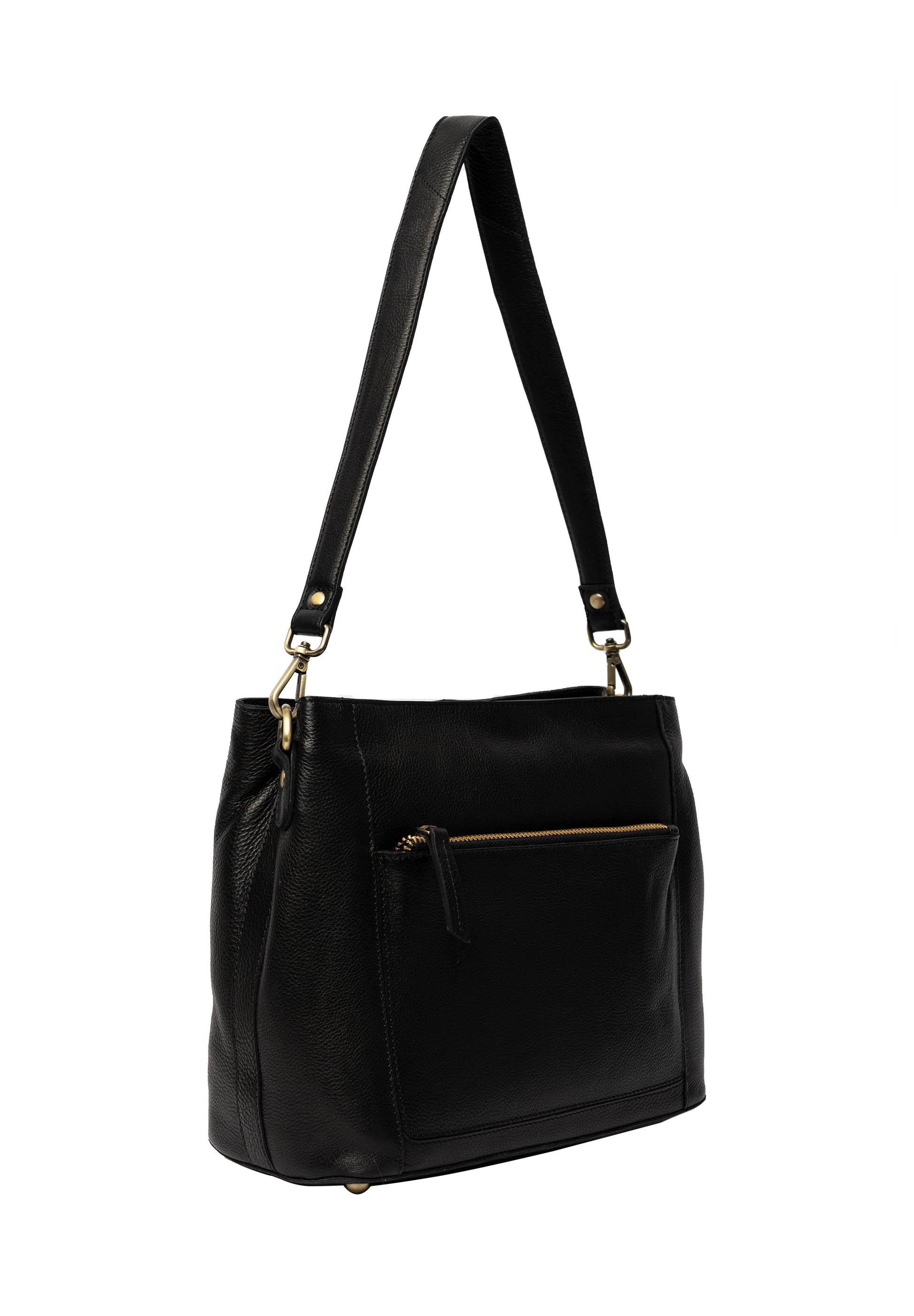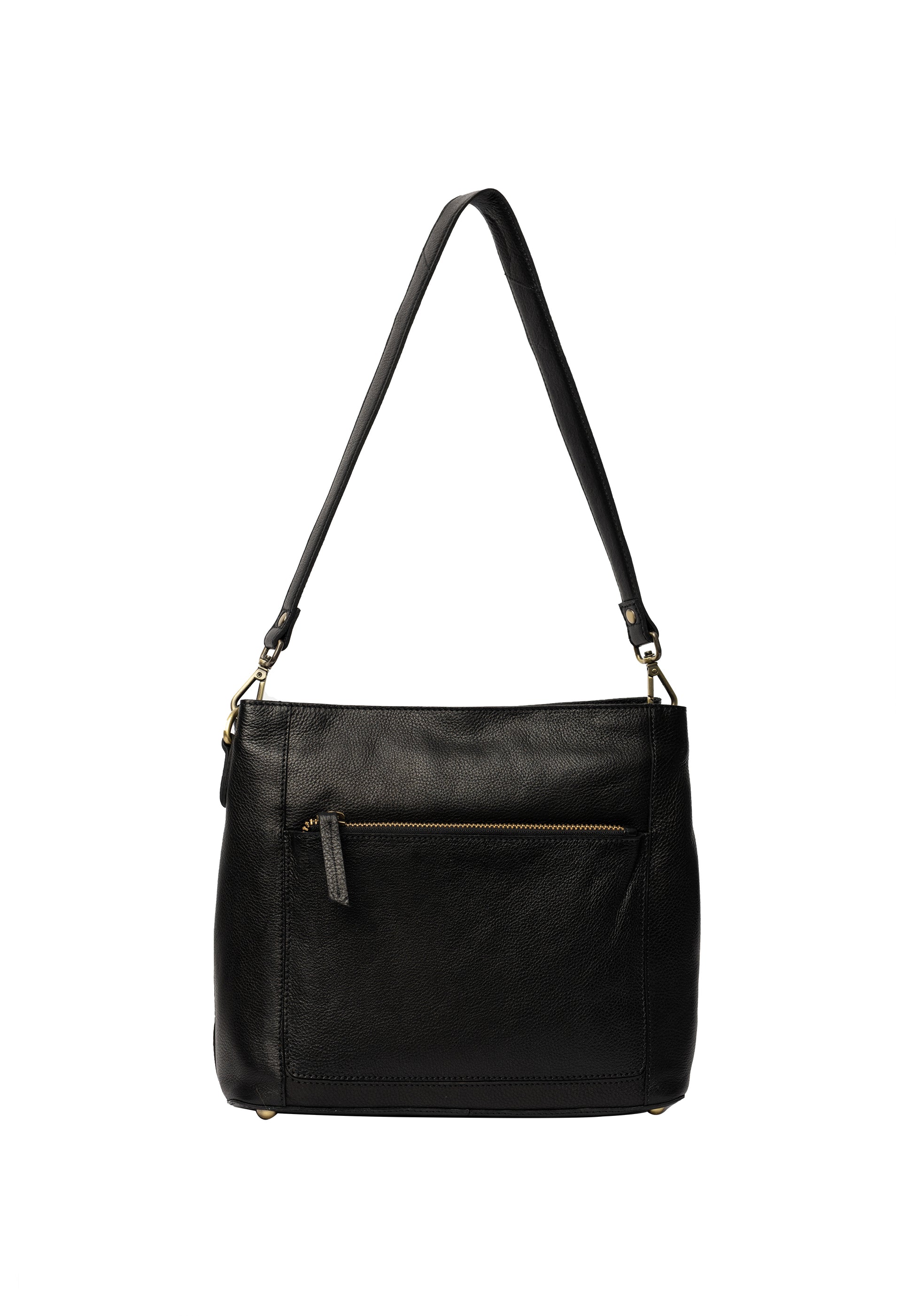 Fullt af hólfum og gott skipulag. Tvö rúmgóð hólf sem lokast með rennilás að ofan. Einnig er renndur vasi bæði að framan og aftaná töskunni. Handtöskuól og löng axlaról fylgja. Kemur einnig í koníaksbrúnu og líka í stærri stærð