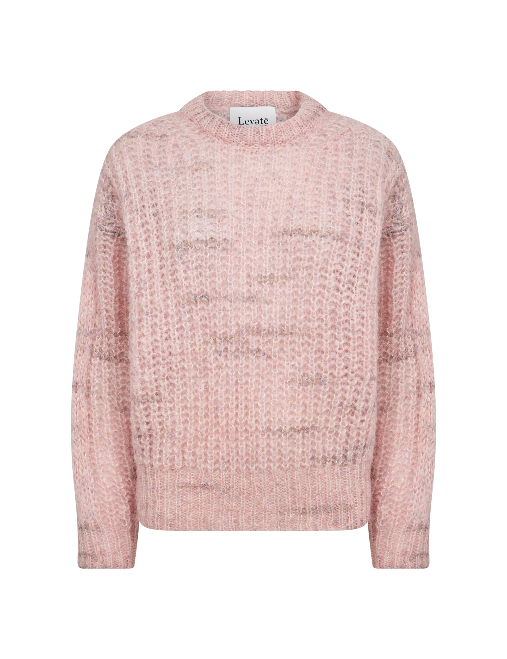 Rúnað hálsmál, beint og frekar vítt snið er á peysunni. Hún er bleik í grunninn en er svo með örlitlu yrjóttu mynstri
