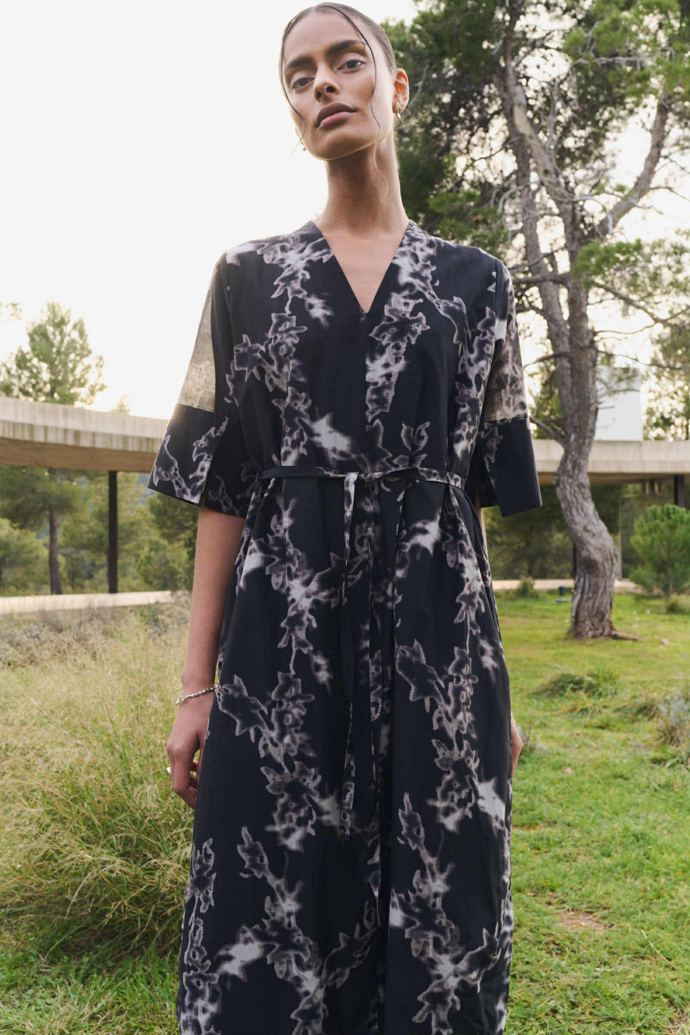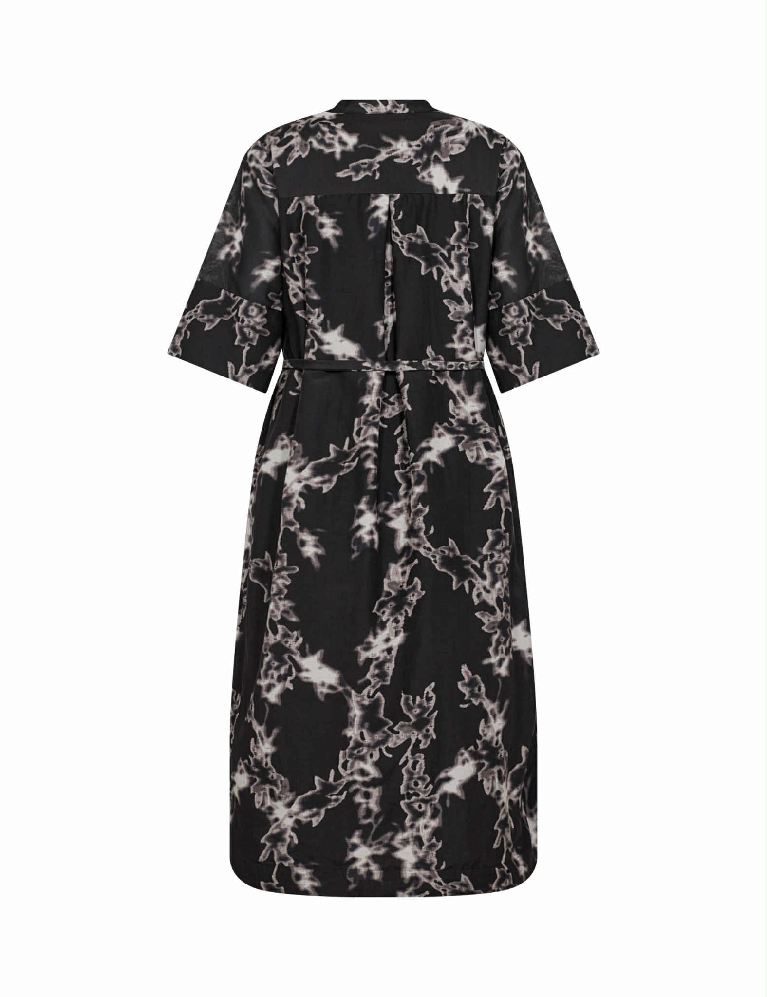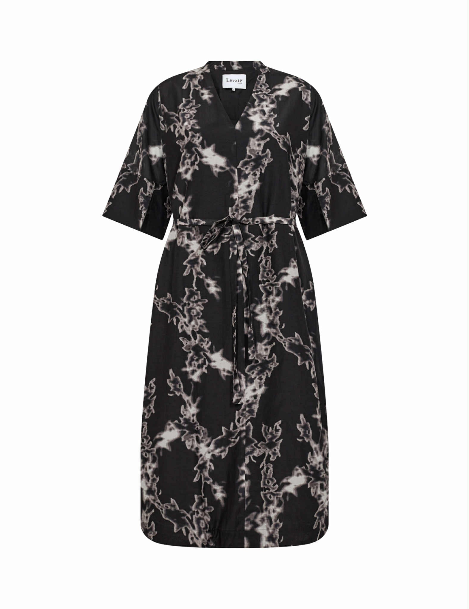 Dásamlega fallegur kjóll frá danska Levete Room. Hann er með v-hálsmáli, stuttum ermum, hnepptur alla leið og með lausu mittisbandi. Svartur í grunninn og með brúnu mynstri.