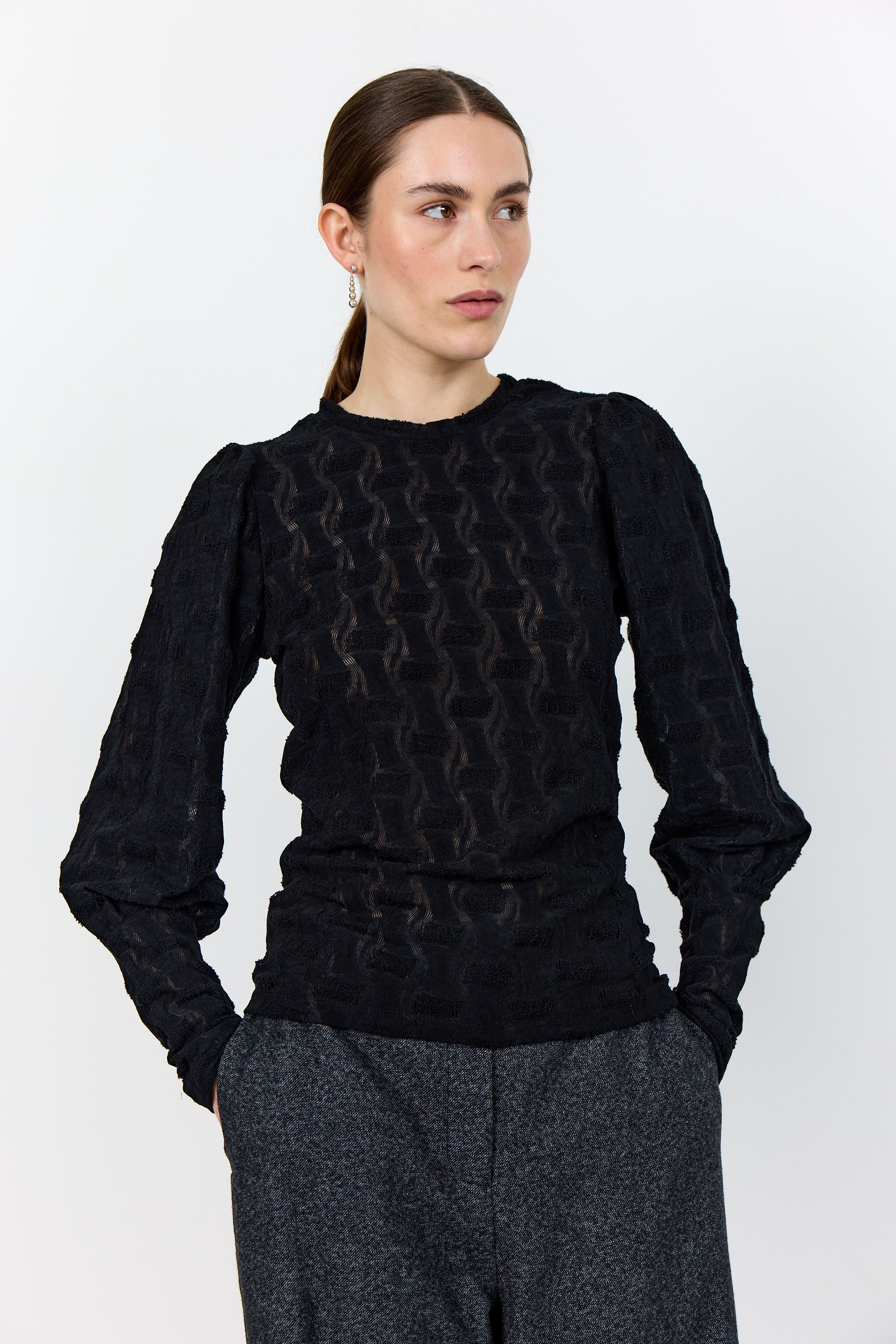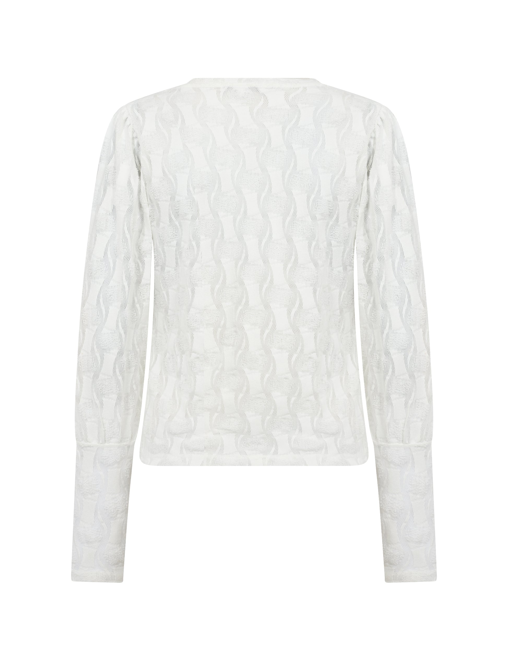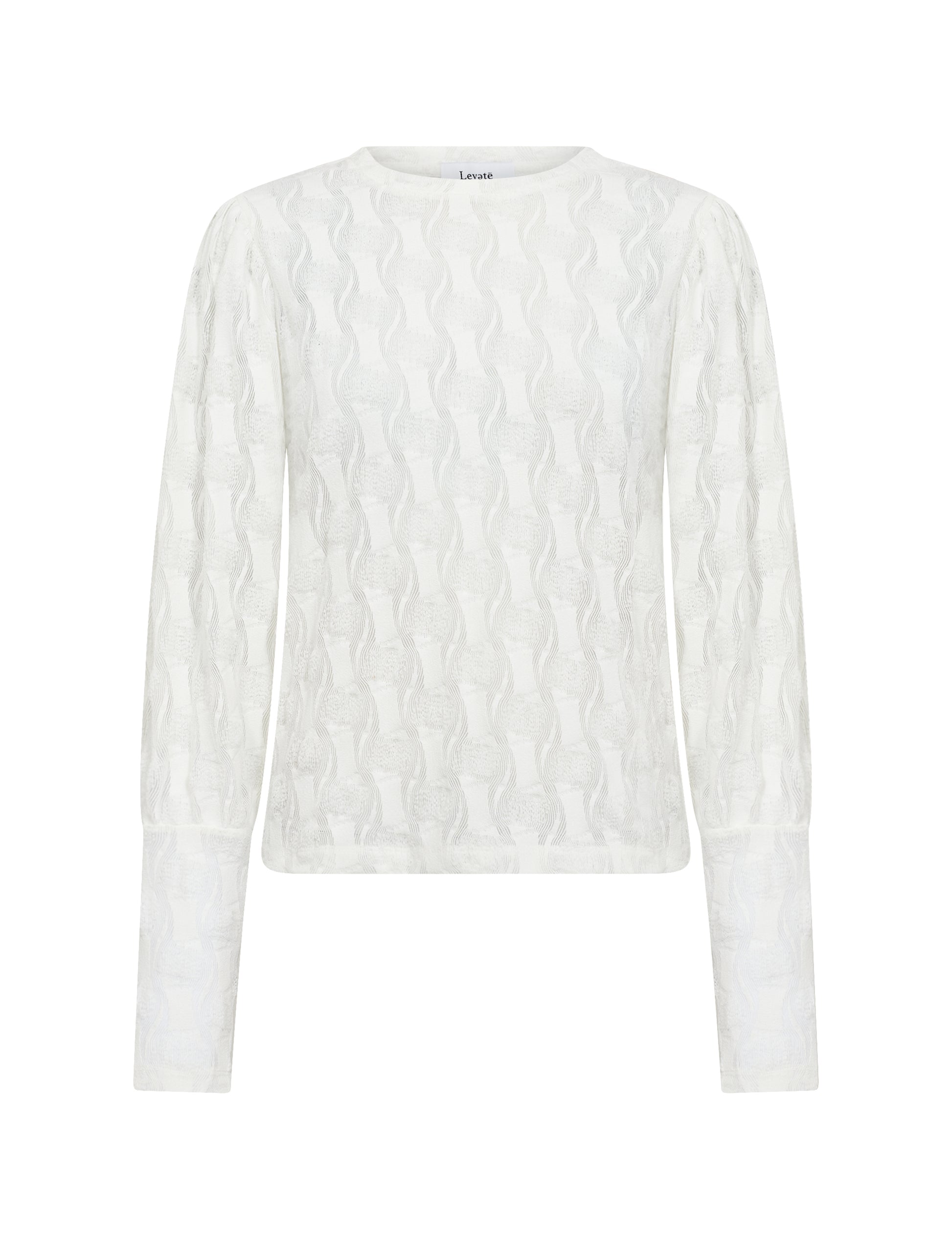 Rúnað hálsmál og frekar þröngt snið á búkinn en svo eru viðar ermar með háu stroffi og örlítið púff á öxlum. Fallegt mynstur er í bolnum en hann er aðeins gegnsær. Mjög góð teygja er í bolnum.
