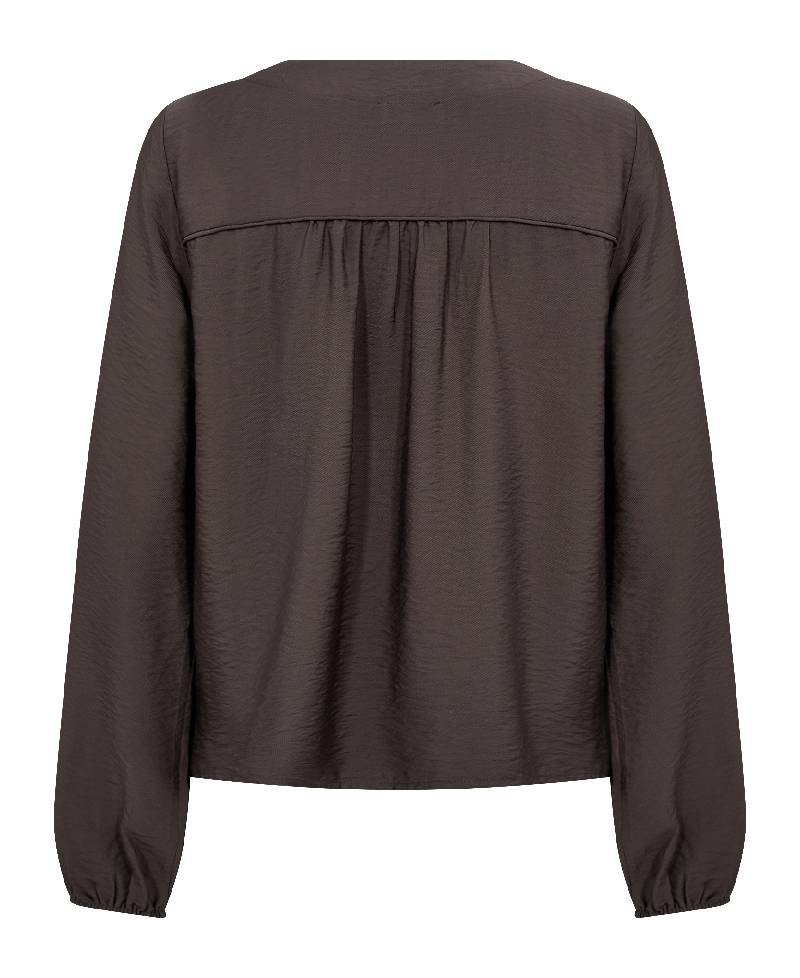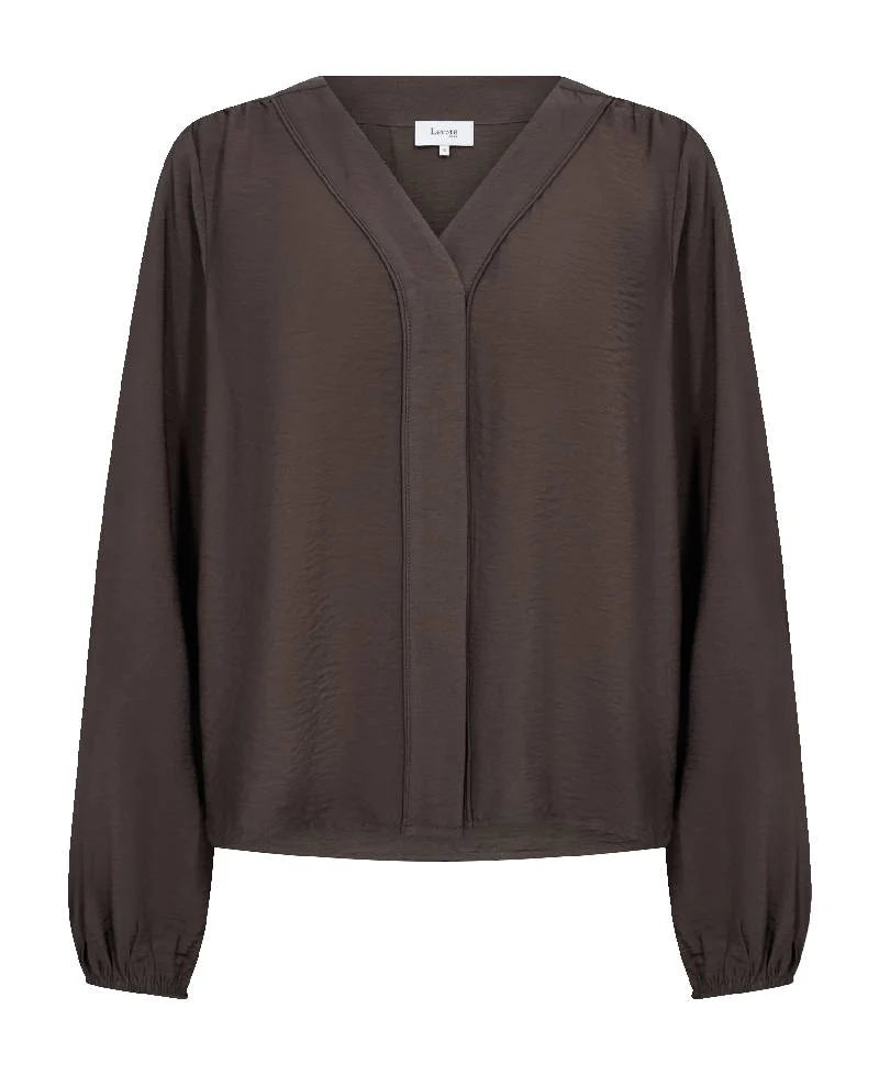 Falleg og klassísk blússa frá danska merkinu Levete Room. Hún er með v-hálsmáli, laus í sniði og hneppt alla leið.