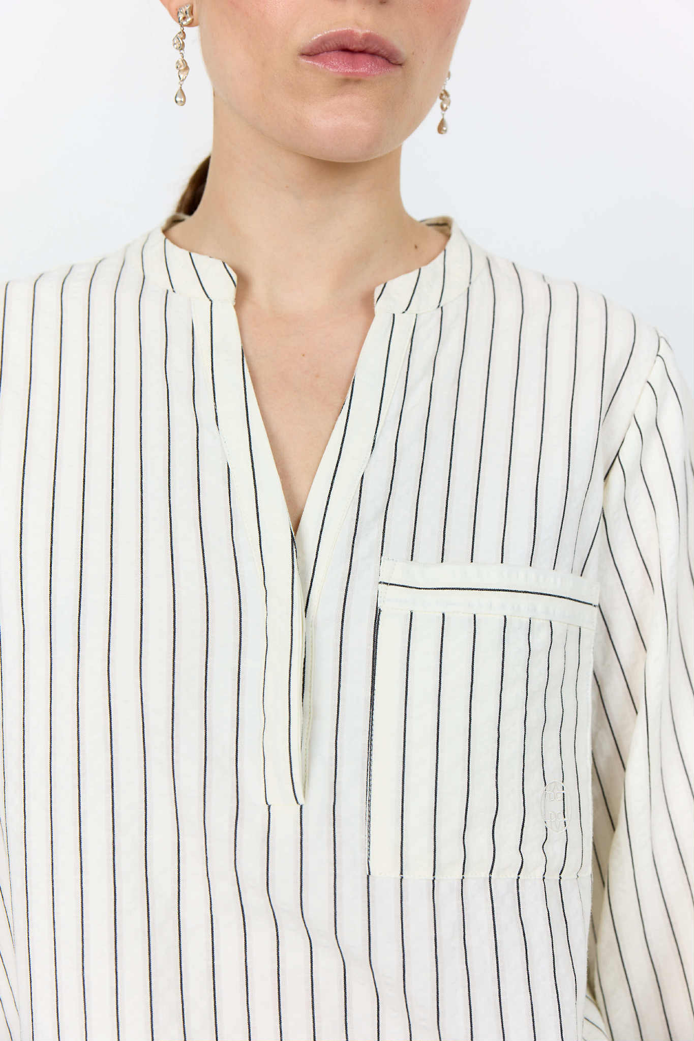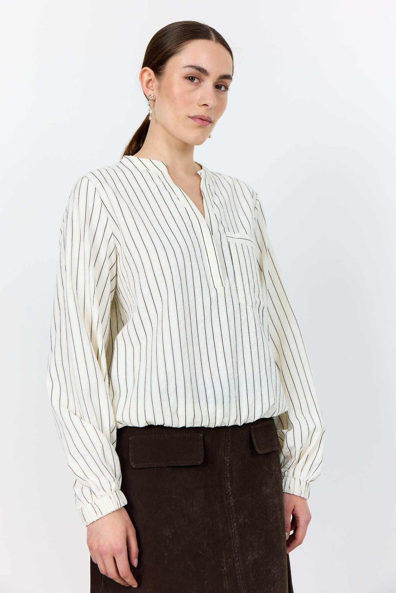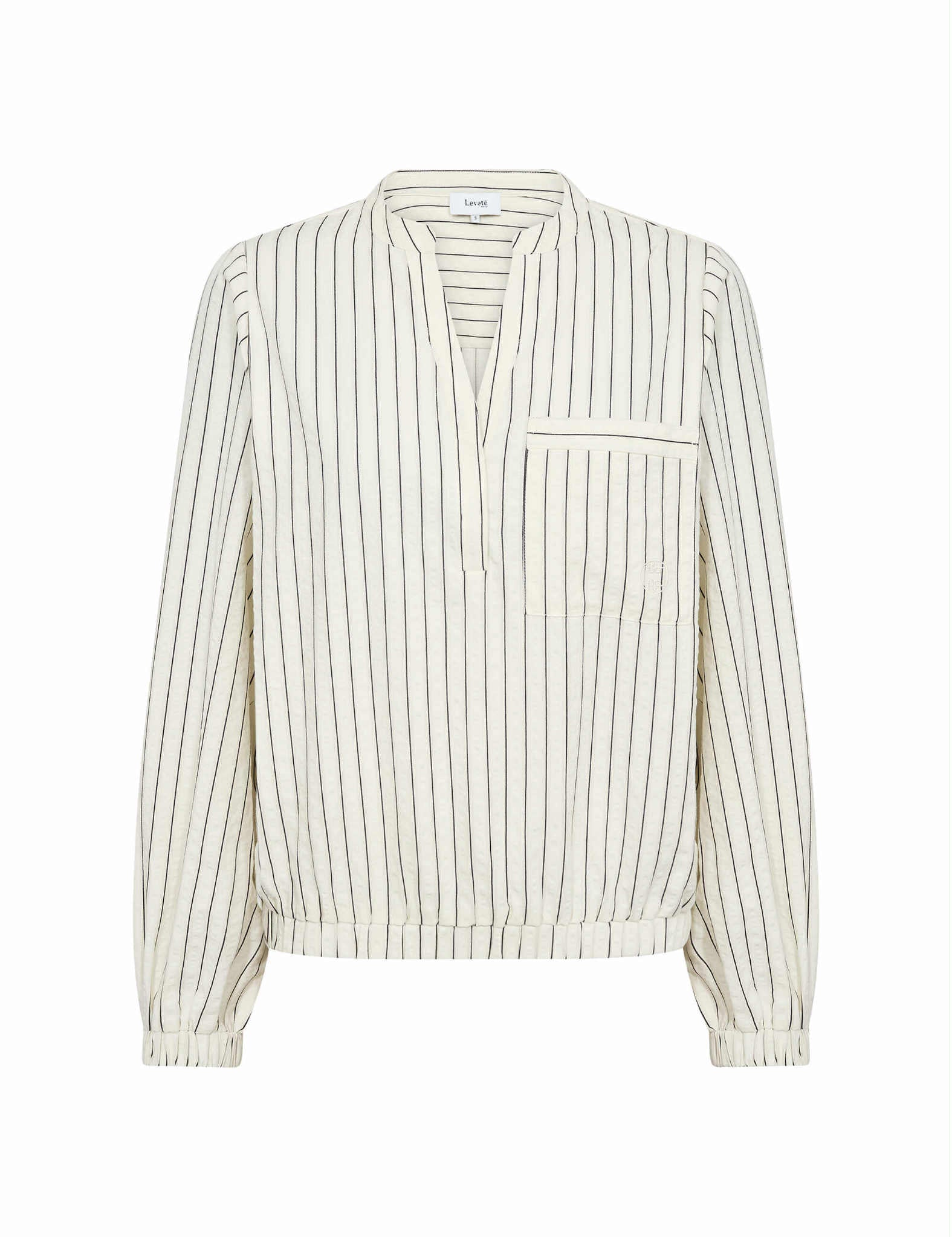 Sæt blússa frá danska merkinu Levete Room. Hún er með v-hálsmáli, laus í sniði og með teygju á ermunum.