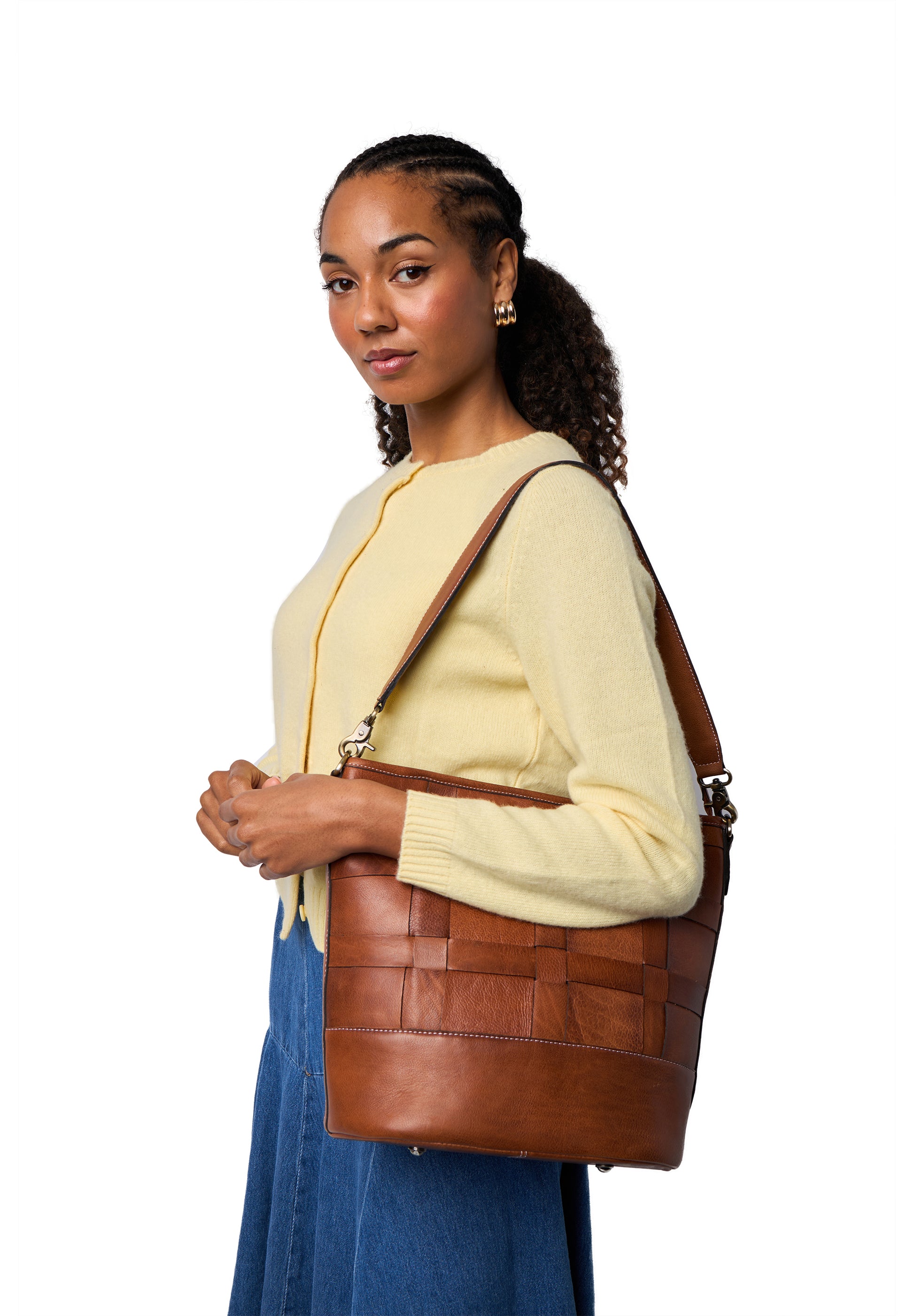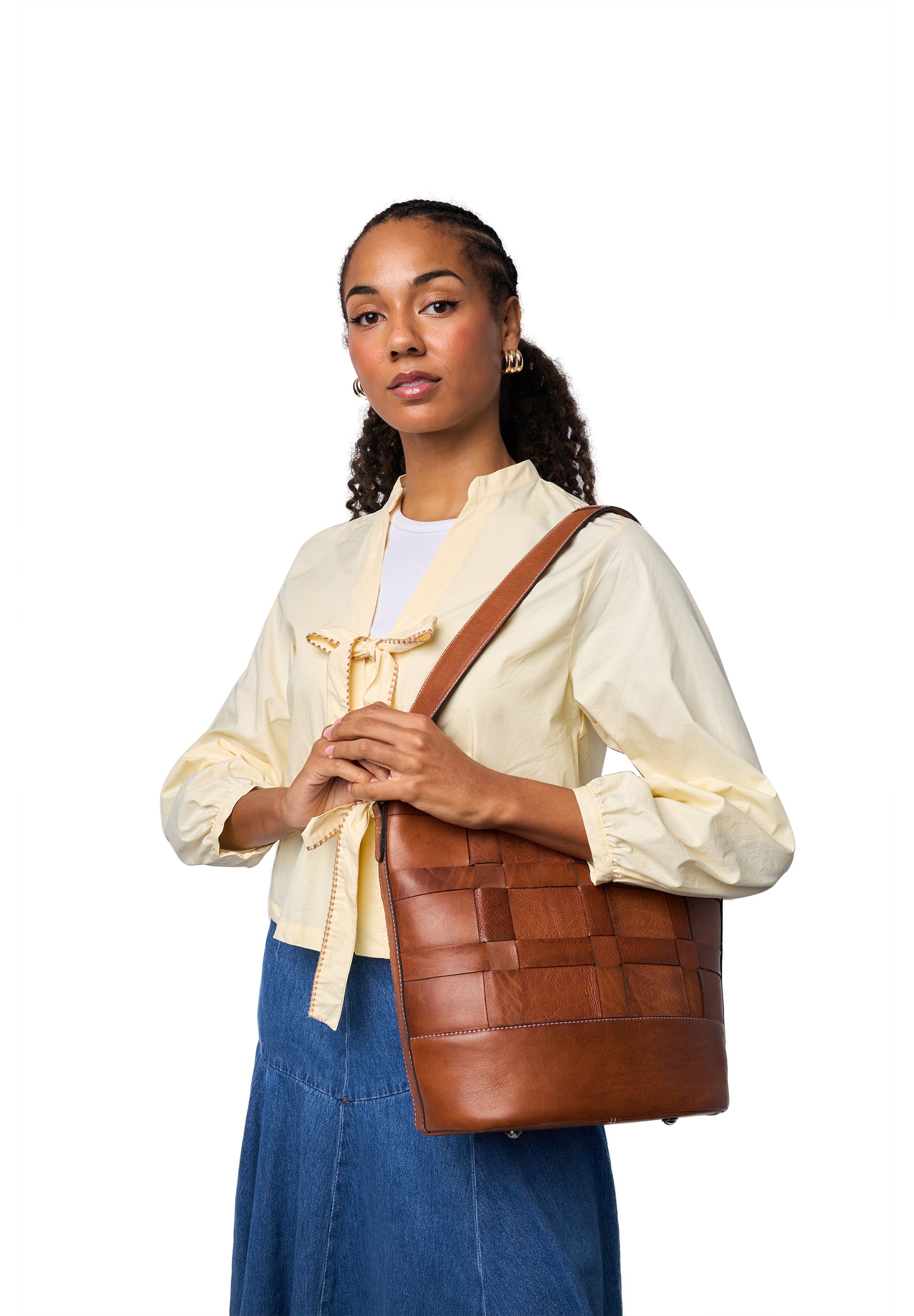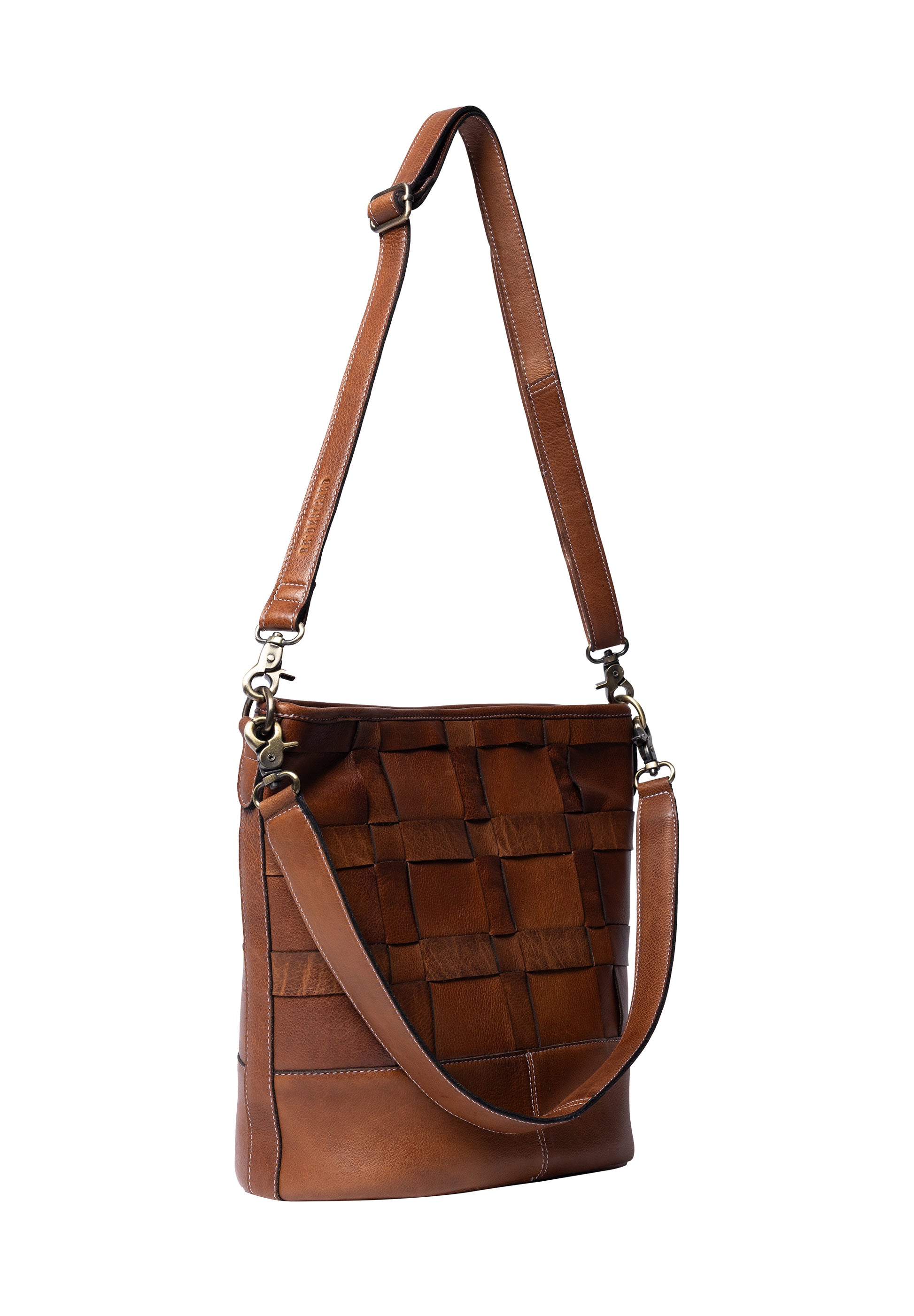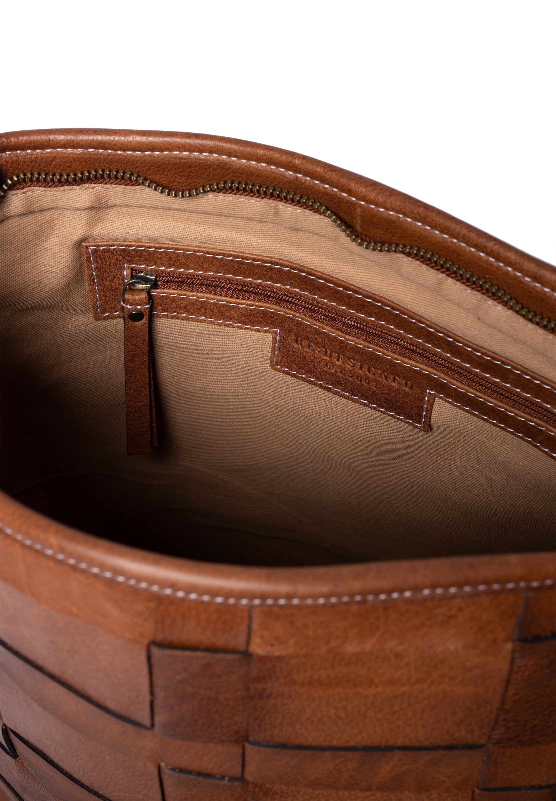 Rúmgóð shopper leðurtaska með stóru hólfi. Lítill renndur vasi er inní töskunni og tveir litlir vasar. Hún lokast að ofan með rennilás. Tvær ólar fylgja með, annars vegar há axlaról en einnig löng stillanleg axlaról. Fléttað leðrið gefur töskunni einstakt útlit. Þessi kemur einnig í woodsmoke lit (dökkbrúnn)