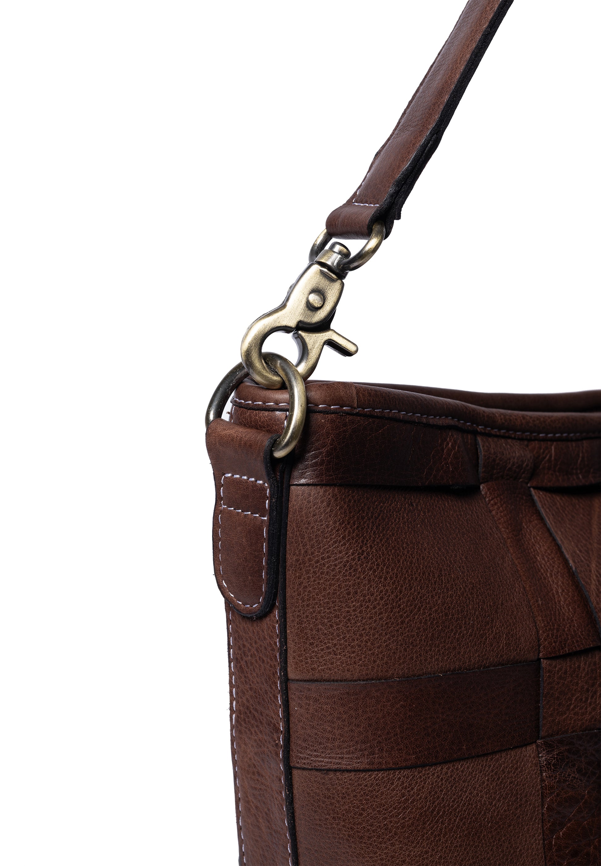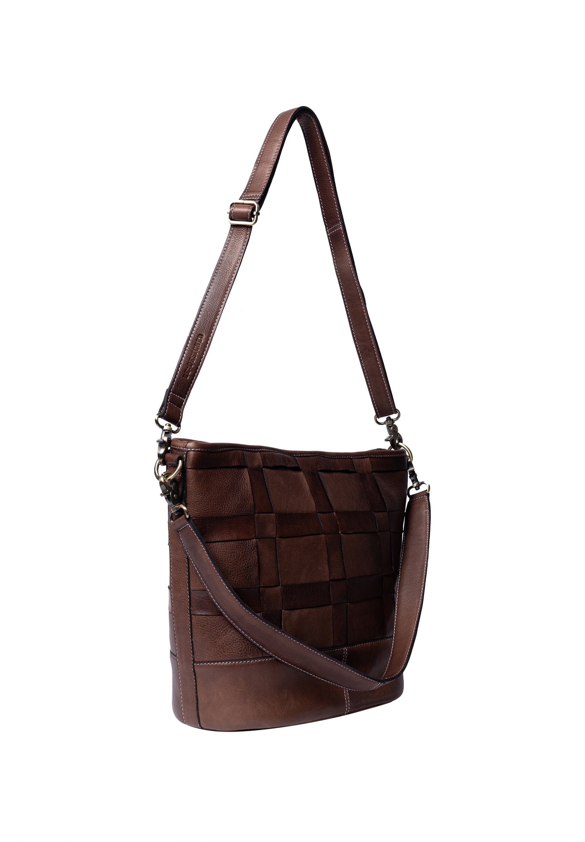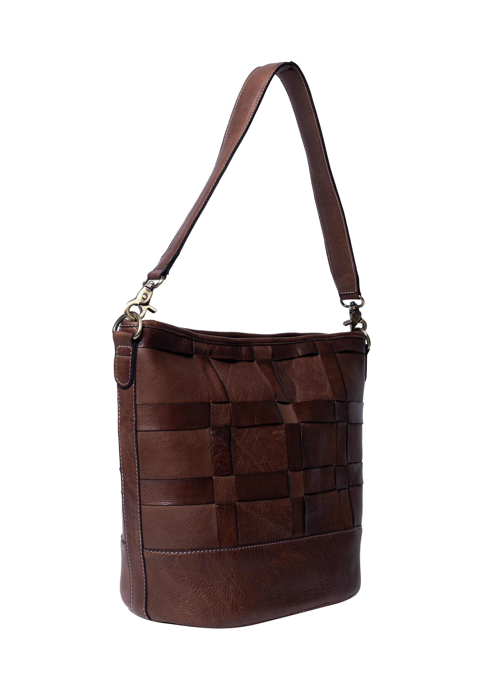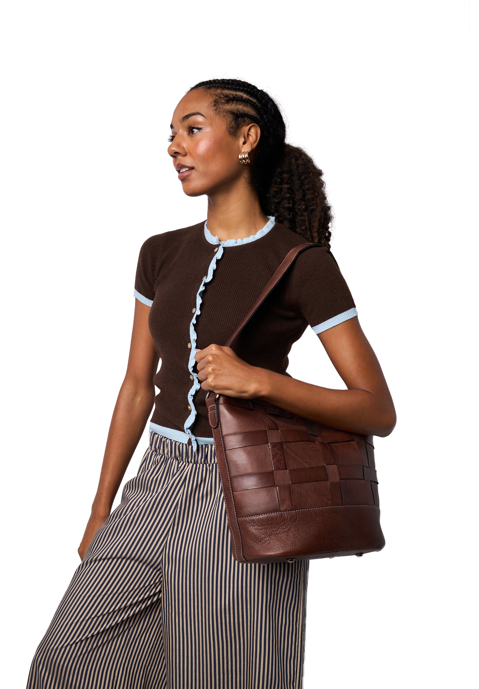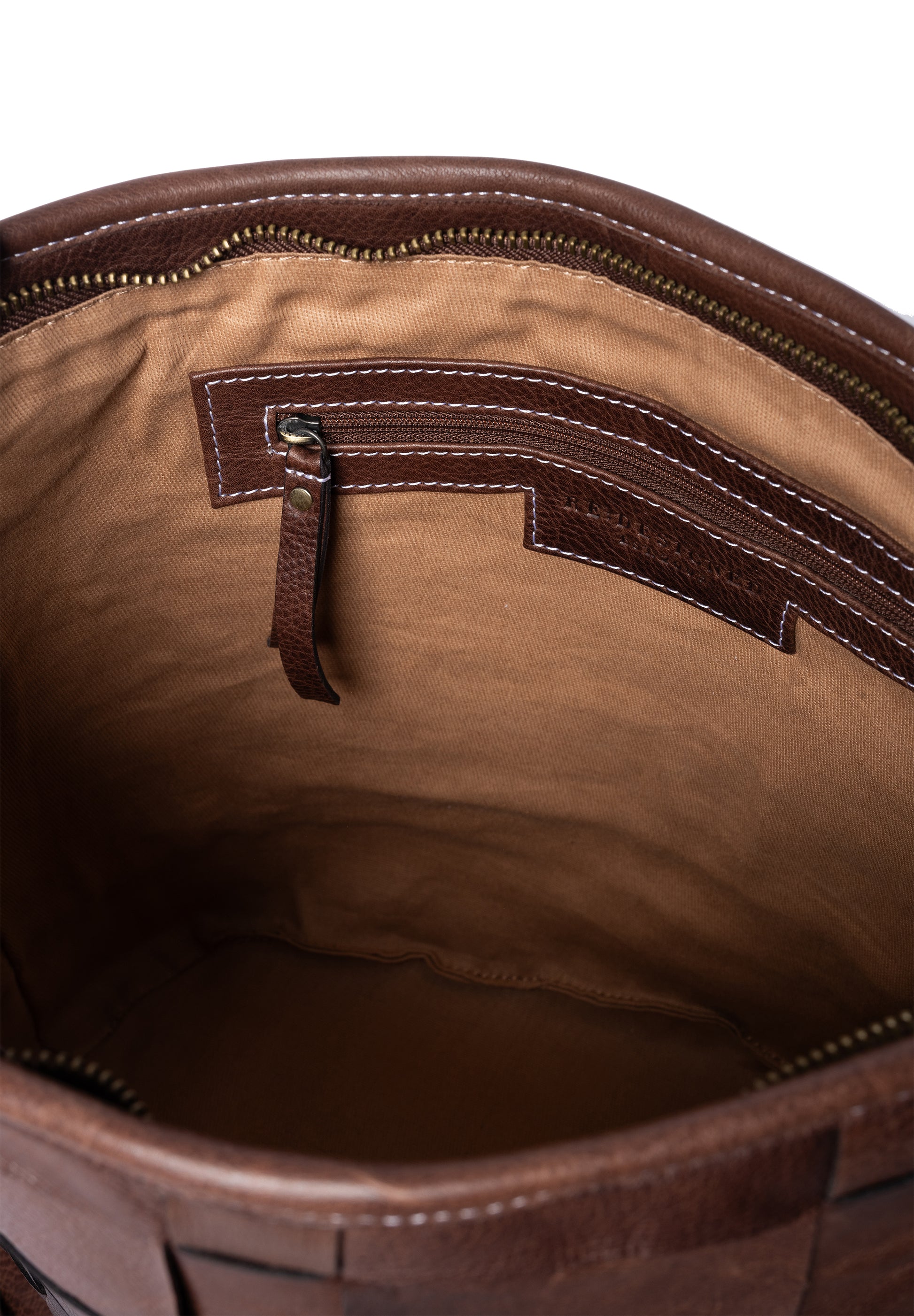 Rúmgóð shopper leðurtaska með stóru hólfi. Lítill renndur vasi er inní töskunni og tveir litlir vasar. Hún lokast að ofan með rennilás. Tvær ólar fylgja með, annars vegar há axlaról en einnig löng stillanleg axlaról. Fléttað leðrið gefur töskunni einstakt útlit. Þessi kemur einnig í walnut brúnum lit.