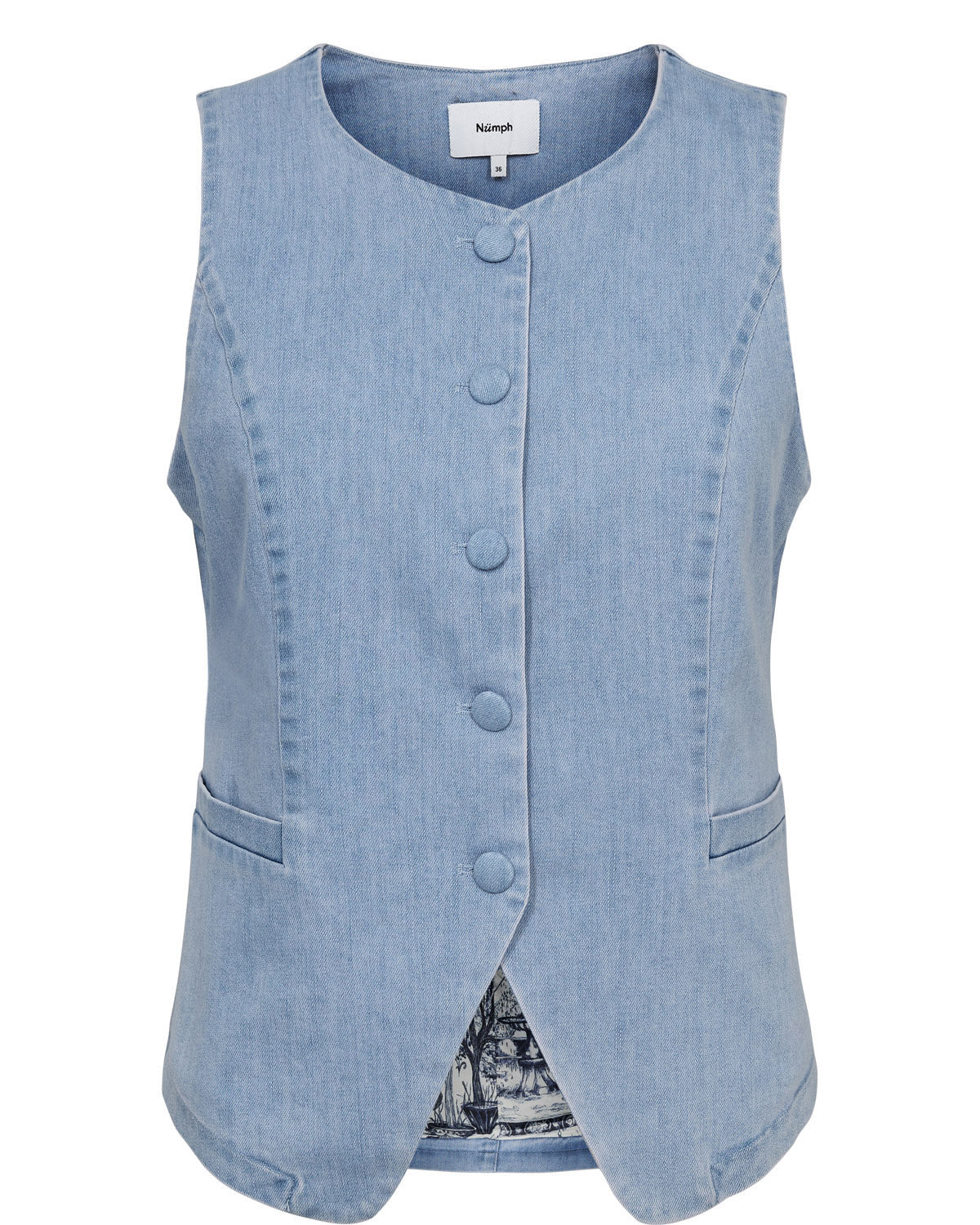 Æðislegt gallavesti frá danska merkinu Nümph. Það er aðsniðið, hneppt alla leið og með rúnuðu hálsmáli. Nümph er þekkt fyrir fallega "details".