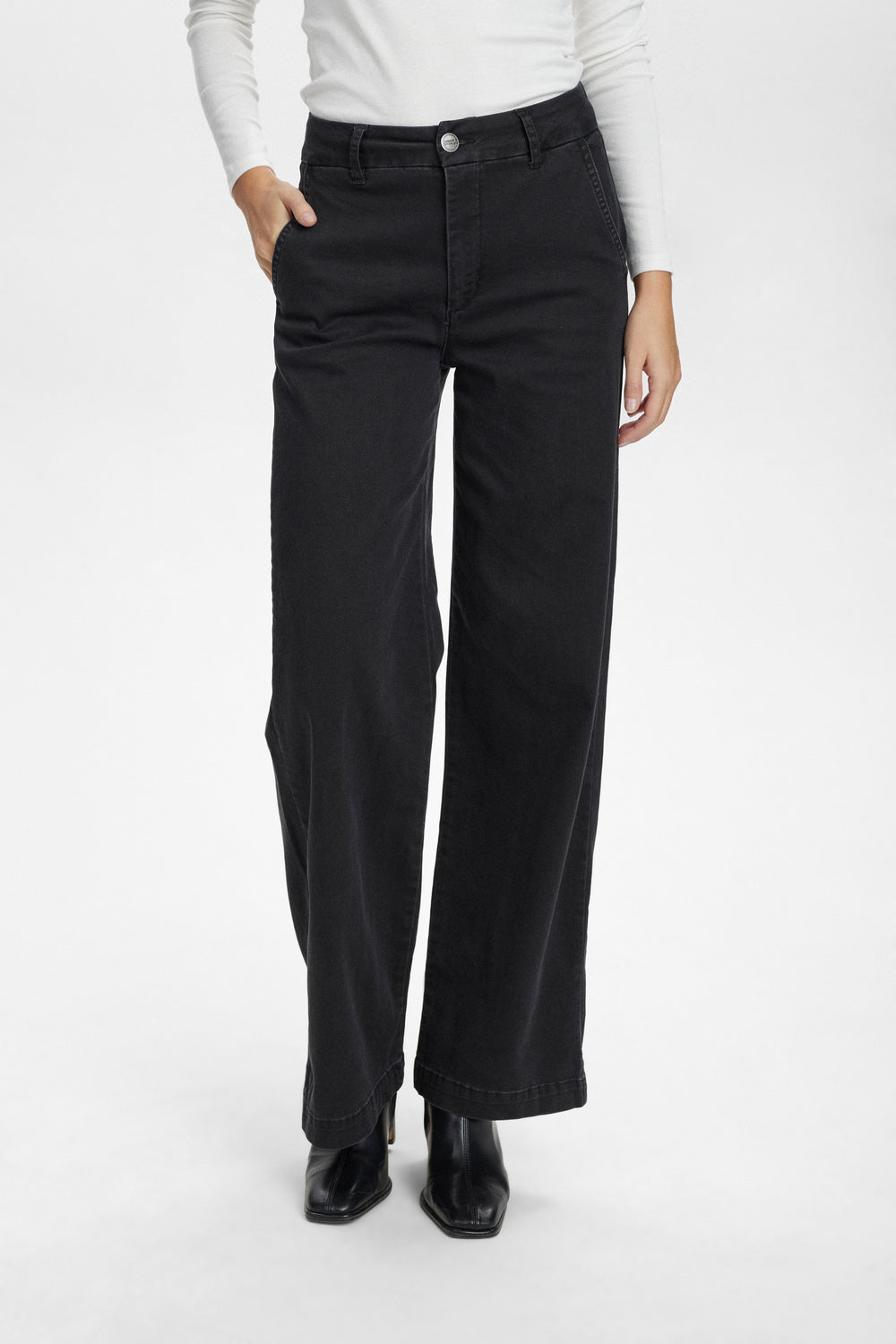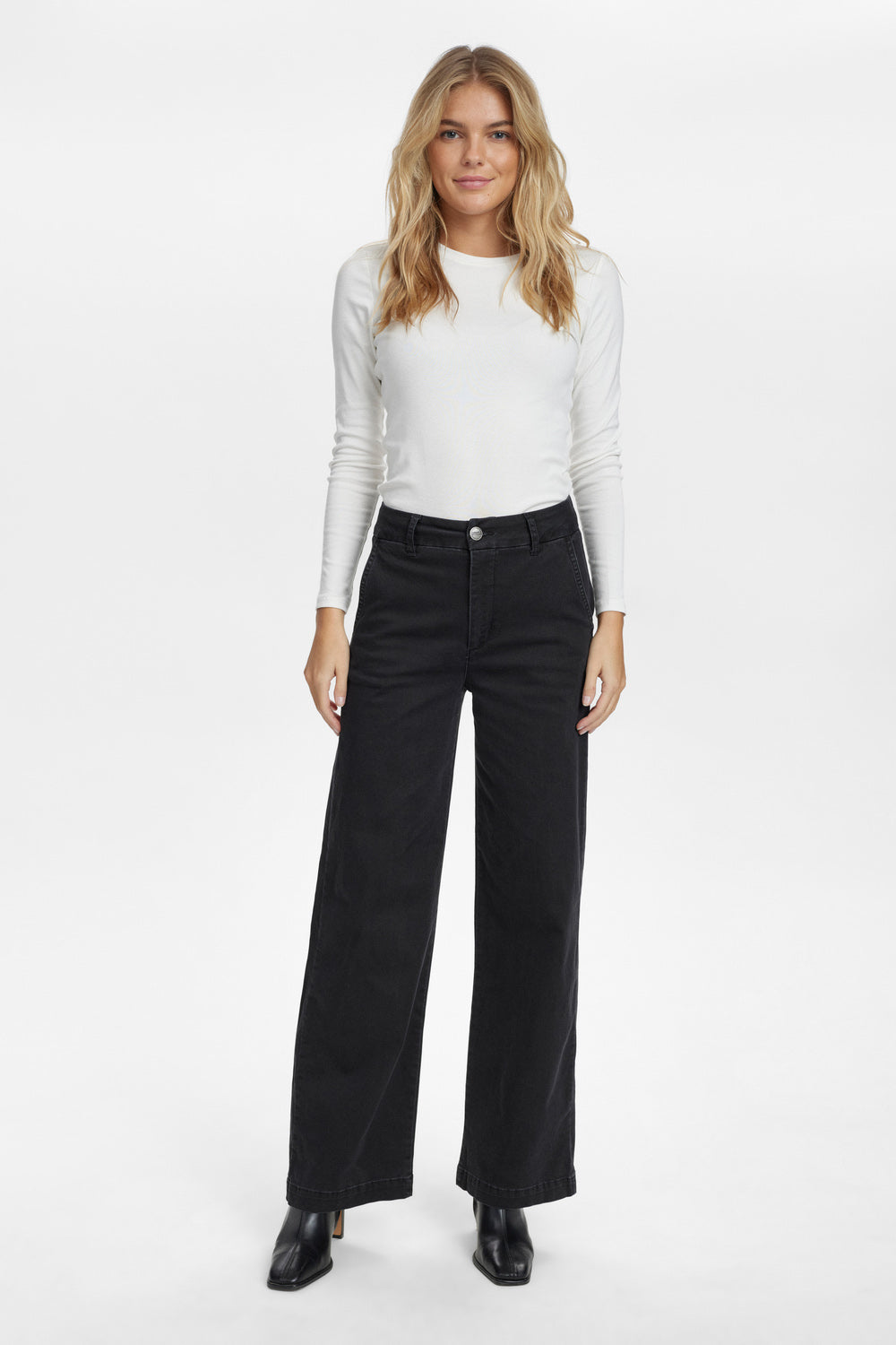 Æðislegar gallabuxur frá danska merkinu Nümph. Þær eru þröngar yfir rassinn en svo aðeins víðar og beinar í sniði. Virkilega klæðilegar og flottar. Góð teygja er í buxunum sem gerir þær svo einstaklega þægilegar