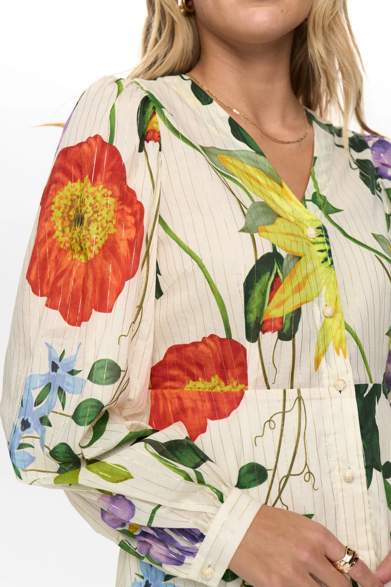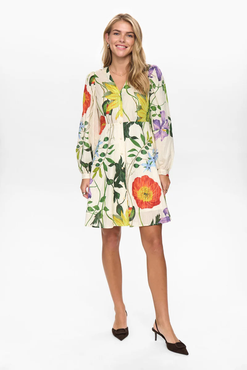 Sparilegur og skemmtilegur kjóll frá danska merkinu Nümph. Hann er með v-hálsmáli, stuttur og örlítið tekinn saman í mittinu og með lausu pilsi. Ótrúlega skemmtilegir og flottir litir og mynstur á þessum.