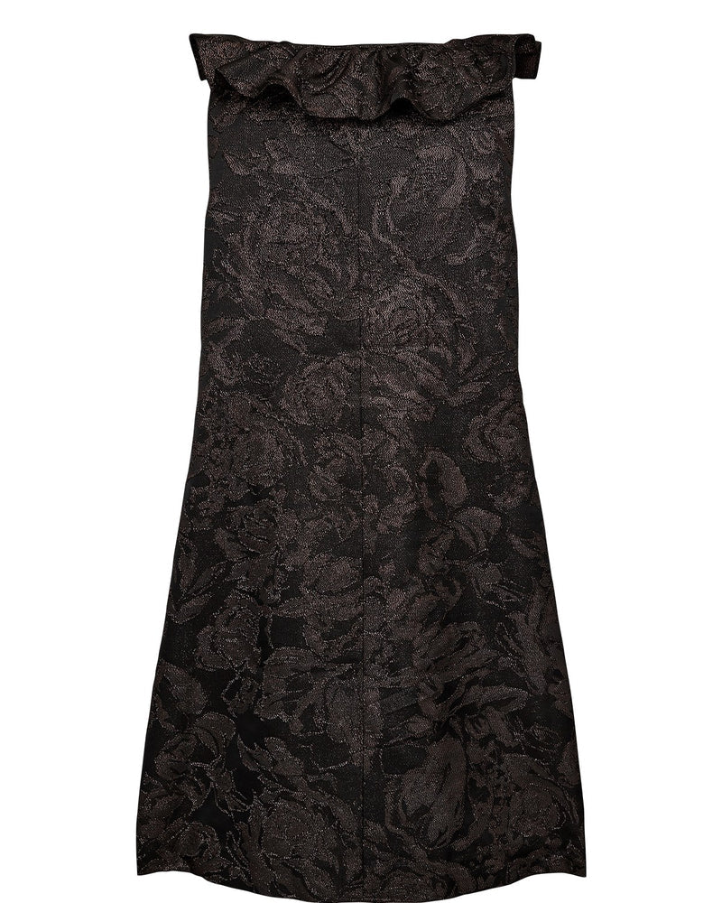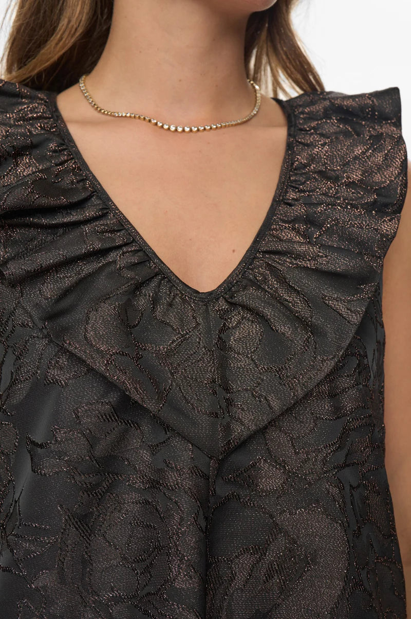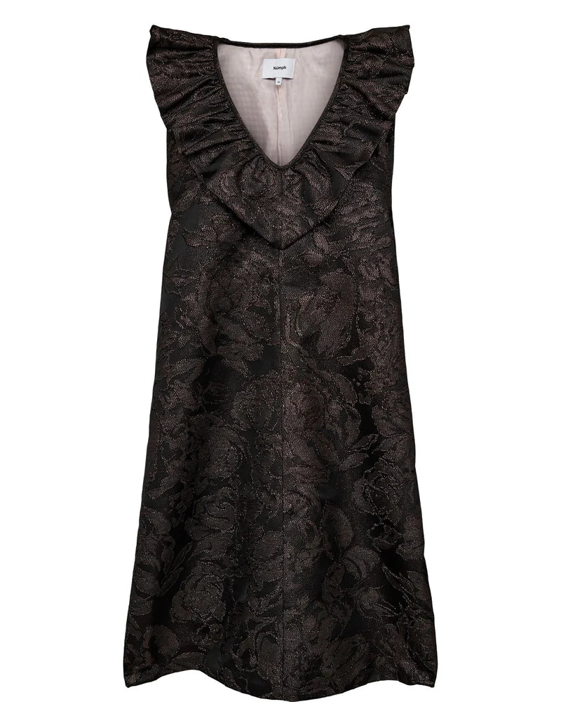 Hann er með v-hálsmáli, pífum, beinn í sniði og vösum. Dásamlega fallegt efni sem er brúnt í grunninn en er svo með brons glans þráðum