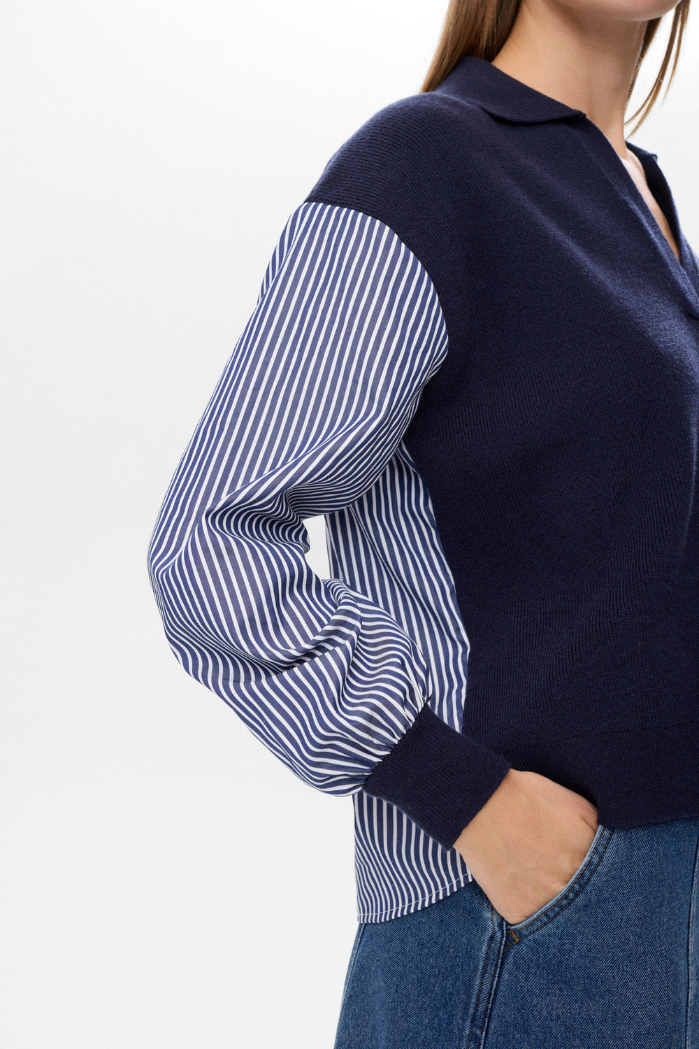 Ótrúlega skemmtileg skyrtu-peysa frá danska Nümph. Hún er bein í sniði, með v-hálsmáli, skyrtukraga og með "skyrtuermum".