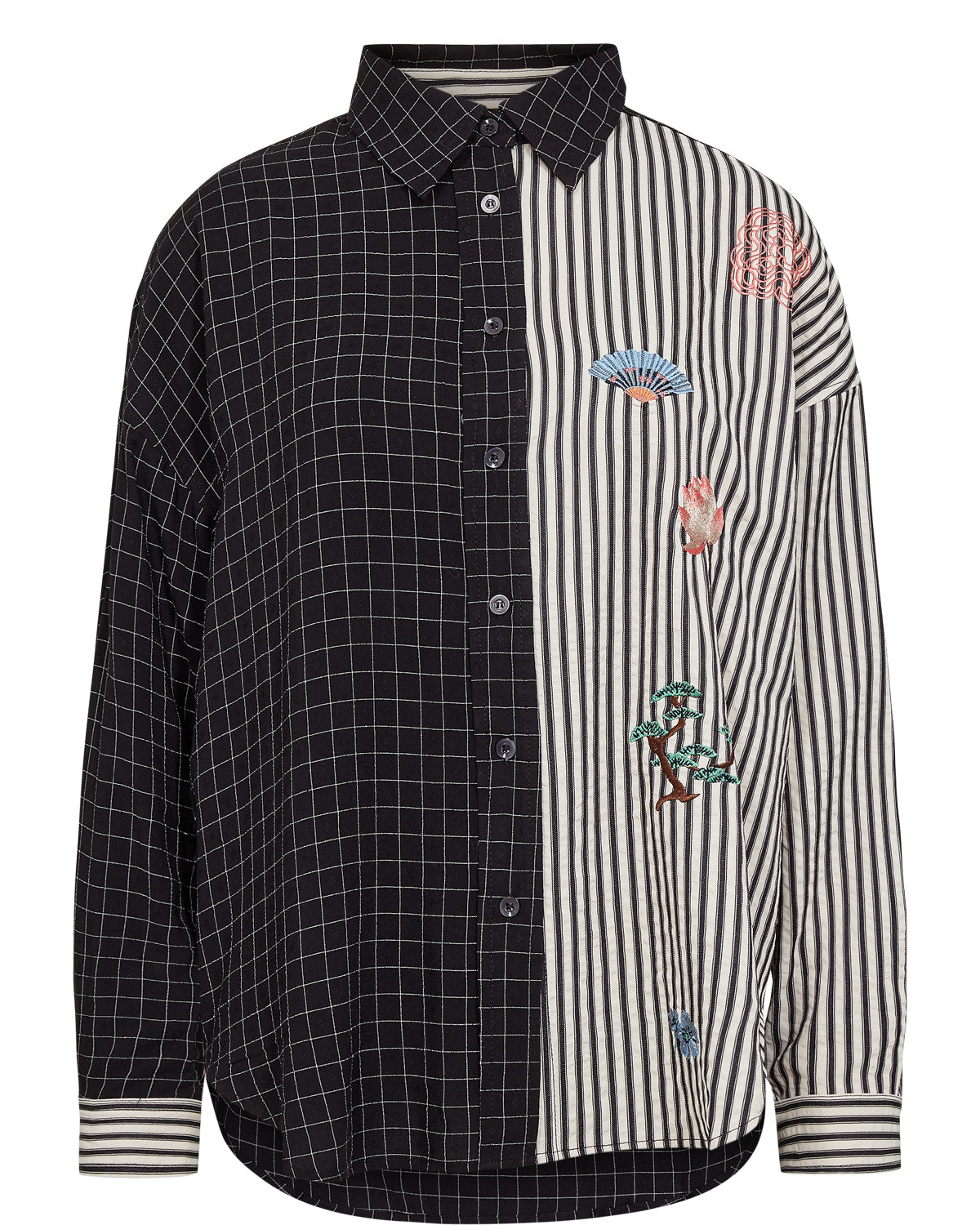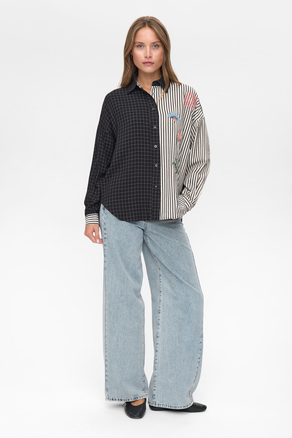 Æðisleg "loose" skyrta frá danska merkinu Nümph. Hún er bein í sniði, með skyrtukraga og víðum ermum, hneppt alla leið og er virkilega skemmtileg. Fallegur útsaumur gerir hana einstaka. Ath. þetta eru frekar stórar stærðir