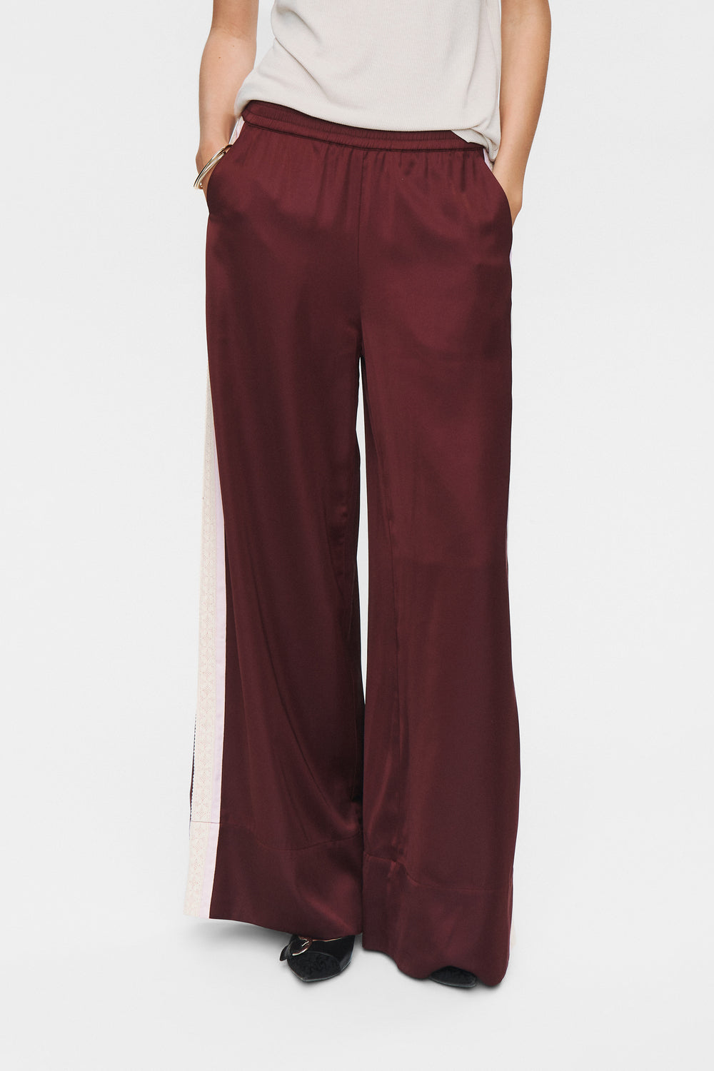 Klassískt snið, víðar og beinar og eru þær frekar síðar. Eru með teygju í mitti, vösum og blúndu rönd á hliðinni. Flottar við hæla eða strigaskó, hægt að klæða þessar fyrir ýmis tilefni. Einnig kemur skyrta í stíl, ekkert smá flott saman.