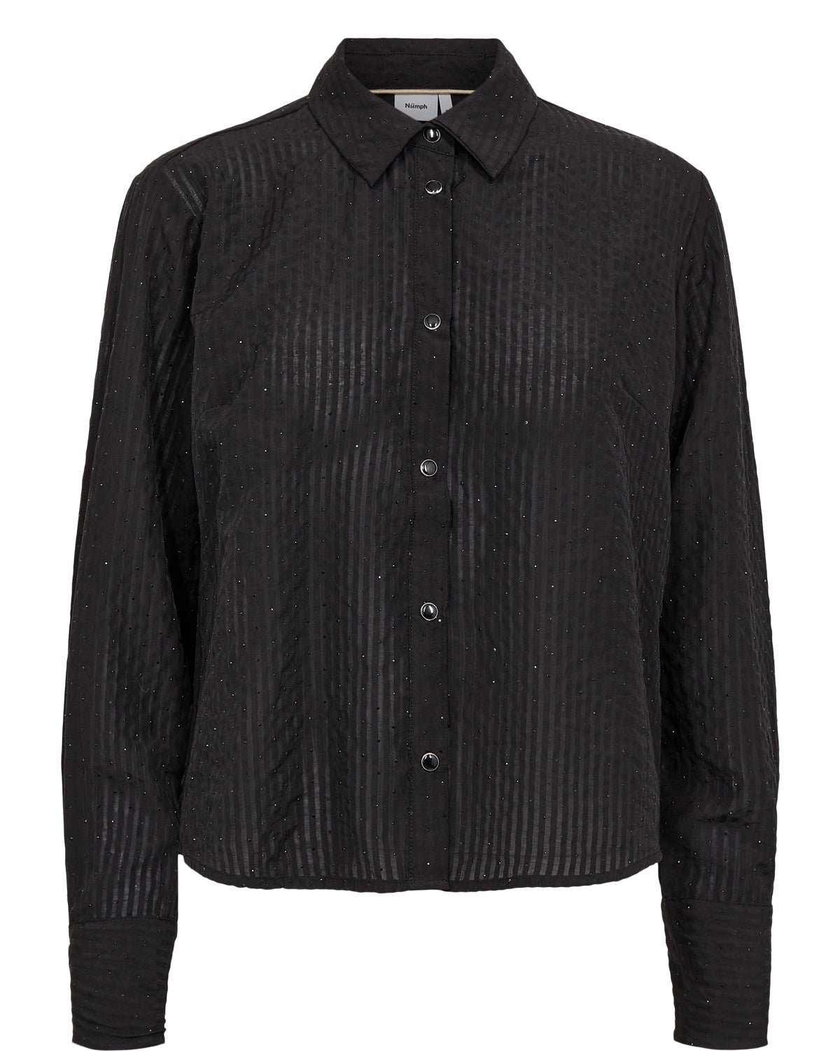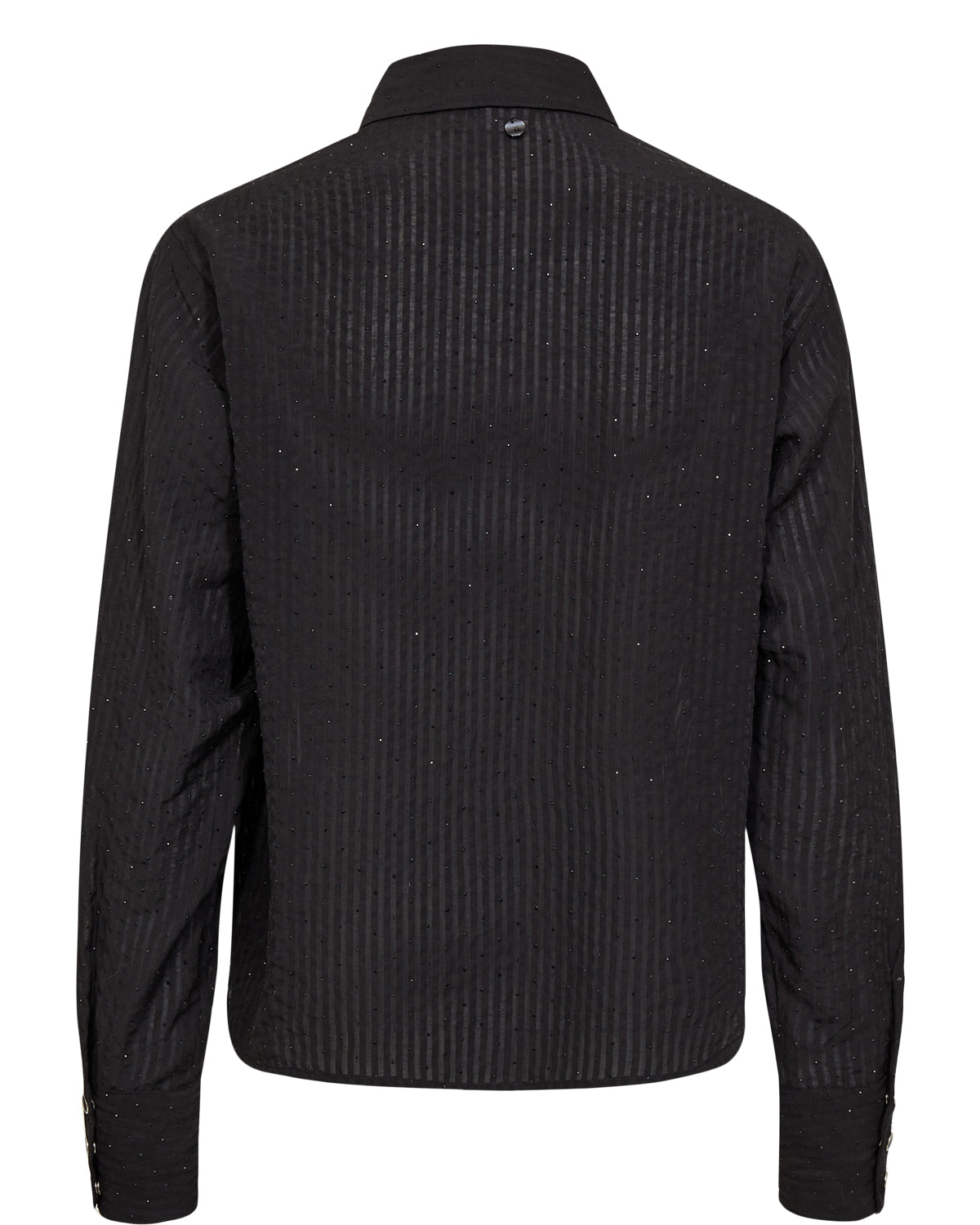 Blússan er hneppt alla leið, með skyrtukraga og með síðum ermum. Skyrtan er létt og lipur og með glimmeri í.