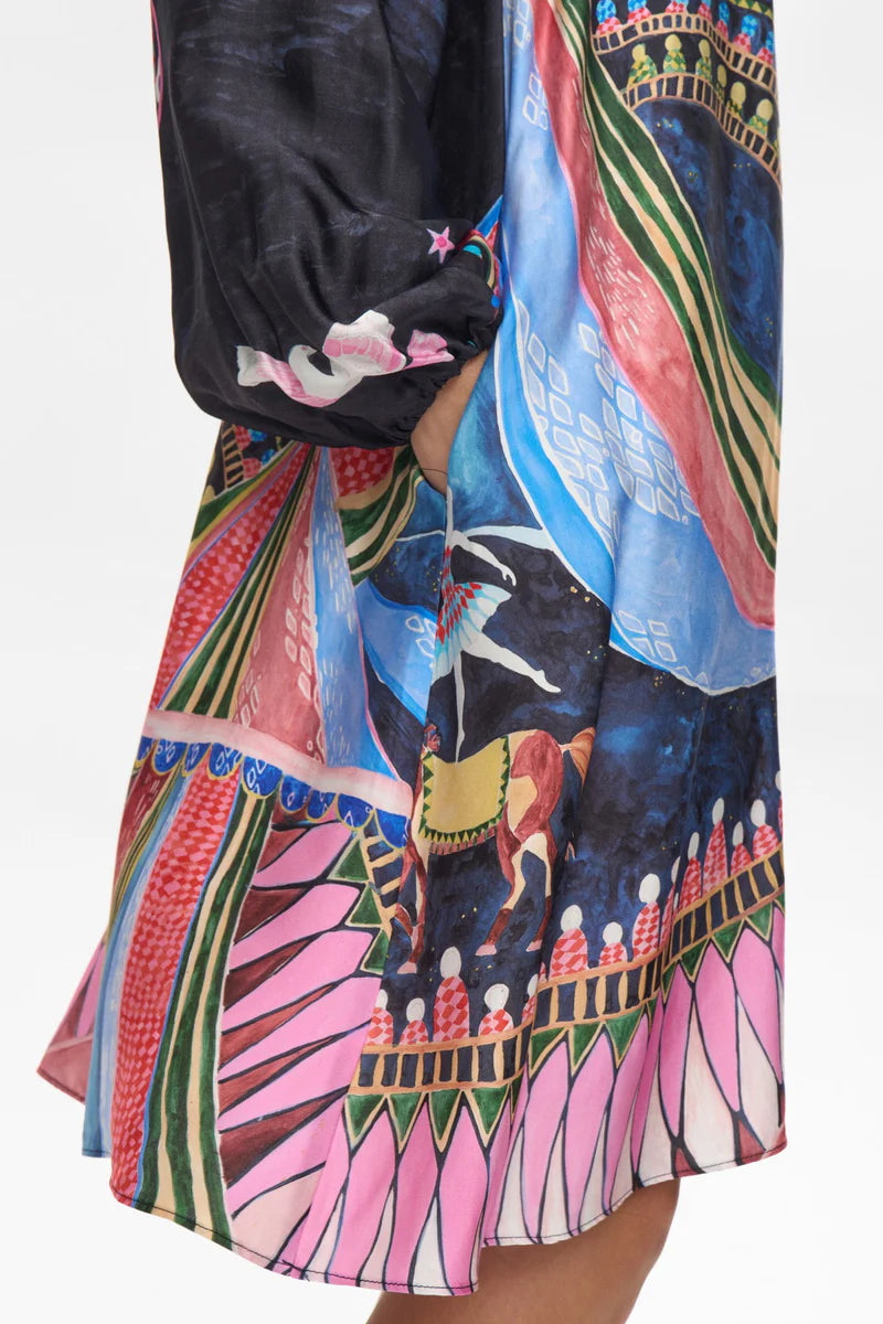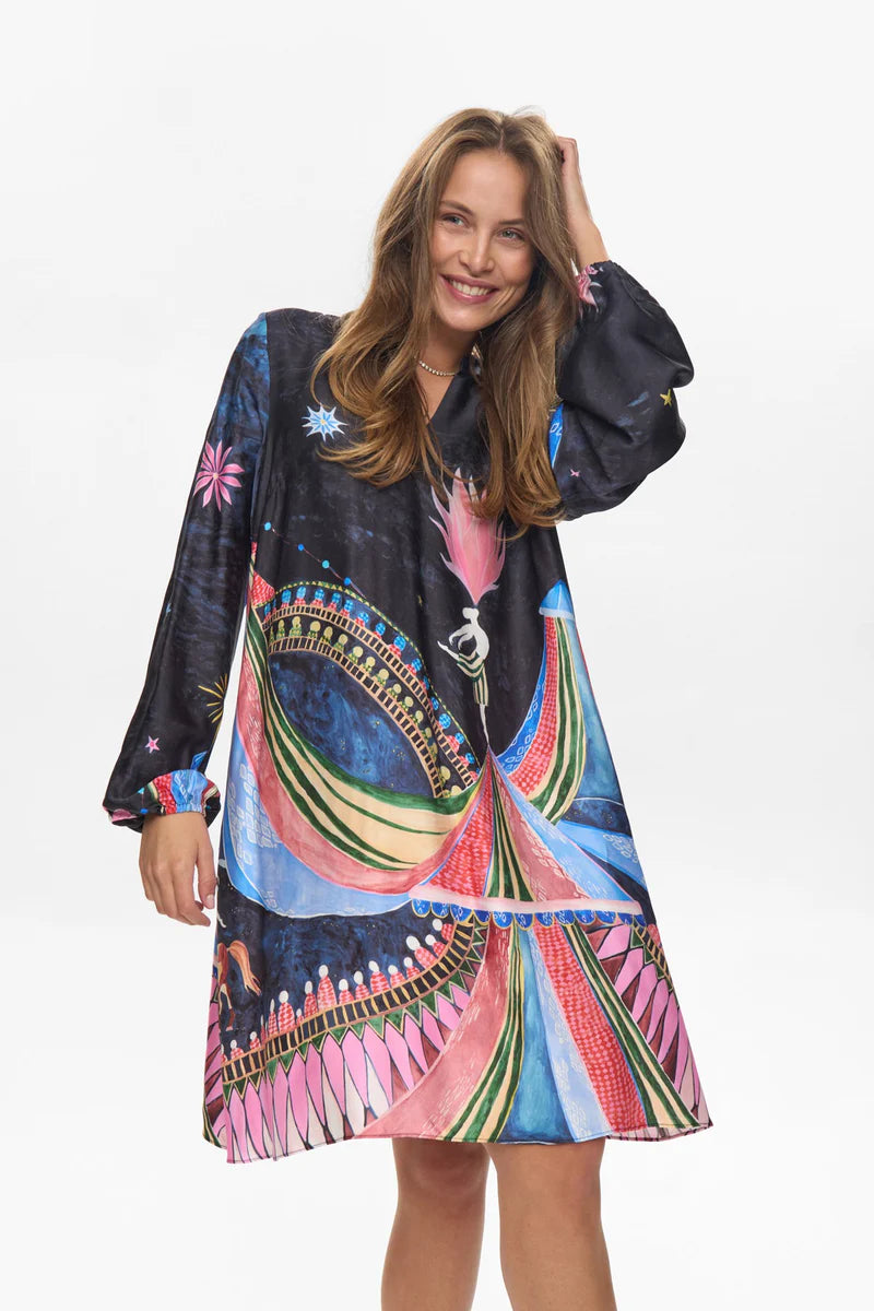 Sparilegur og skemmtilegur kjóll frá danska merkinu Nümph. Hann er með v-hálsmáli, laus í sniði og með vösum, sem við elskum! Ótrúlega skemmtilegir og flottir litir og mynstur á þessum. Áferðin á kjólnum er silkikennd