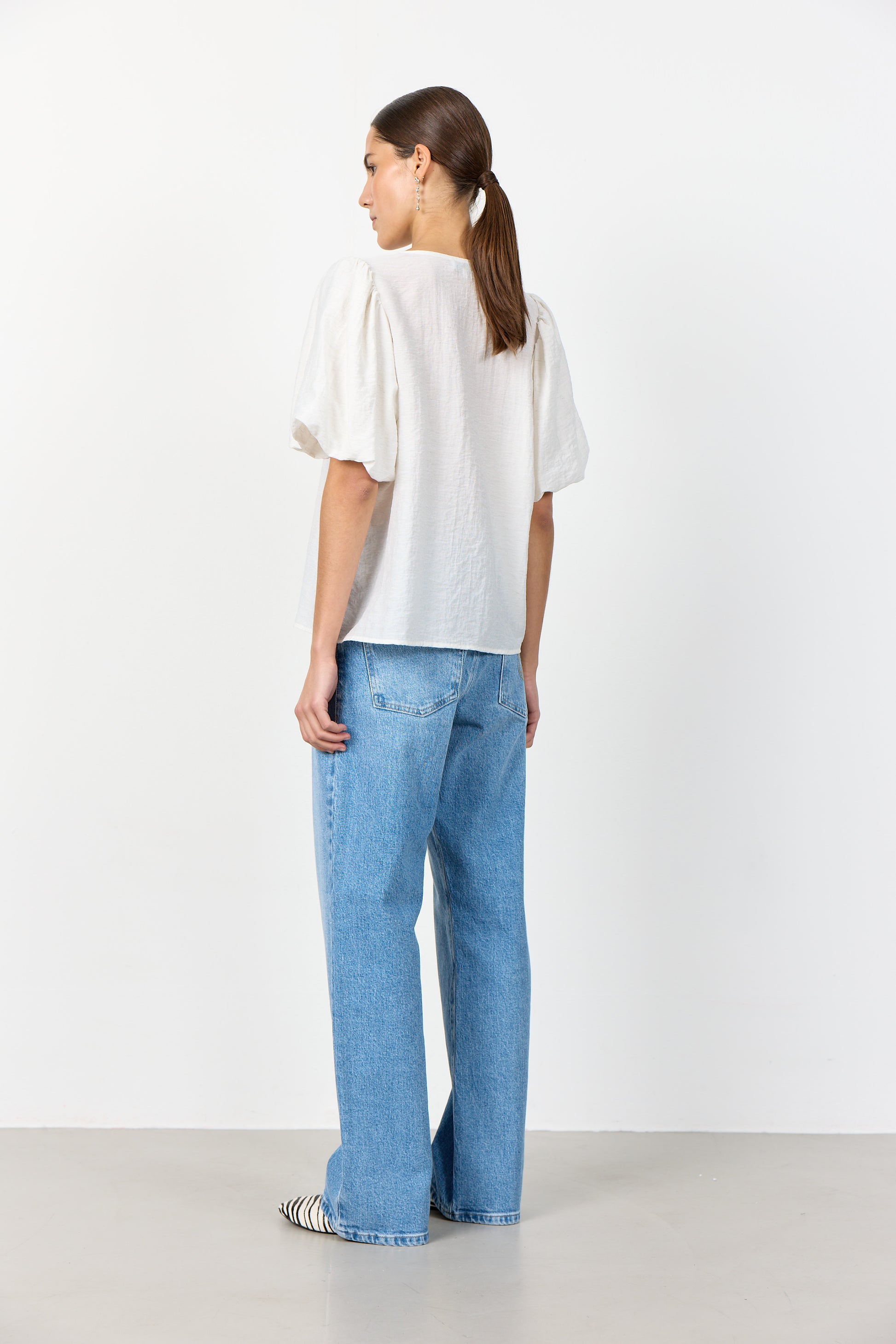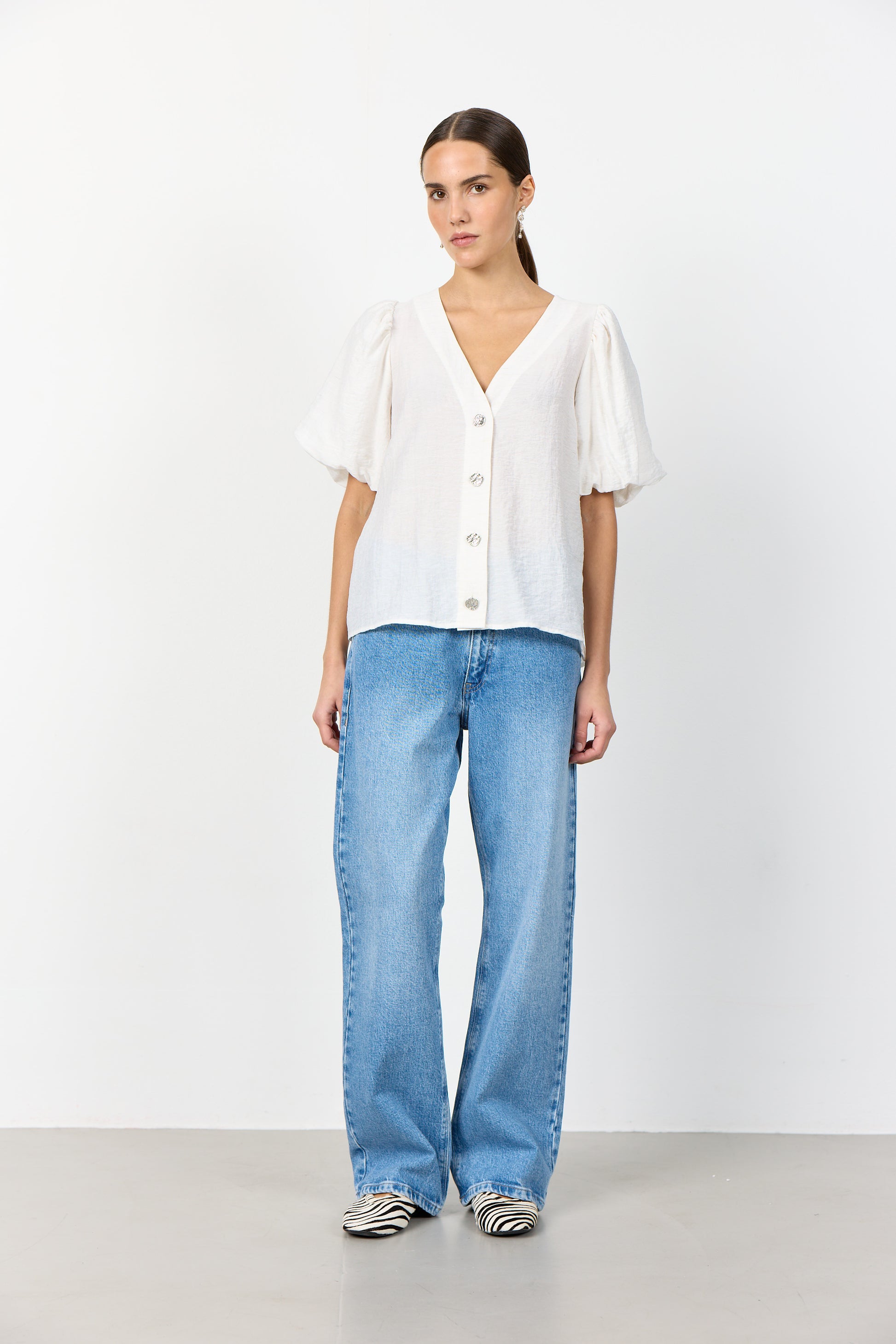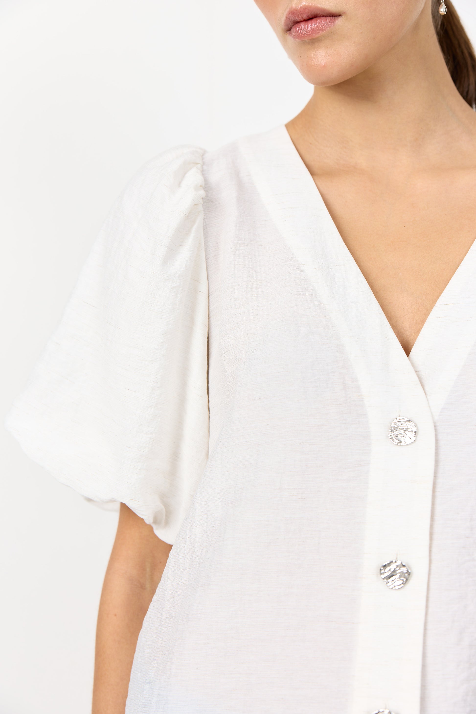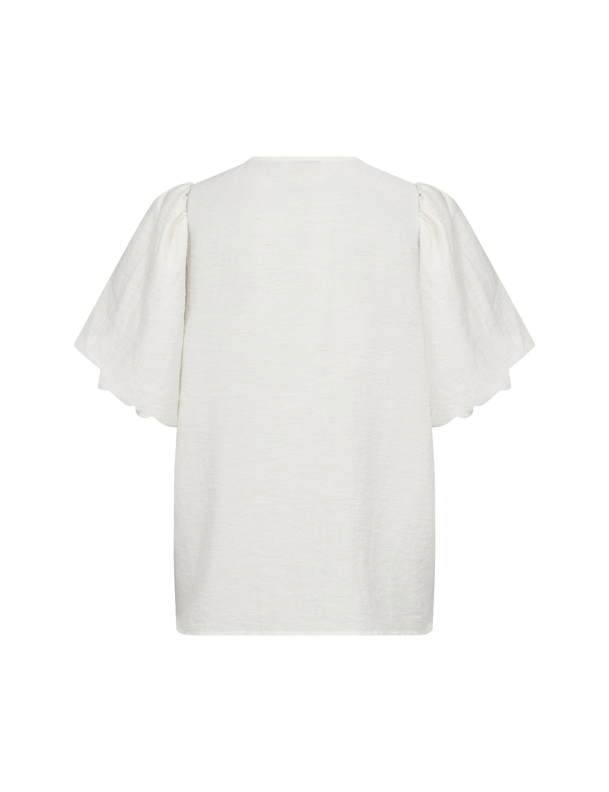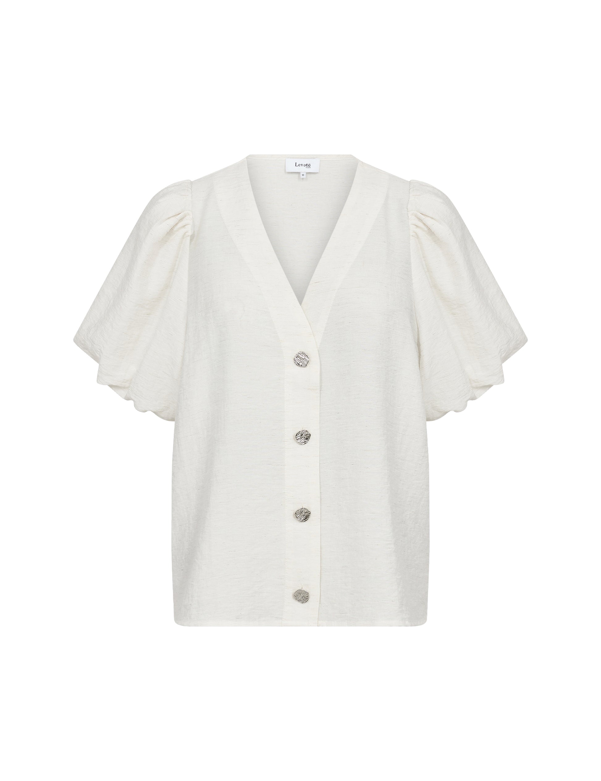 Falleg og klassísk blússa frá danska merkinu Levete Room. Hún er með V-hálsmáli, hneppt alla leið að framan með fallegum tölum, með stuttum ermum sem eru teknar saman og fallegum pífum sem gefa henni létt og fallegt flæði.