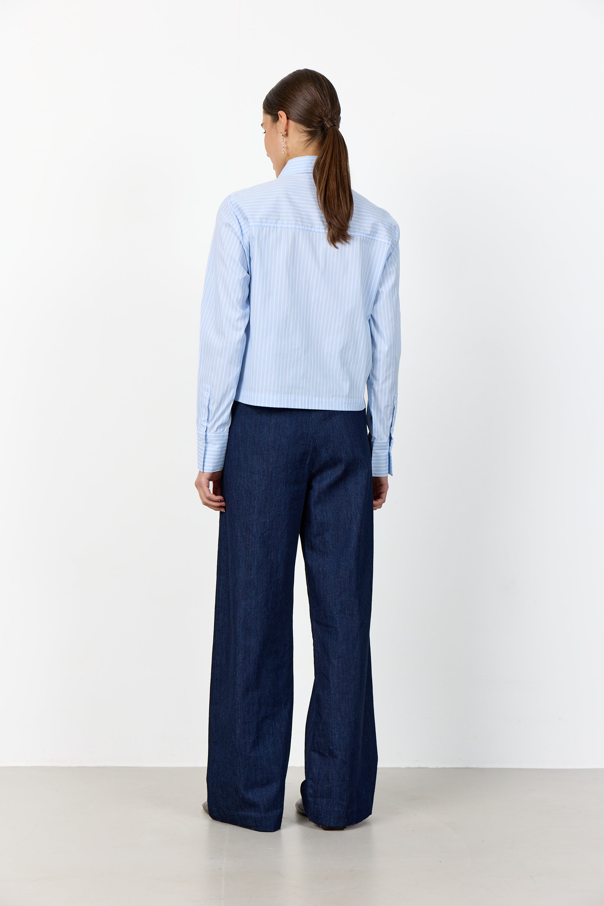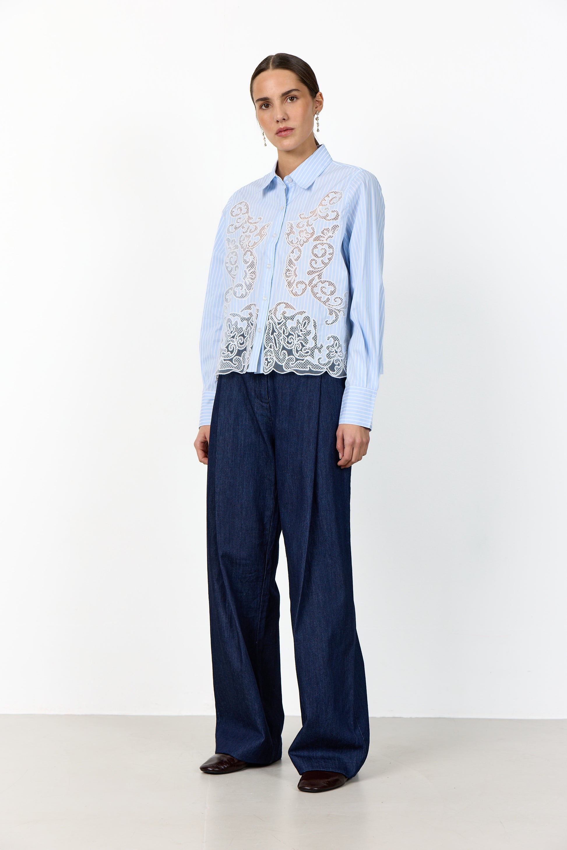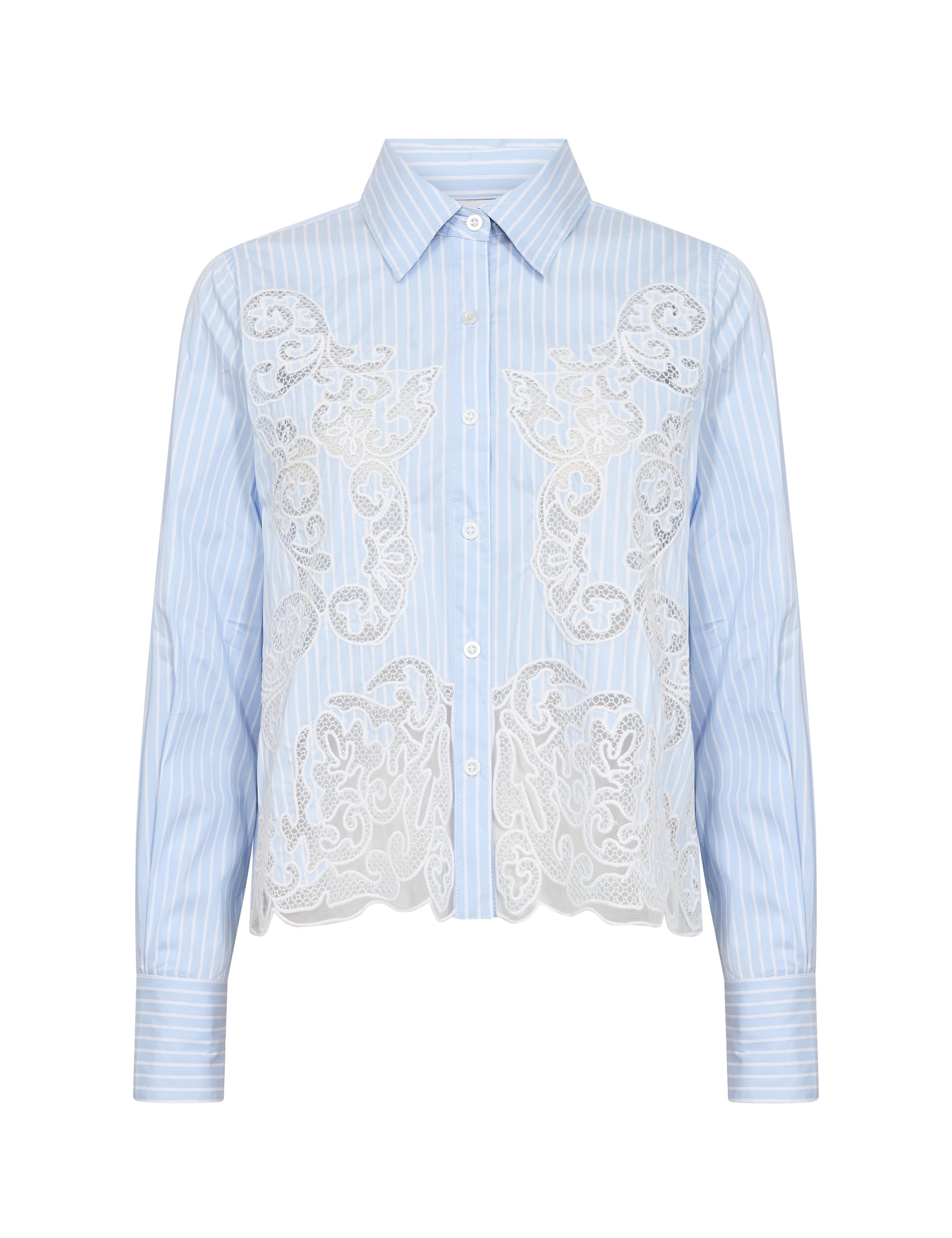 Elegant og sparileg síðerma blússa frá danska merkinu Levete Room. Hún er með skyrtukraga, hneppt alla leið og blúndu að framan sem gera hana extra sparilgea.