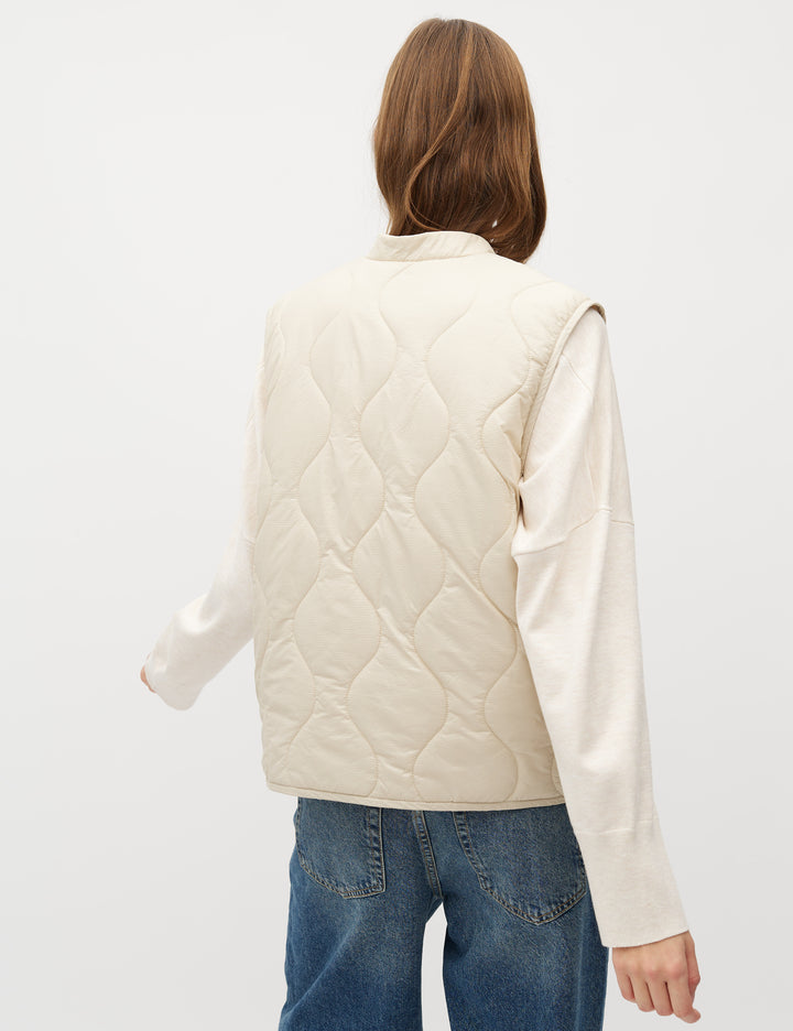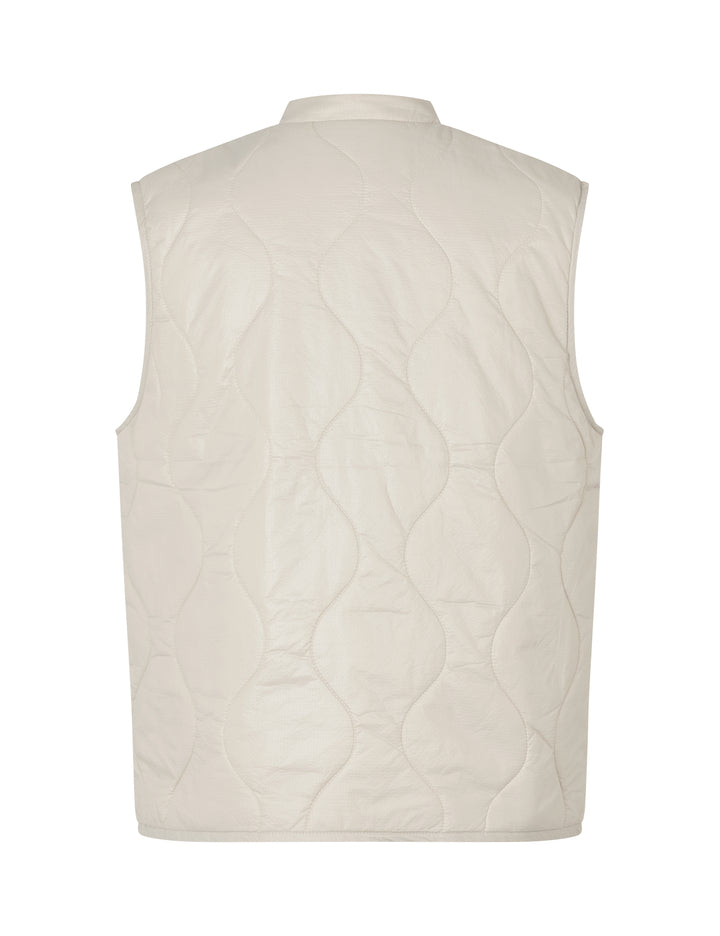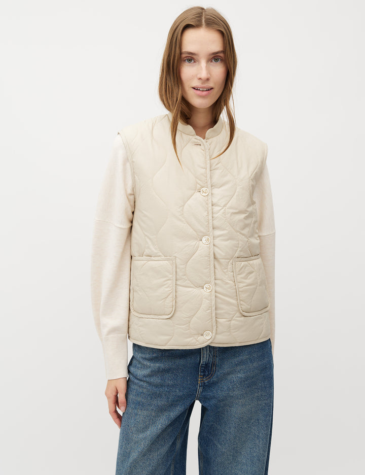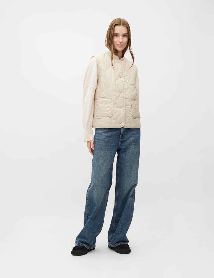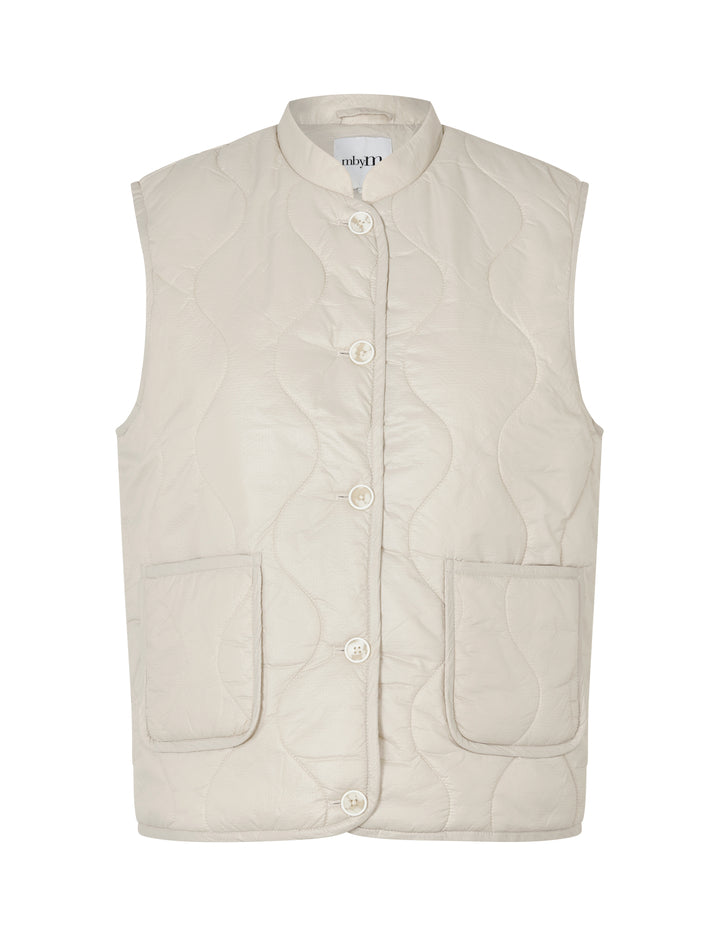 Létt og lipurt, vatterað vesti frá danska Mbym. Beint en aðeins vítt snið. Hneppt að framan og eru vasar á vestinu.